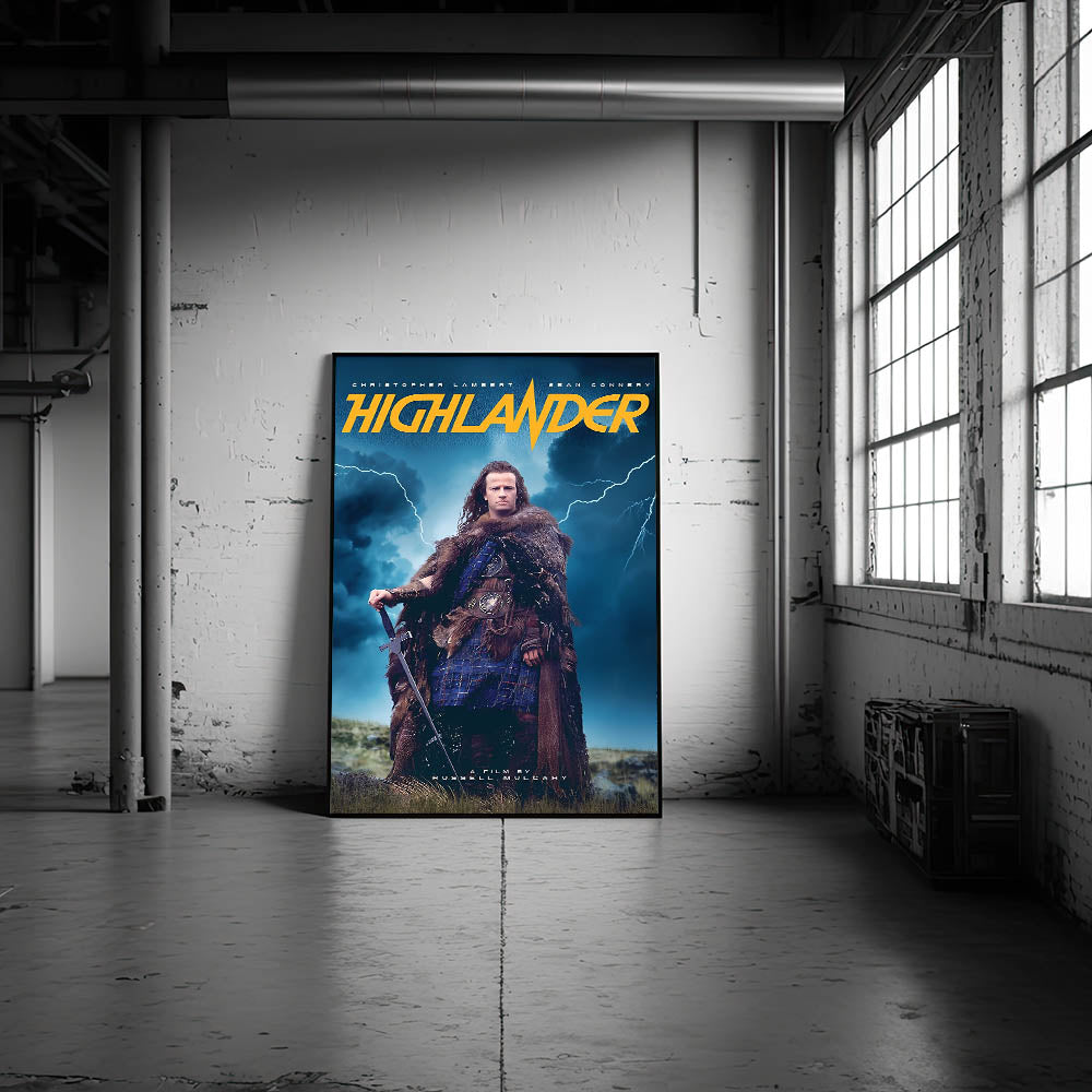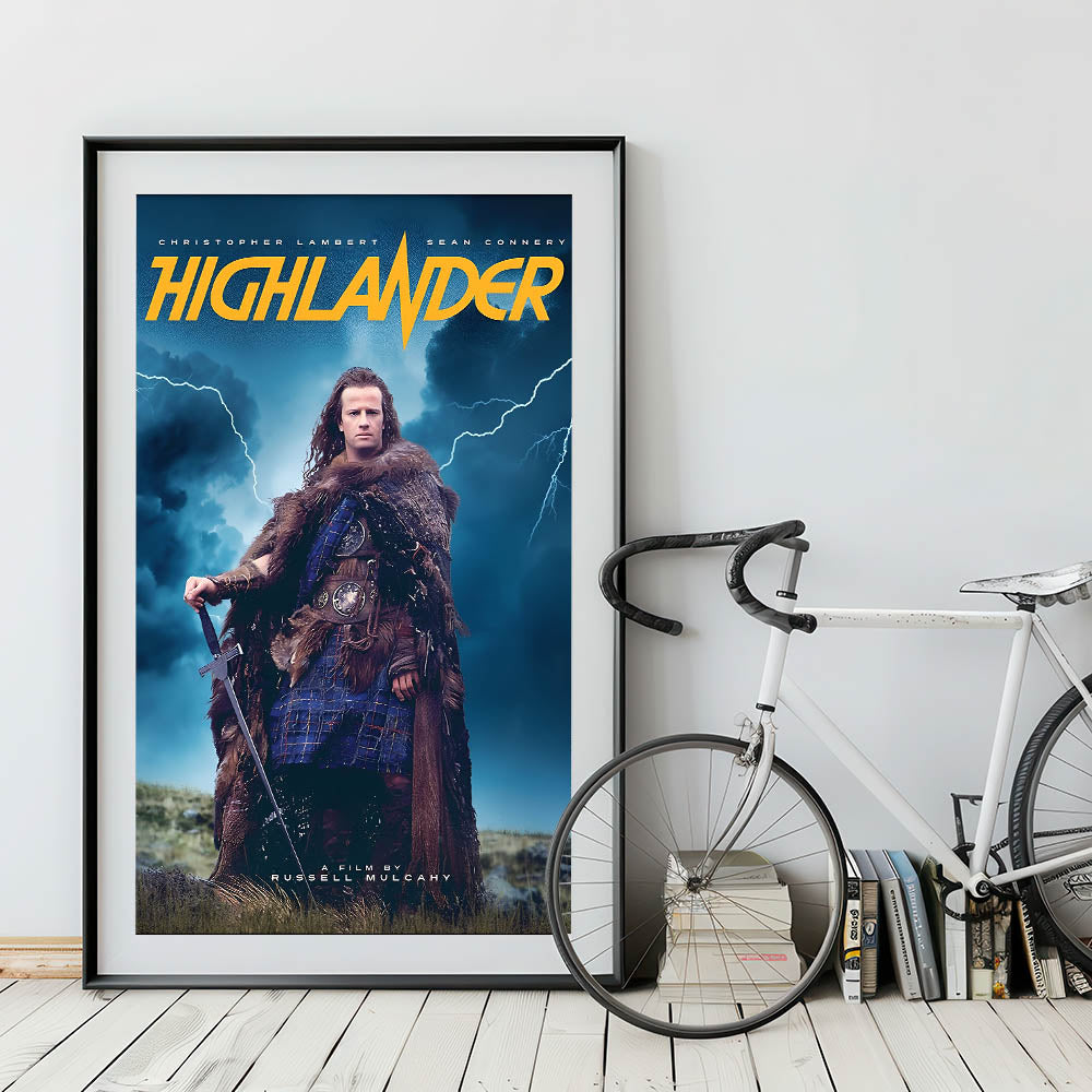 Transport yourself into the legendary world of Highlander with this retro movie poster art. Featuring the iconic image of Connor MacLeod standing tall amidst the storm, this vintage design captures the epic battle of immortals. Known for its thrilling storyline and timeless action, this retro aesthetic print is perfect for fans of fantasy and classic action films.