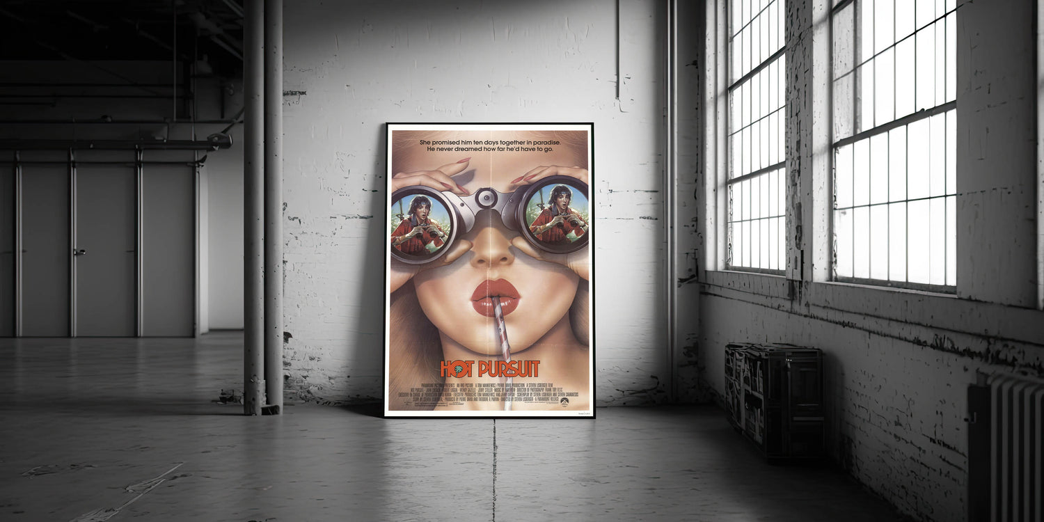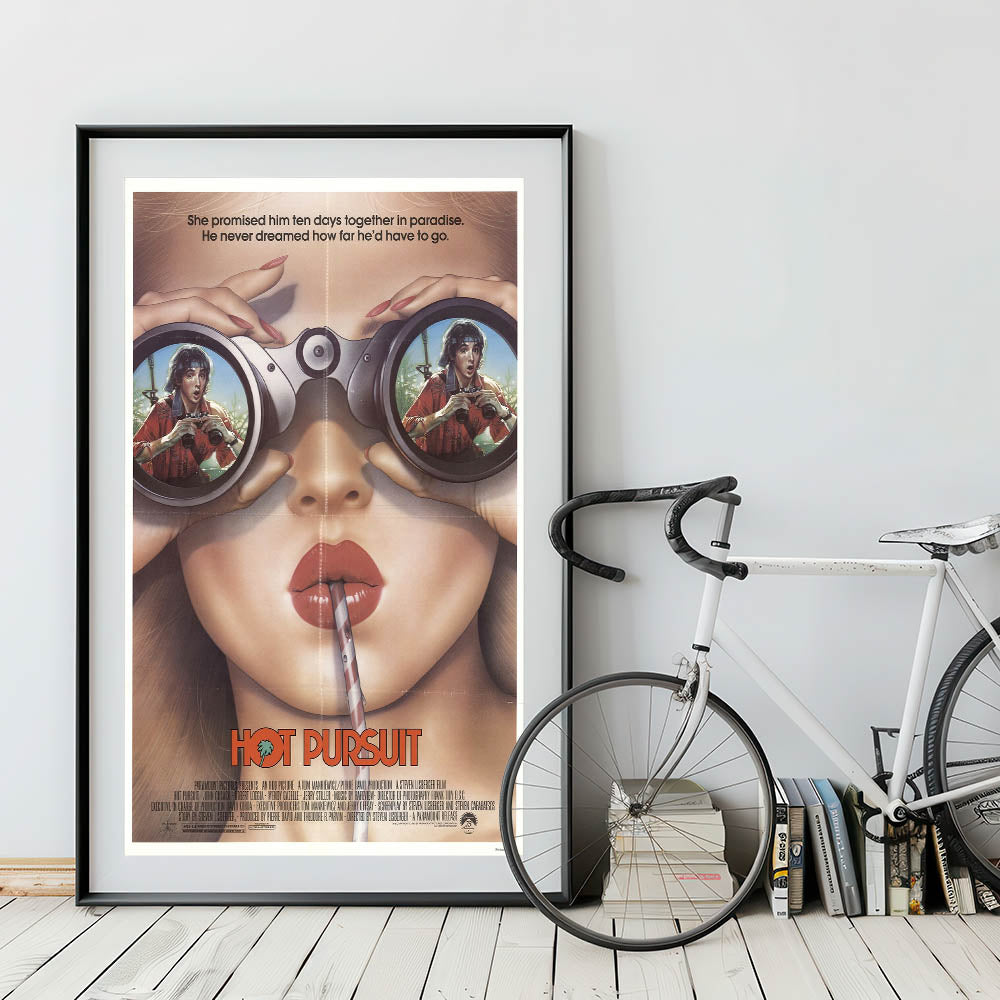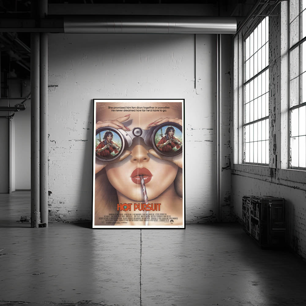 Step into the comedic adventure of Hot Pursuit with this retro movie poster art. Featuring the playful imagery of the binoculars scene, this vintage design perfectly captures the lighthearted and fun vibe of the 80s comedy film. With its bold and quirky visuals, this print will bring a playful touch to any room.