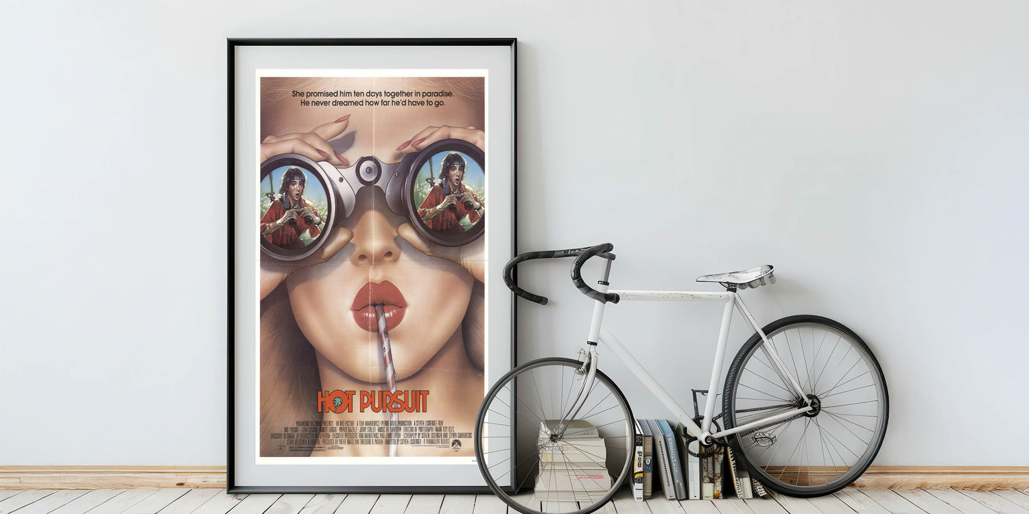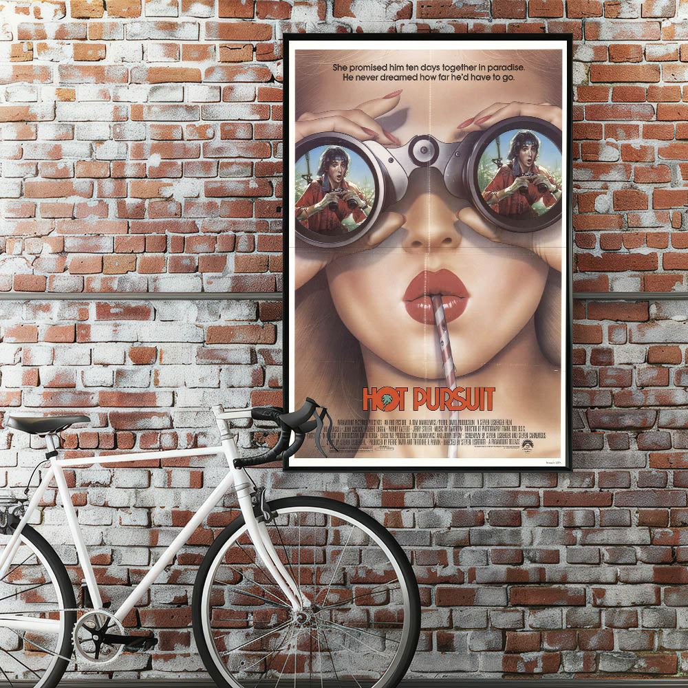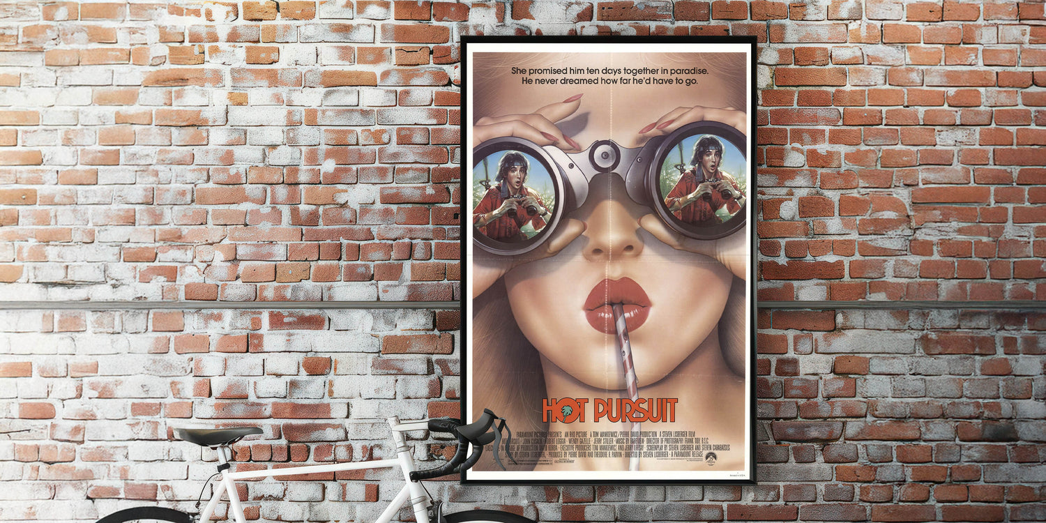Step into the comedic adventure of Hot Pursuit with this retro movie poster art. Featuring the playful imagery of the binoculars scene, this vintage design perfectly captures the lighthearted and fun vibe of the 80s comedy film. With its bold and quirky visuals, this print will bring a playful touch to any room.