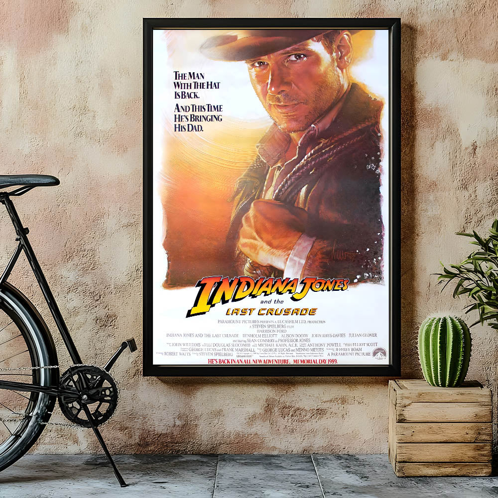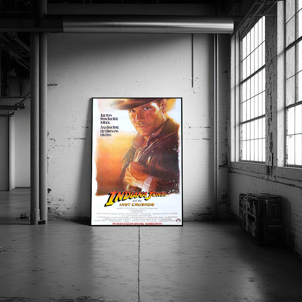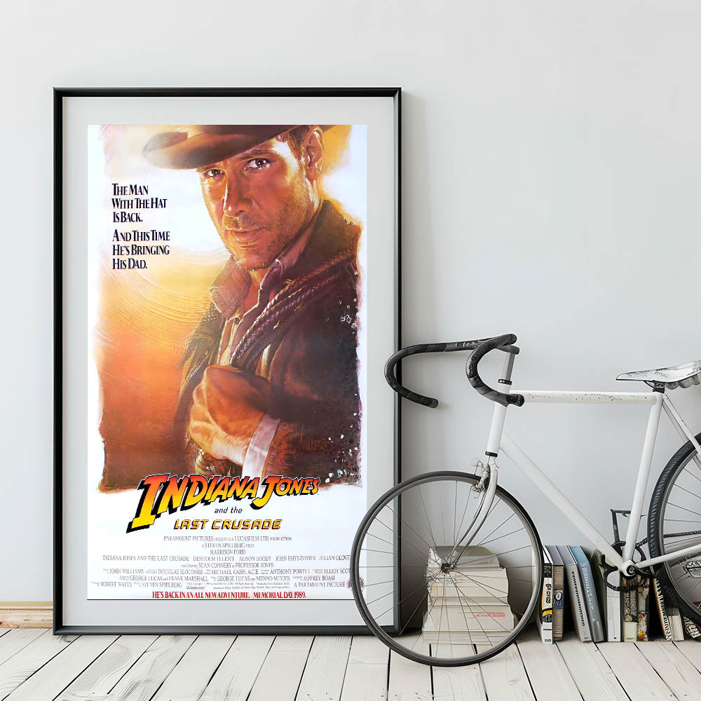 Step into the thrilling world of Indiana Jones and the Last Crusade with this iconic retro movie poster art. Featuring Indiana Jones in his classic fedora and leather jacket, this design highlights the adventure, mystery, and father-son bond that defined the film. With its vibrant colors and bold visuals, this vintage print is a must-have for fans of the Indiana Jones franchise.