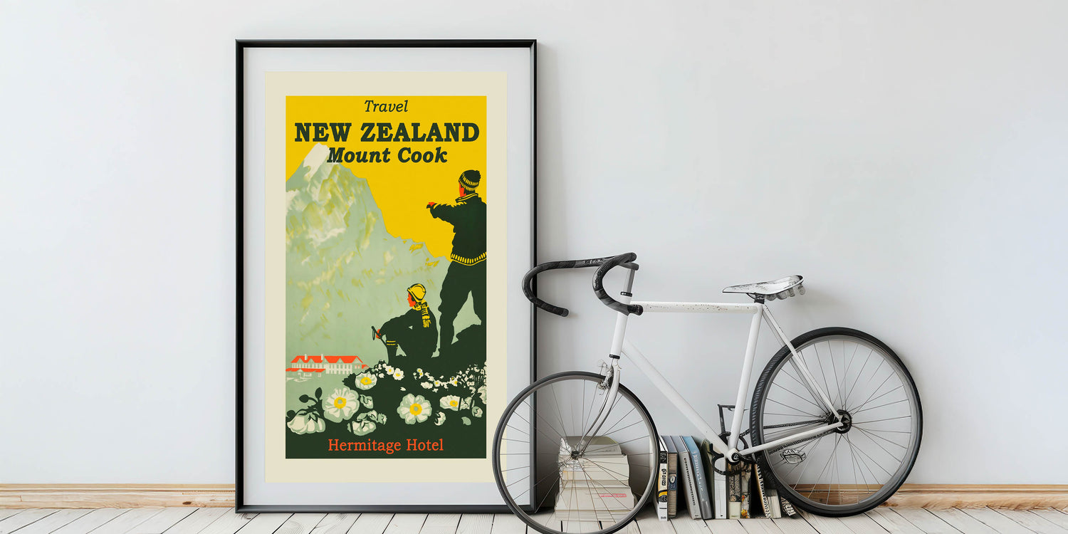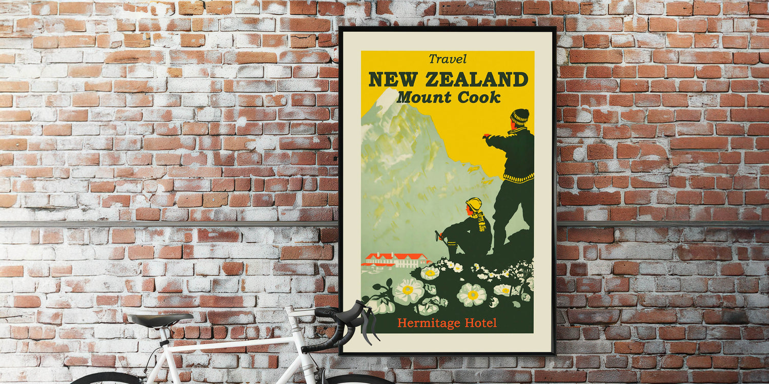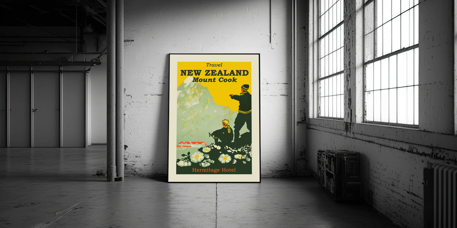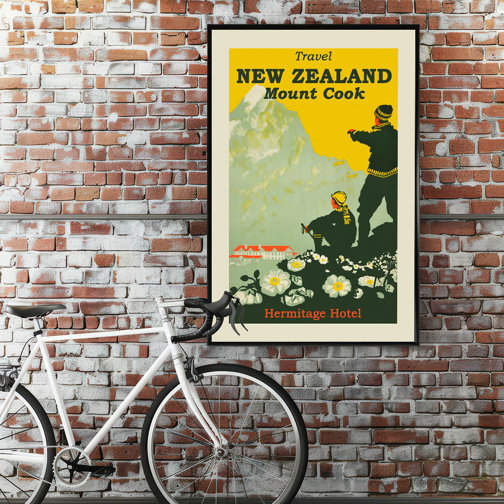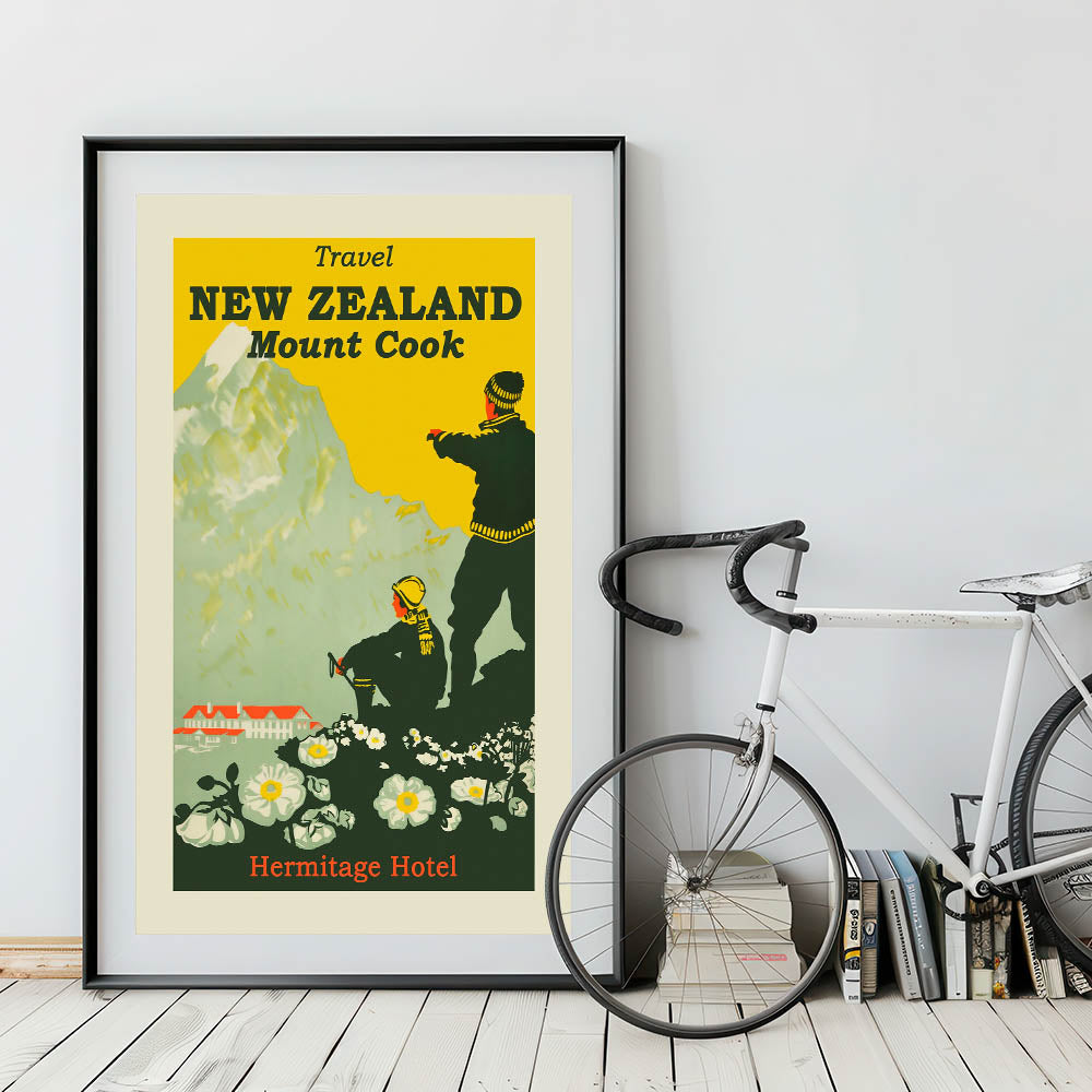 Whether you’re drawn to New Zealand’s alpine beauty, an adventurer at heart, or a fan of mid-century travel posters, this retro wall art brings the grandeur of Mount Cook into your home.