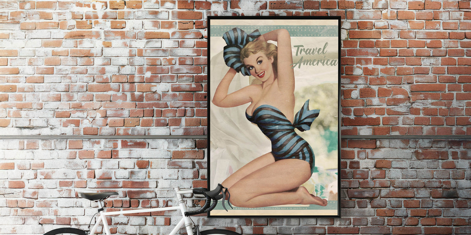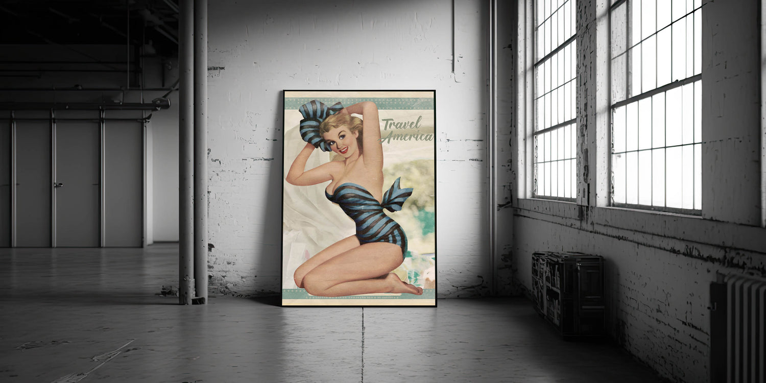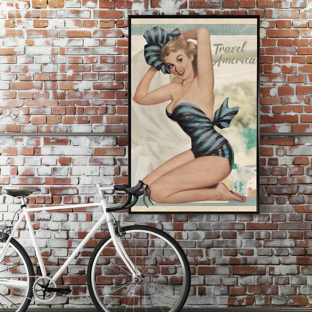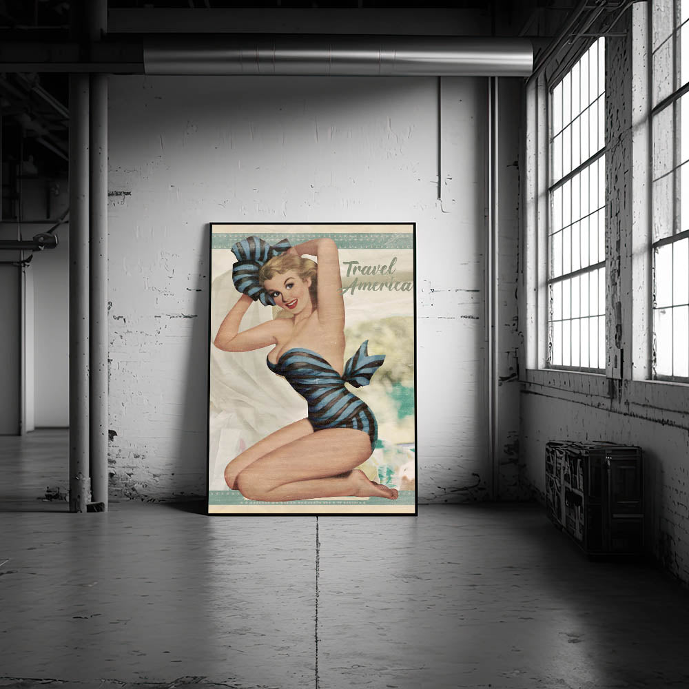 Step back in time with this retro-inspired "Travel America" poster featuring a charming pin-up girl in a classic striped swimsuit. Capturing the playful and nostalgic spirit of mid-century American travel ads, this vintage print is a perfect blend of charm and style. The soft pastels and faded textures add an authentic aged look, making it ideal for any retro aesthetic or vintage decor. Whether displayed in a living room, bedroom, or home bar, this poster brings a touch of classic retro style and Americana to your space.