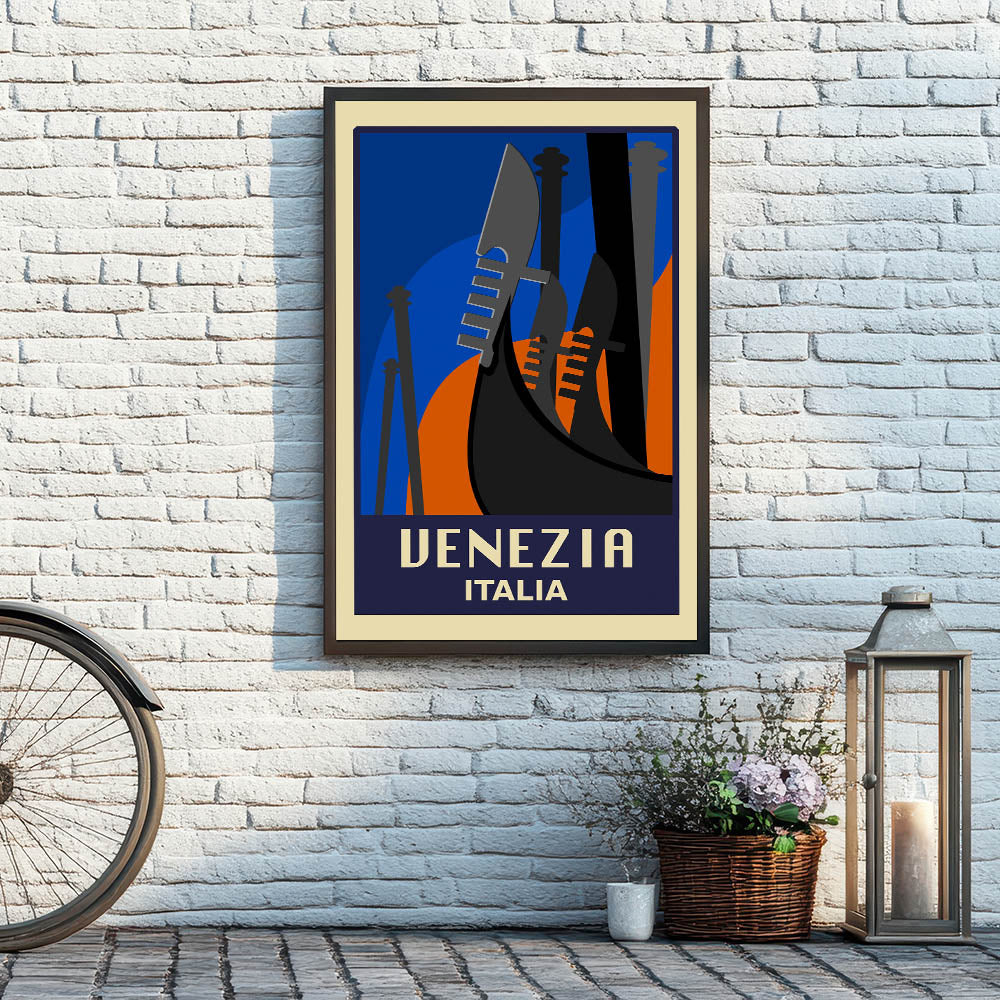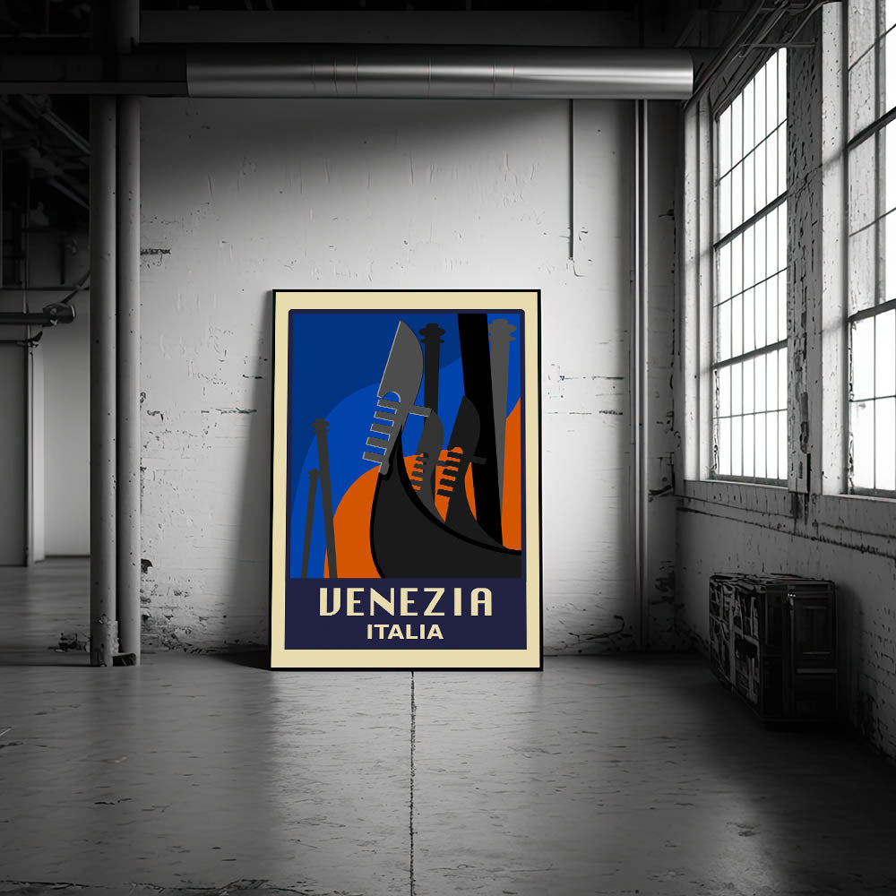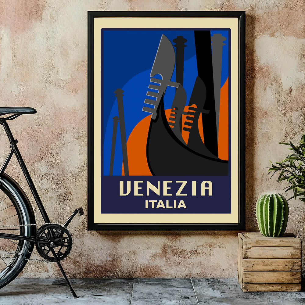Whether you're a fan of Venetian culture or simply appreciate vintage travel artwork, this poster adds a distinctive touch to your space. Its minimalist design and striking colors bring a modern flair to classic Italian beauty.