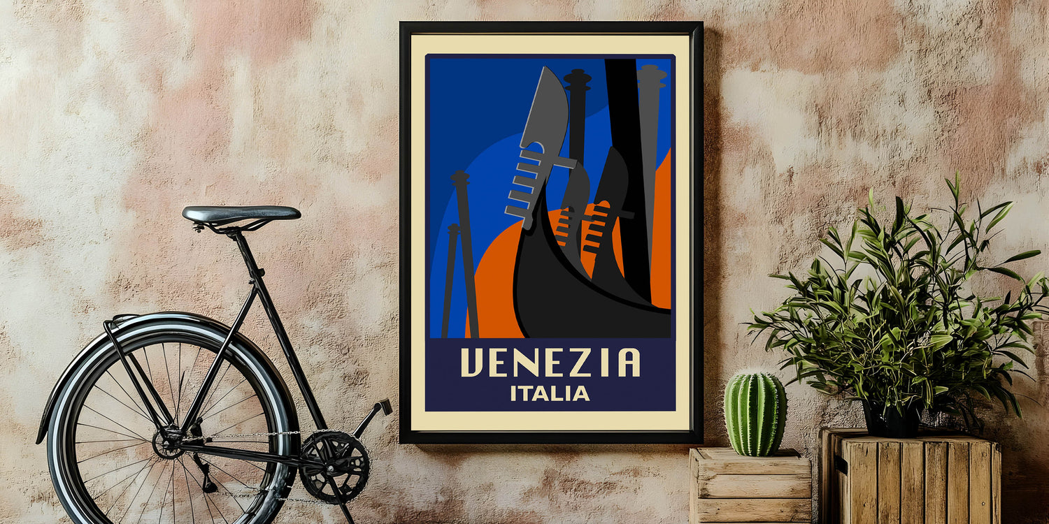 Immerse yourself in the timeless charm of Venice with this Retro Venice Travel Poster. Featuring an artistic representation of iconic Venetian gondolas against a bold and vibrant backdrop, this vintage-style poster captures the essence of Italy’s most famous city. The deep blues and oranges bring out the elegance and serenity of the canals, making it a perfect piece for any lover of Italy, vintage art, or unique travel posters.