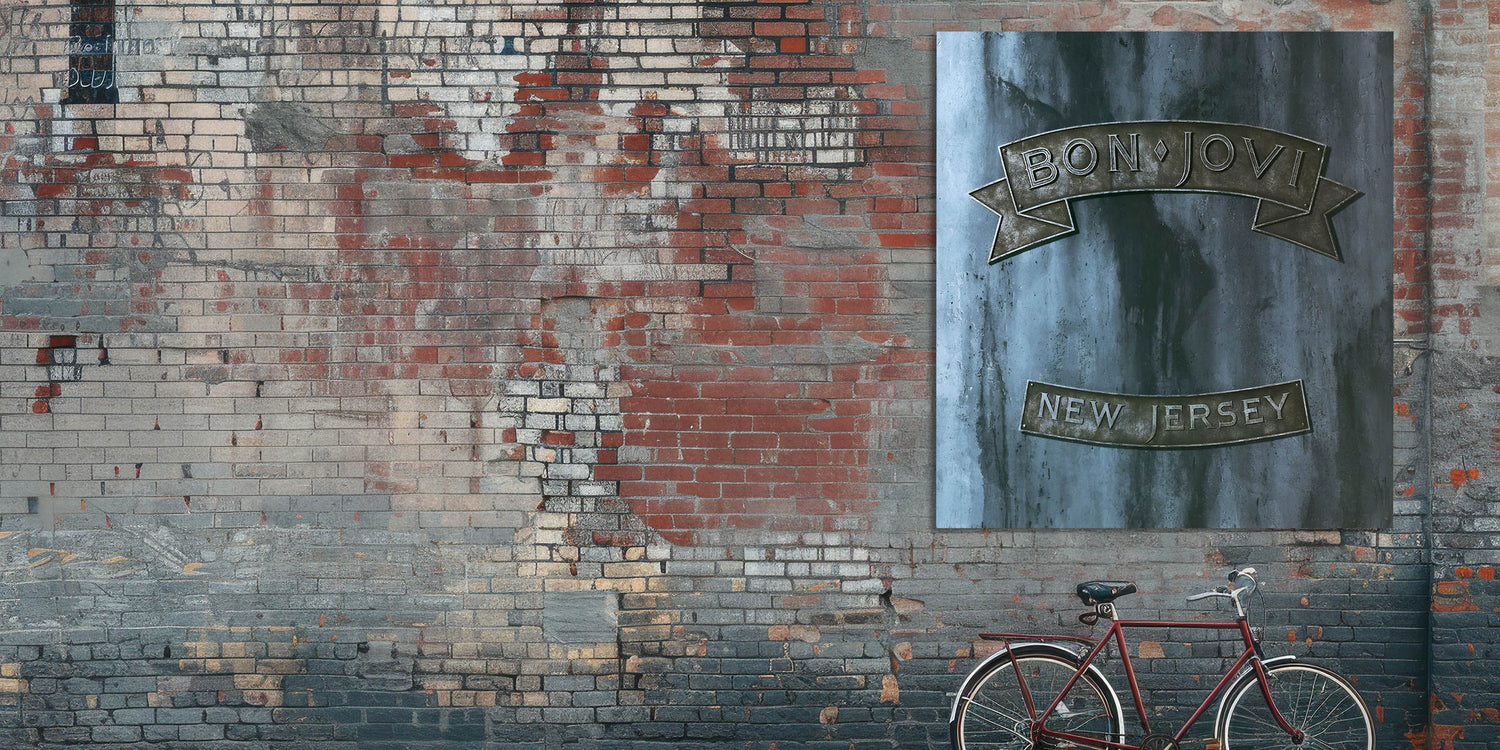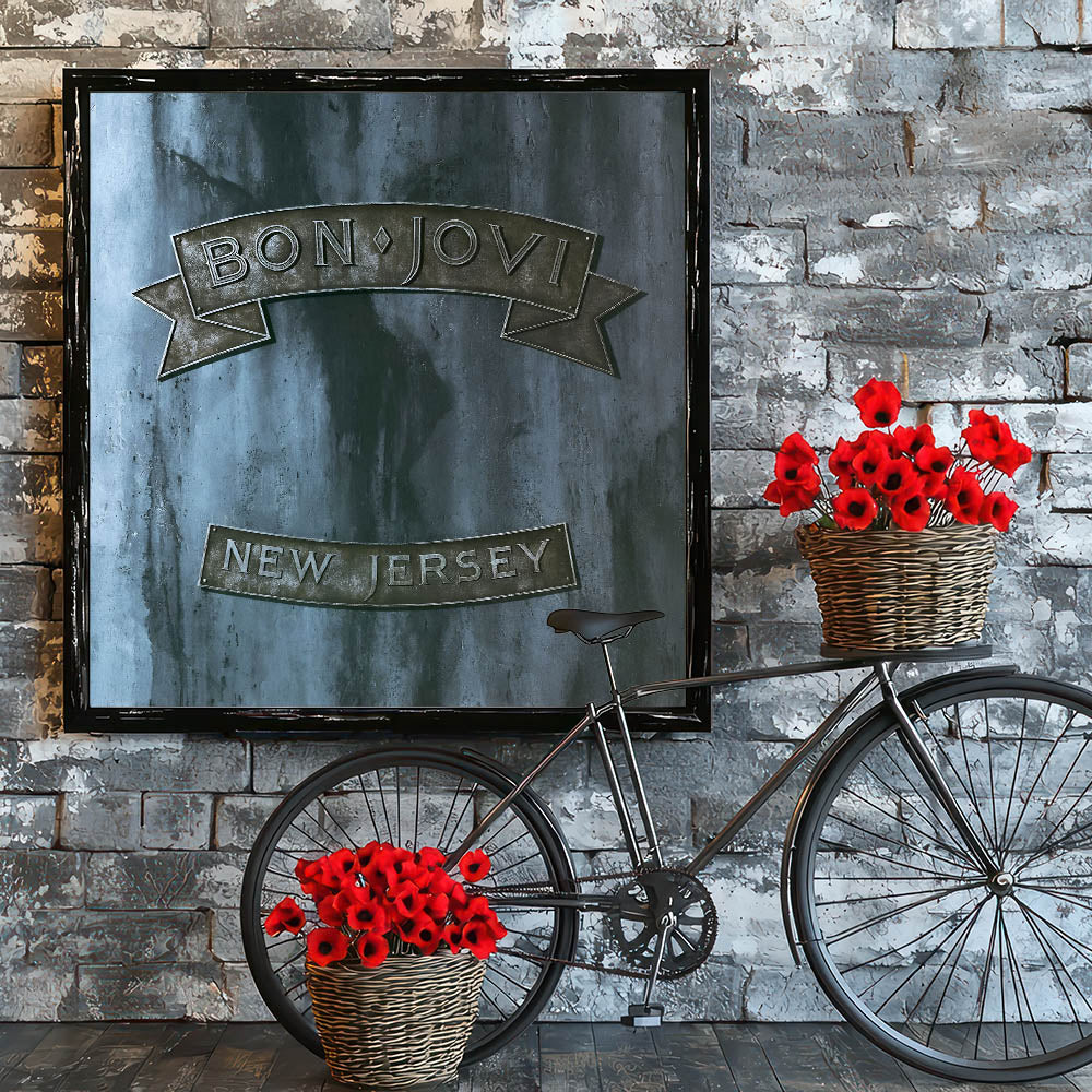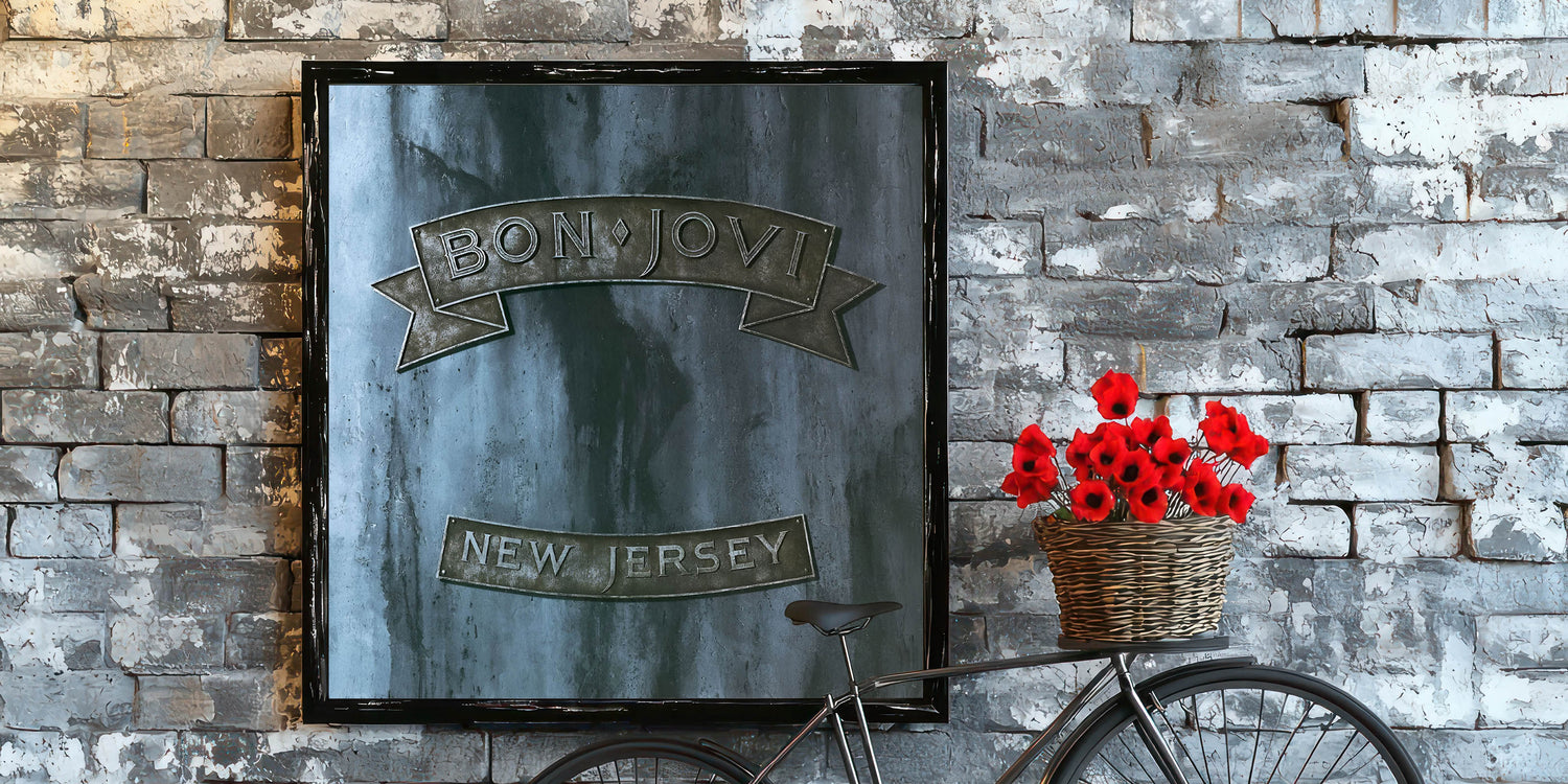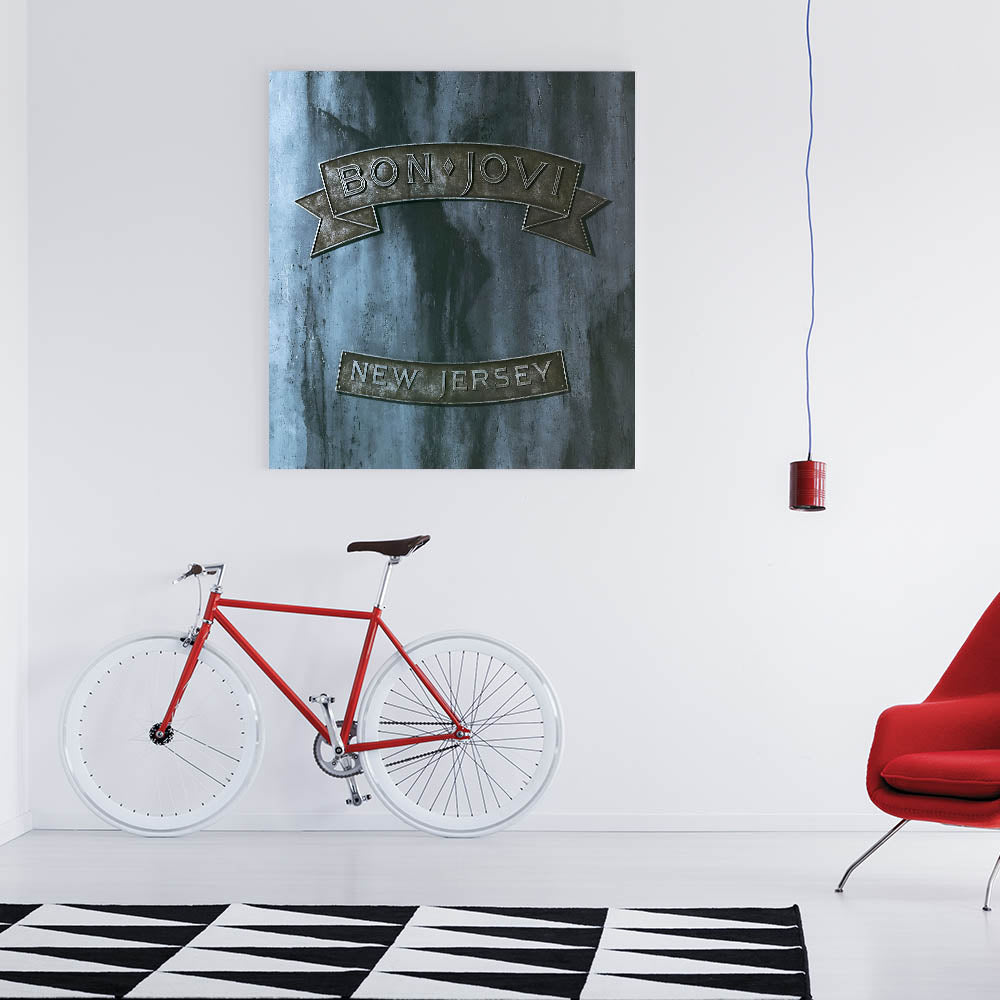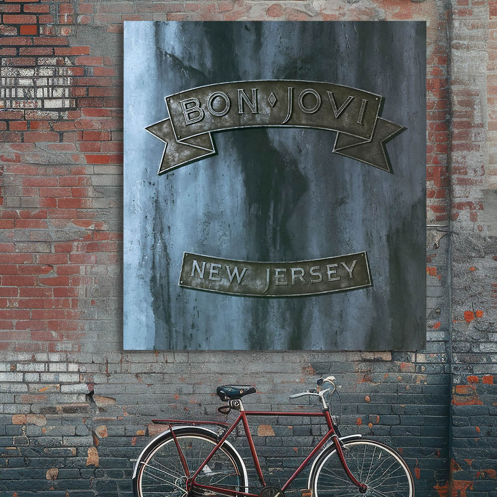 Rock your space with this Retro Wall Art featuring Bon Jovi's iconic New Jersey album cover. Designed for fans of vintage decor and nostalgic art prints, this piece captures the essence of classic retro style with its rugged metallic tones and bold design.