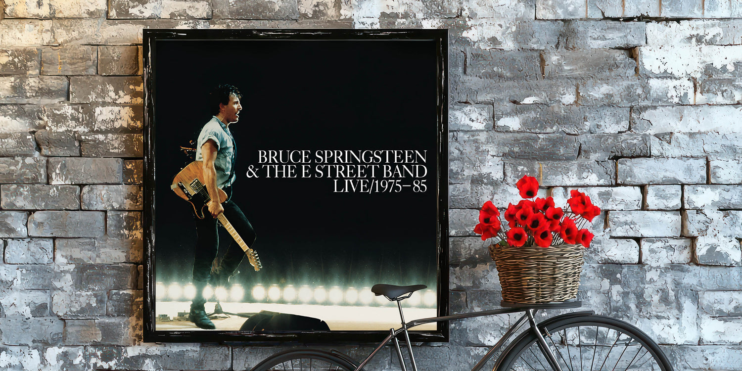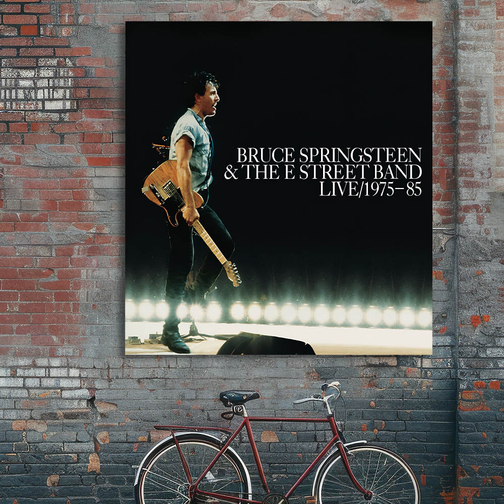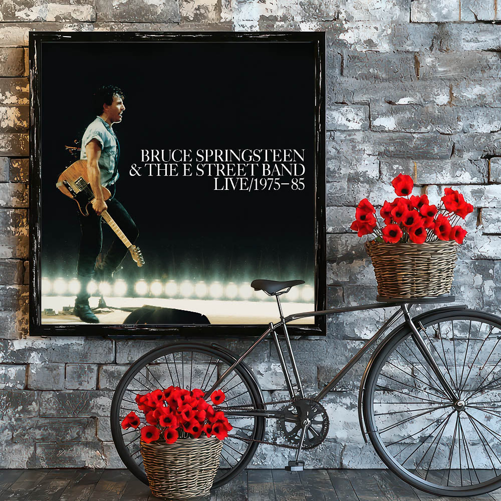 Capture the electrifying energy of rock and roll with this Retro Wall Art featuring Bruce Springsteen & The E Street Band's Live 1975-85 album cover. Designed for fans of vintage decor and nostalgic art prints, this piece embodies the essence of classic retro style with its dark tones and spotlight-lit stage scene.