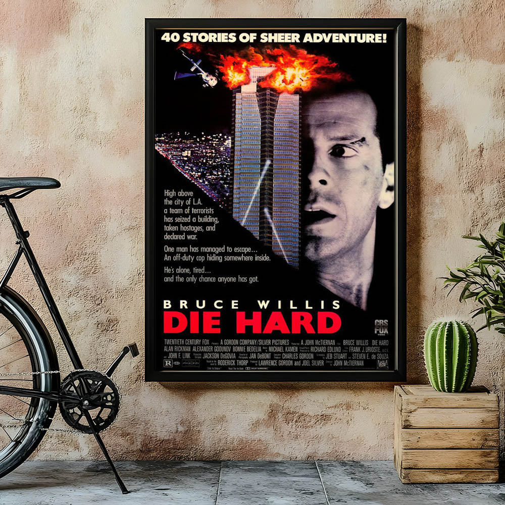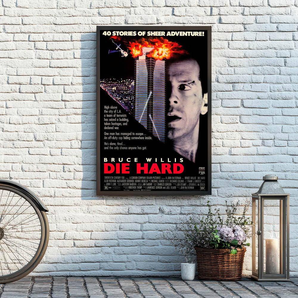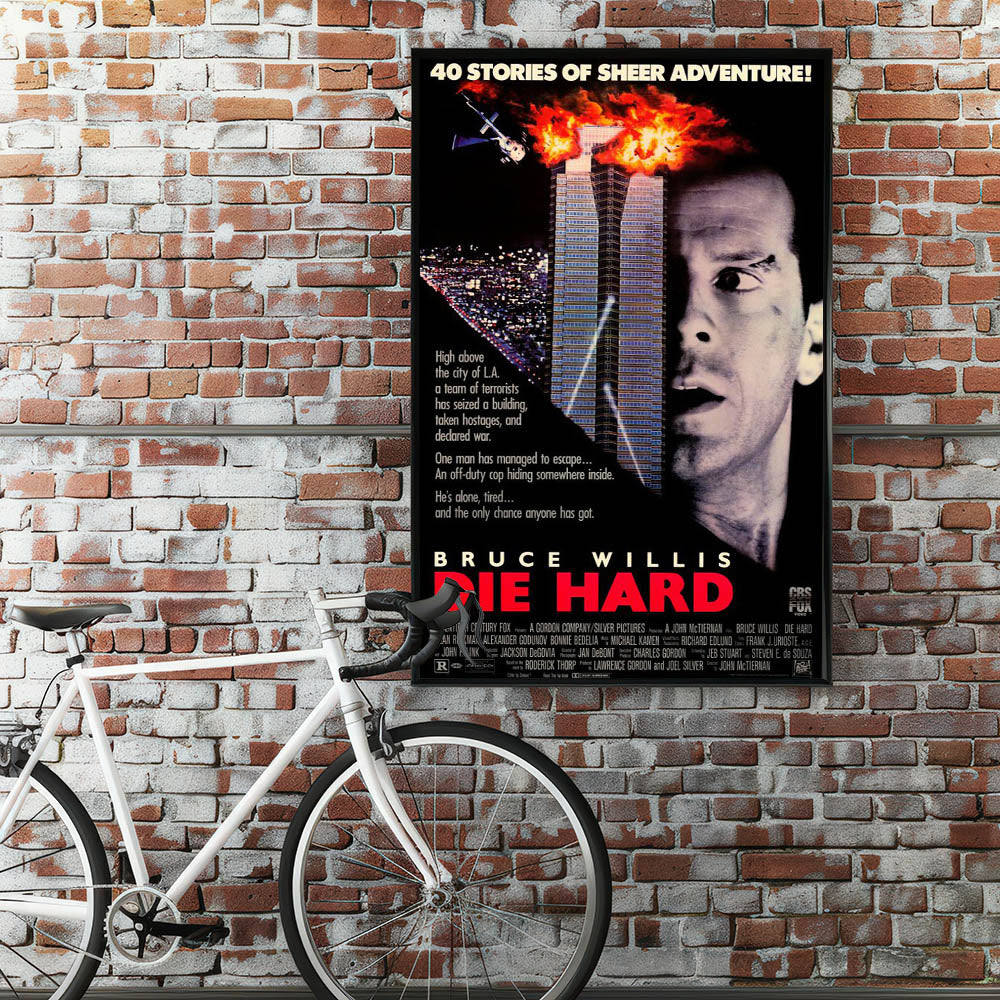 Feel the adrenaline rush of Die Hard with this iconic movie poster, featuring Bruce Willis as John McClane. The powerful imagery captures the explosive action of the film, with the massive explosion at the top of Nakatomi Plaza and McClane's determined expression. Perfect for fans of action-packed thrillers, 80s cinema, and vintage movie posters, this print will bring high-energy drama to any room.