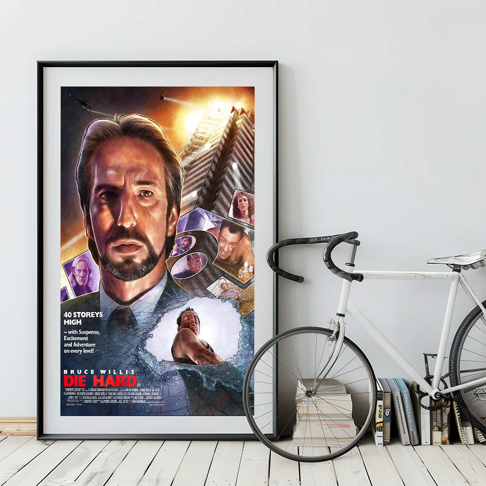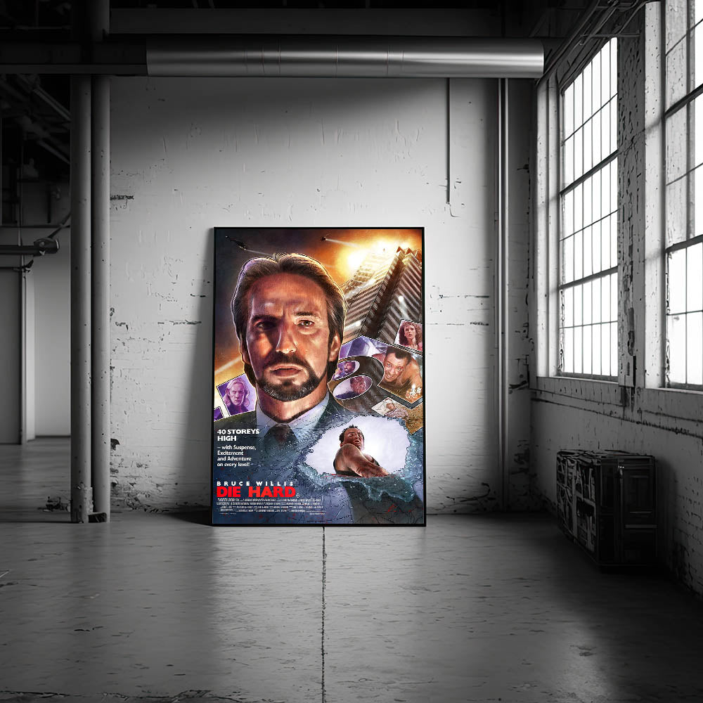 Experience the heart-pounding action of Die Hard with this retro movie poster, featuring Bruce Willis in his iconic role as John McClane. The vibrant and intense artwork captures the drama of this high-rise action thriller, with the dramatic shattered glass effect and the intense expressions of the characters. Perfect for fans of action films, 80s classics, and vintage movie posters, this print will add an exciting and dynamic touch to any space.