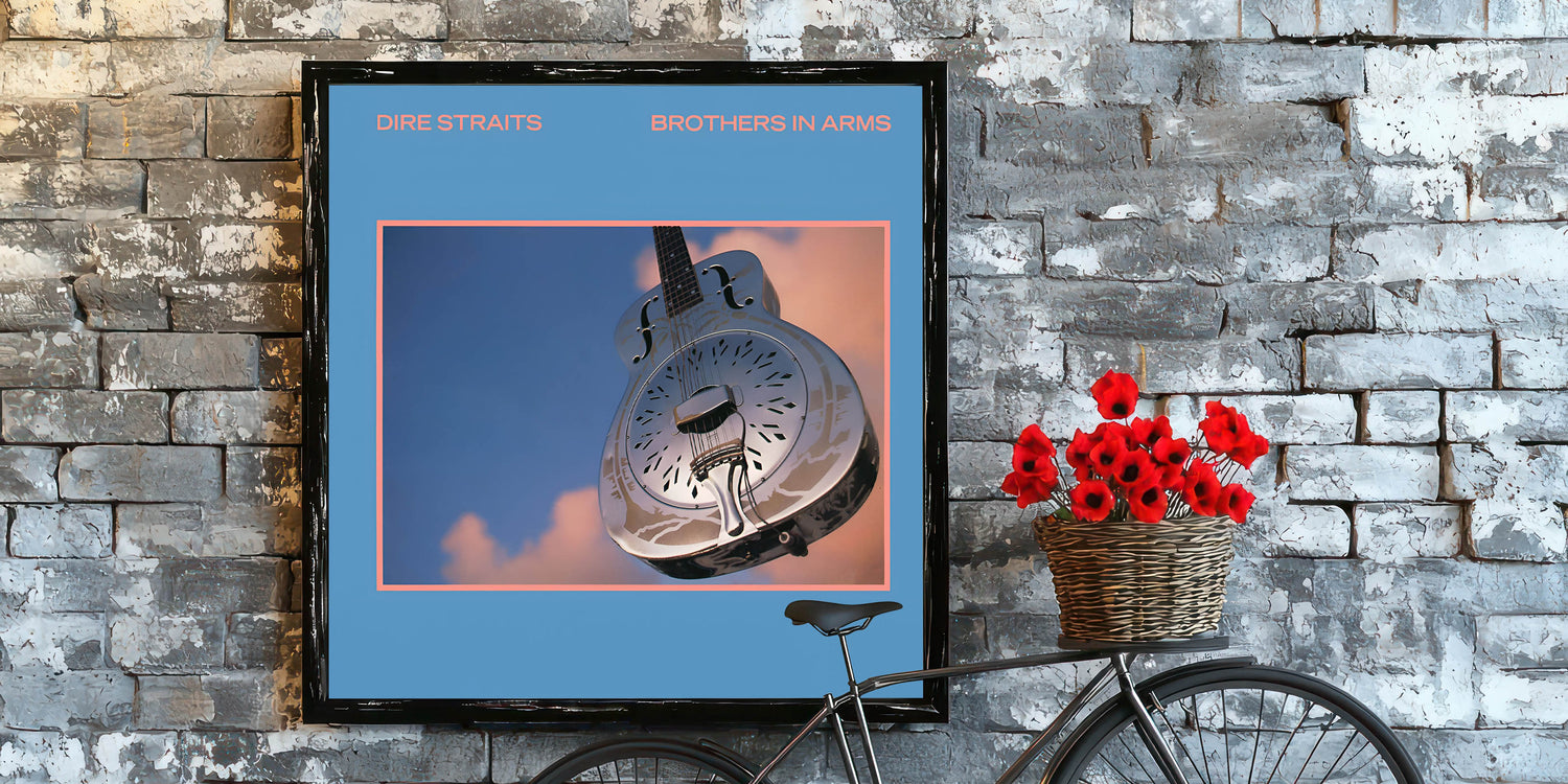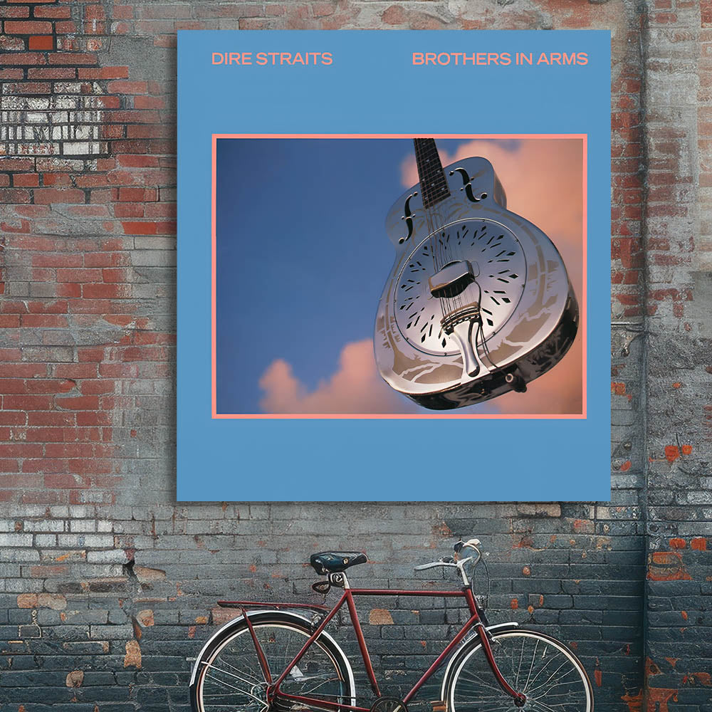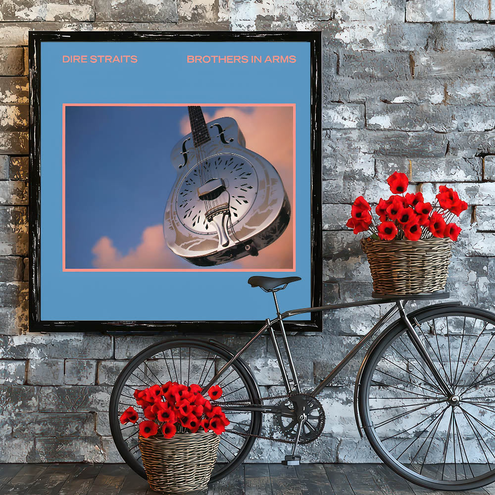 Capture the essence of classic rock with this Retro Wall Art featuring Dire Straits' iconic Brothers in Arms album cover. Designed for fans of vintage decor and nostalgic art prints, this piece showcases a blend of serene blue tones and metallic accents, embodying a timeless retro aesthetic.