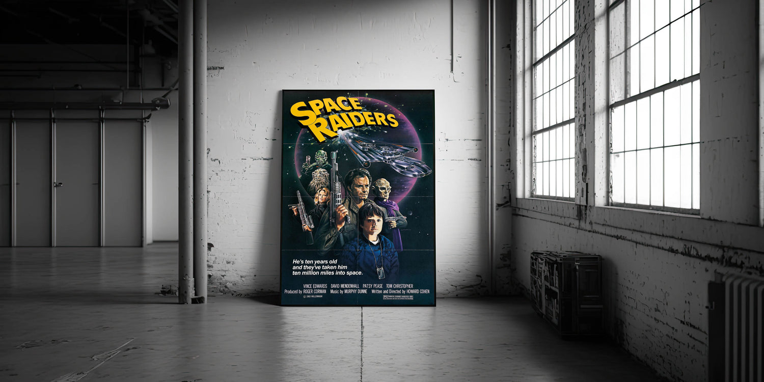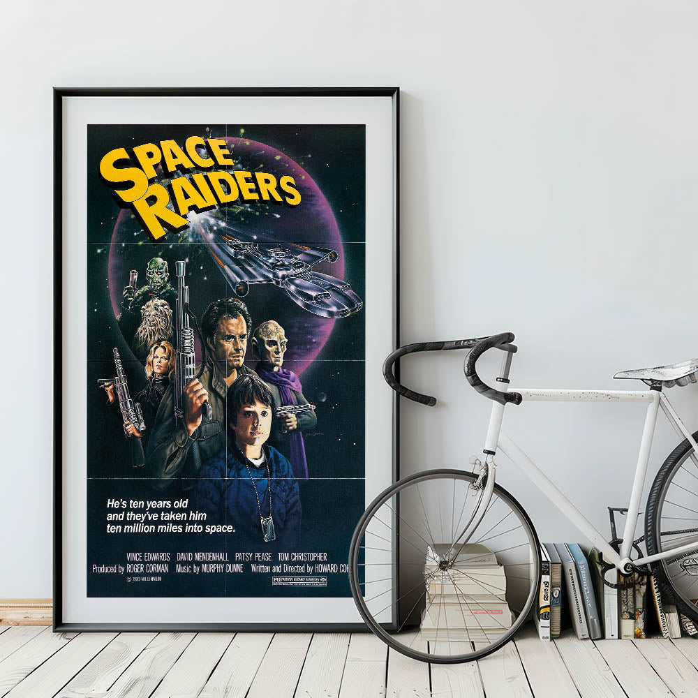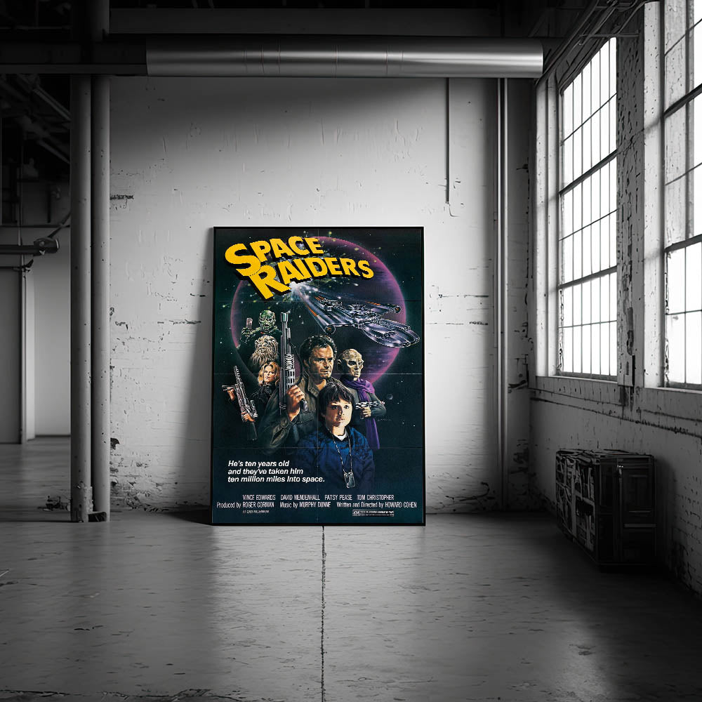 - Sci-Fi Classic: The Space Raiders poster captures the essence of 80s sci-fi, complete with futuristic weapons and a dynamic space backdrop.