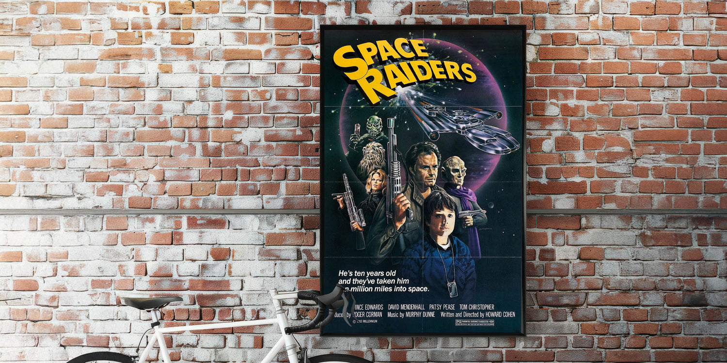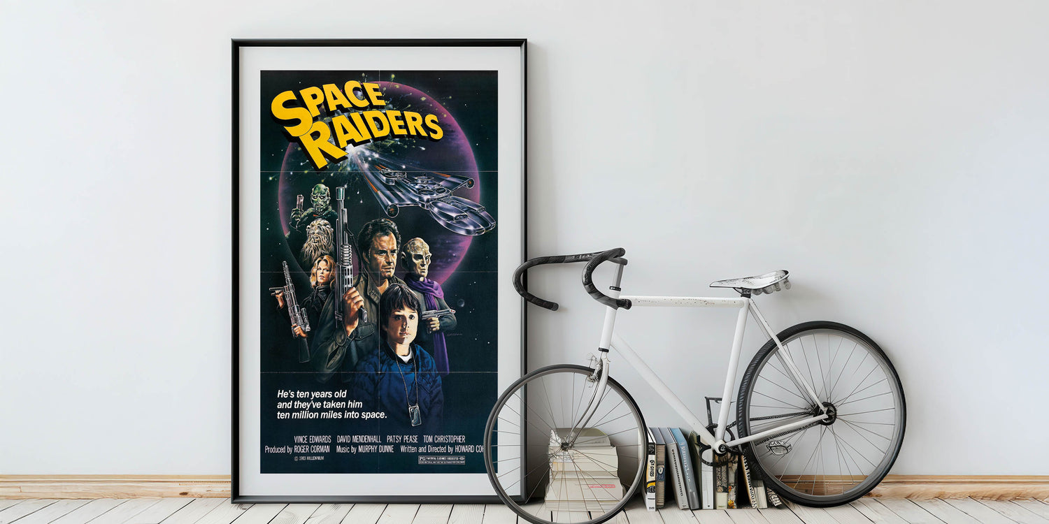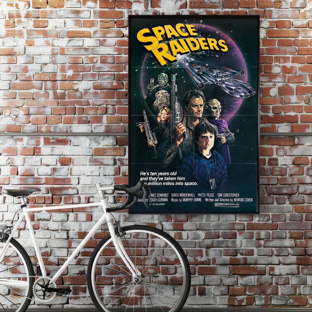 - Sci-Fi Classic: The Space Raiders poster captures the essence of 80s sci-fi, complete with futuristic weapons and a dynamic space backdrop.