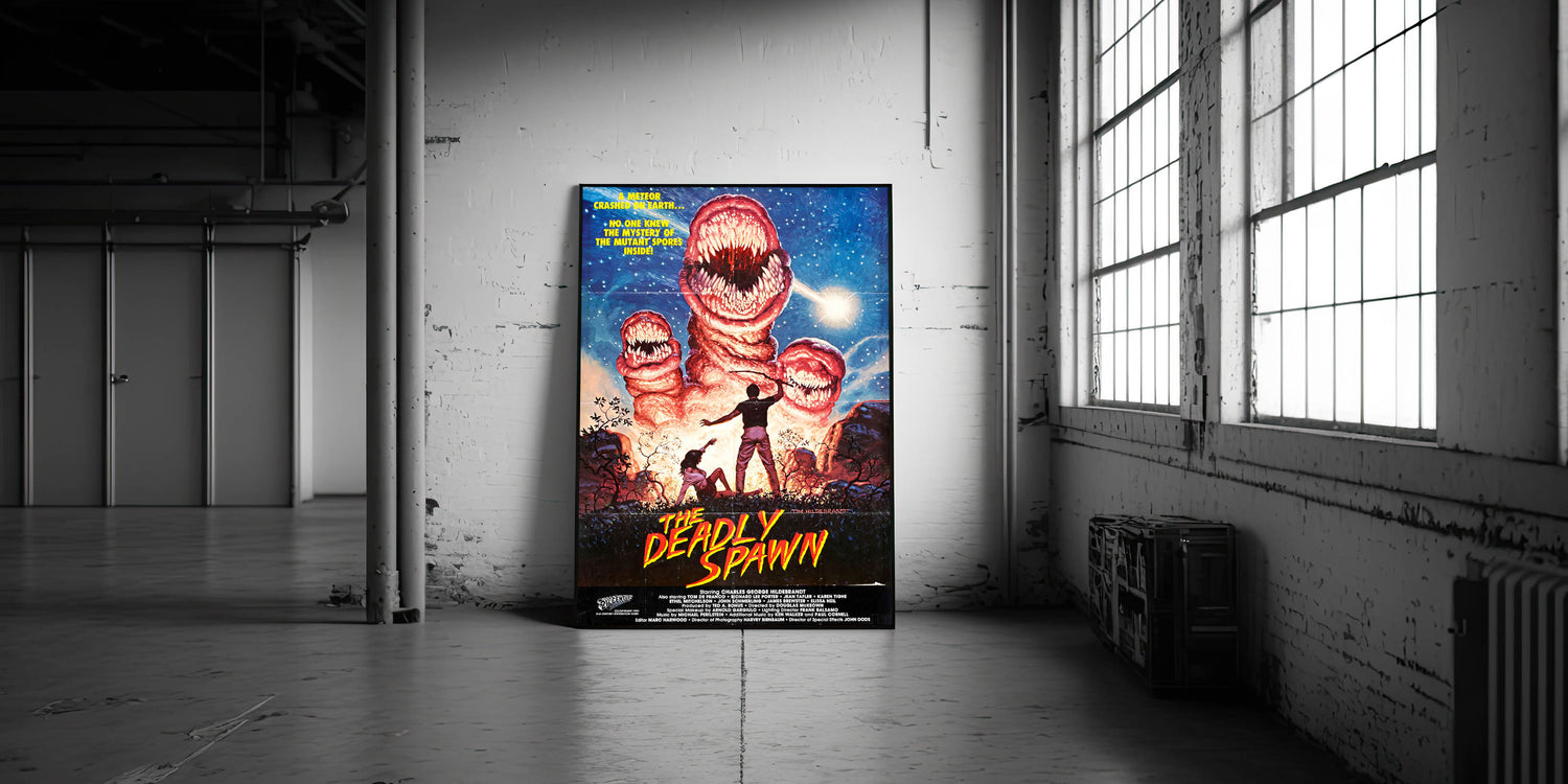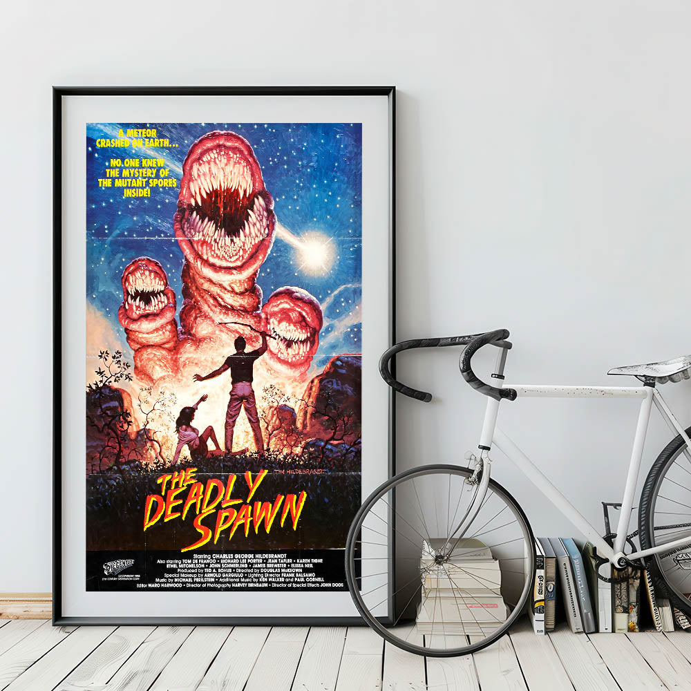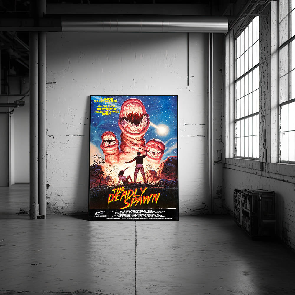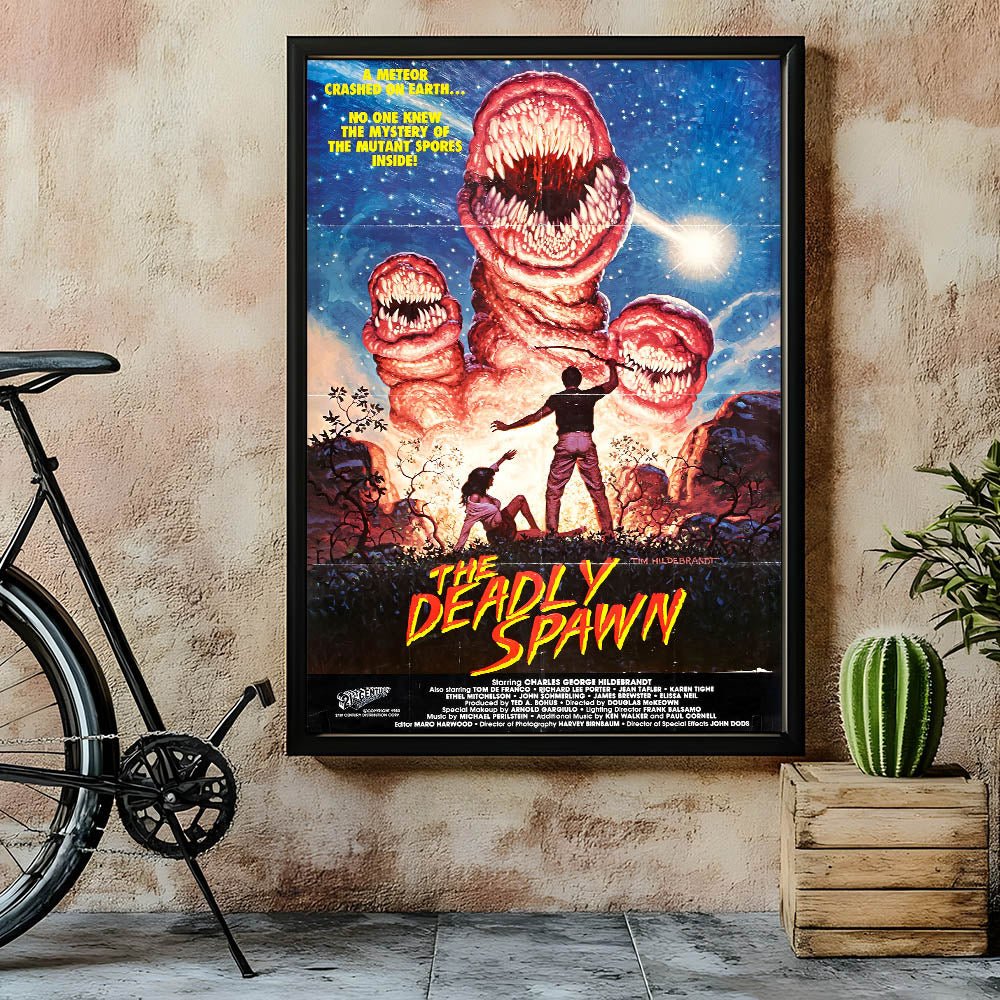 - Iconic horror design: The Deadly Spawn poster features monstrous alien creatures emerging from the depths of space, ready to invade the earth.