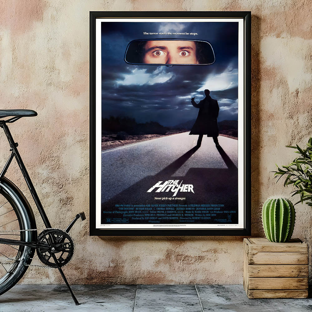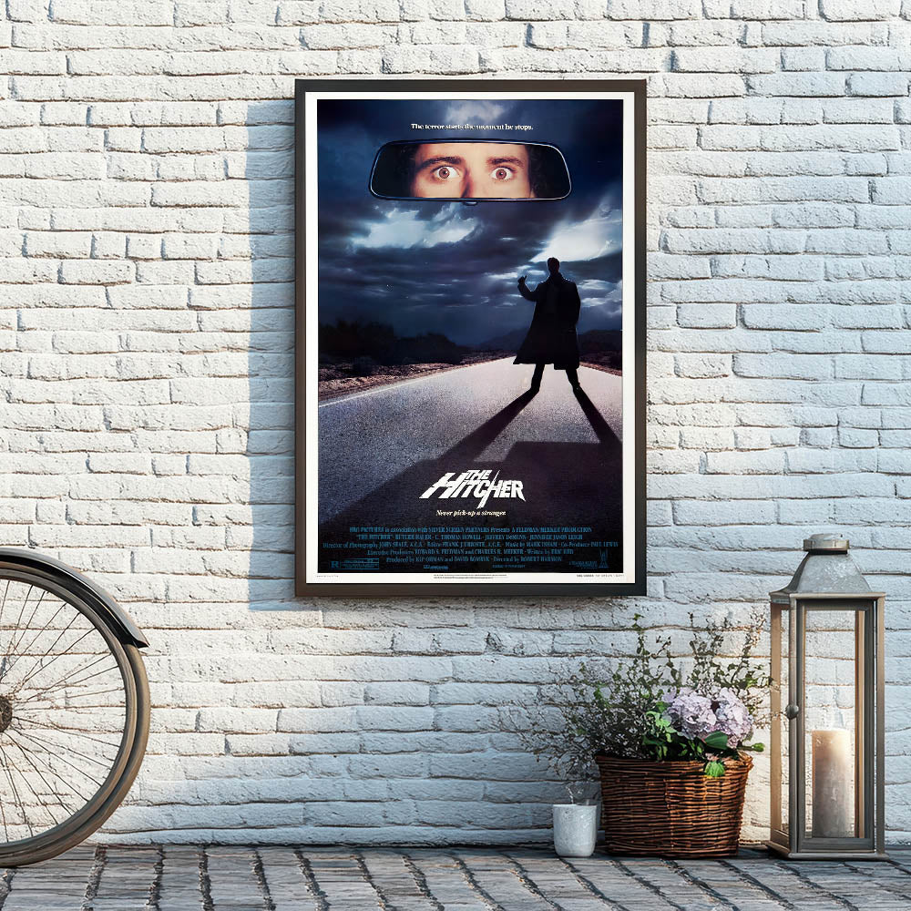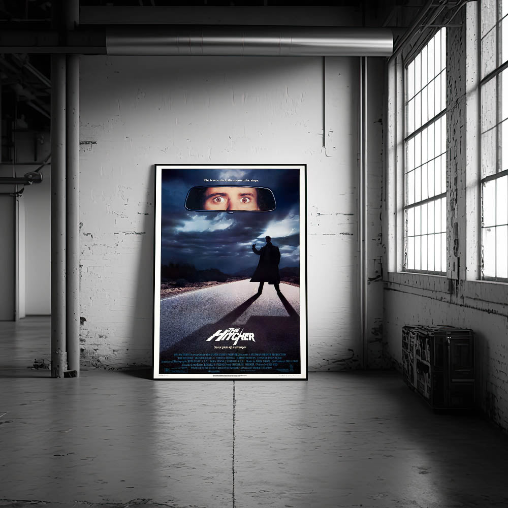 Step into the terrifying world of The Hitcher with this gripping retro movie poster. Featuring Rutger Hauer in his chilling role, this vintage print captures the tension and suspense of the cult-classic thriller. Perfect for fans of nostalgic art prints and retro aesthetic, this piece brings a sense of eerie dread to any room.