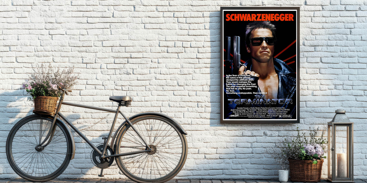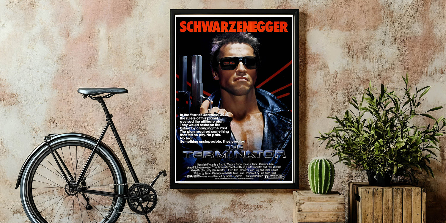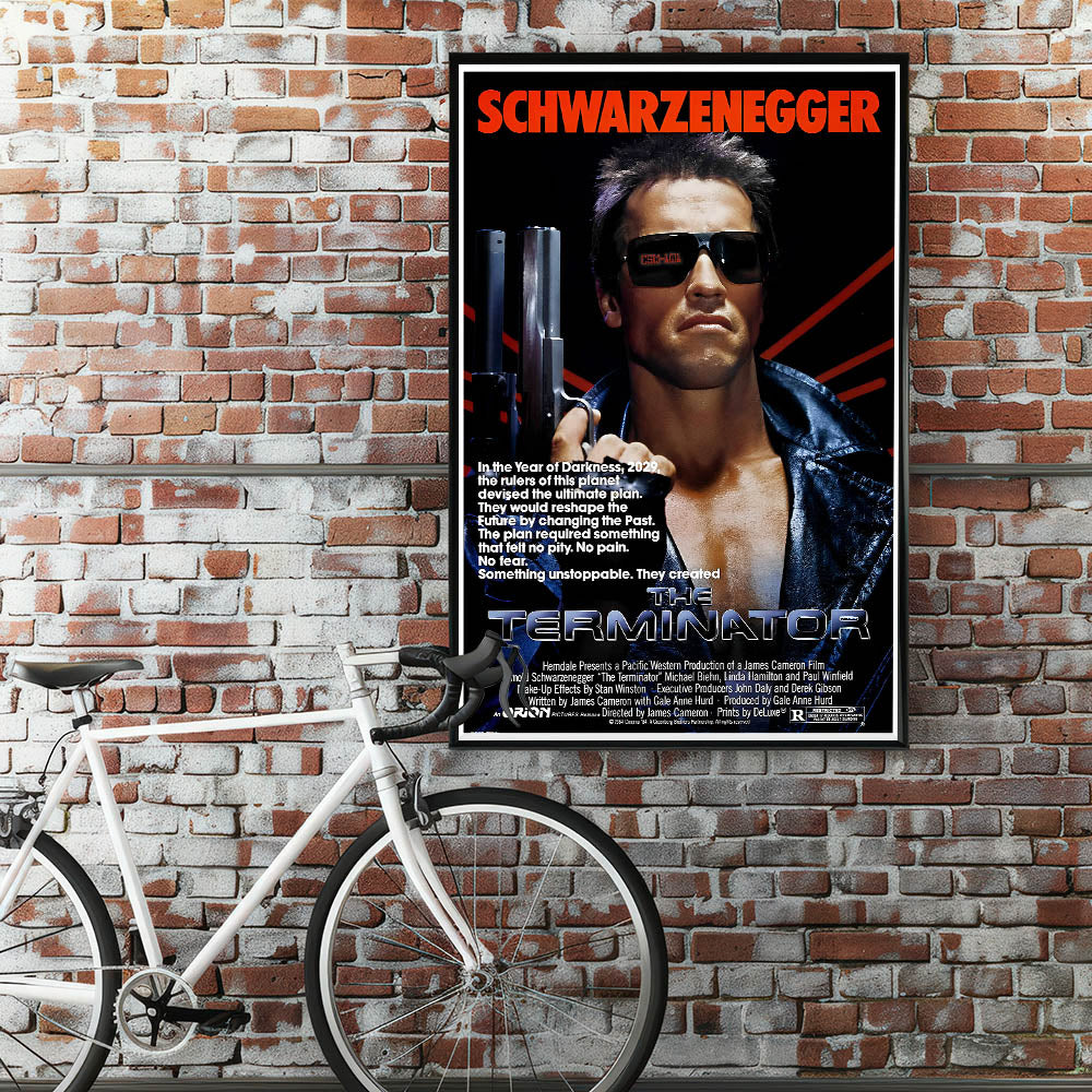 - Iconic sci-fi design: The Terminator poster captures one of the most famous moments in movie history, with Schwarzenegger’s stoic expression and the intense red backdrop.