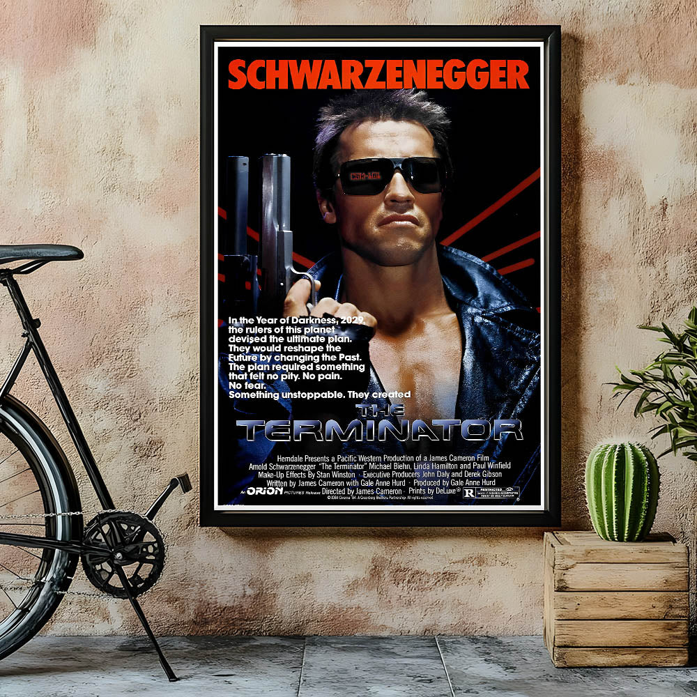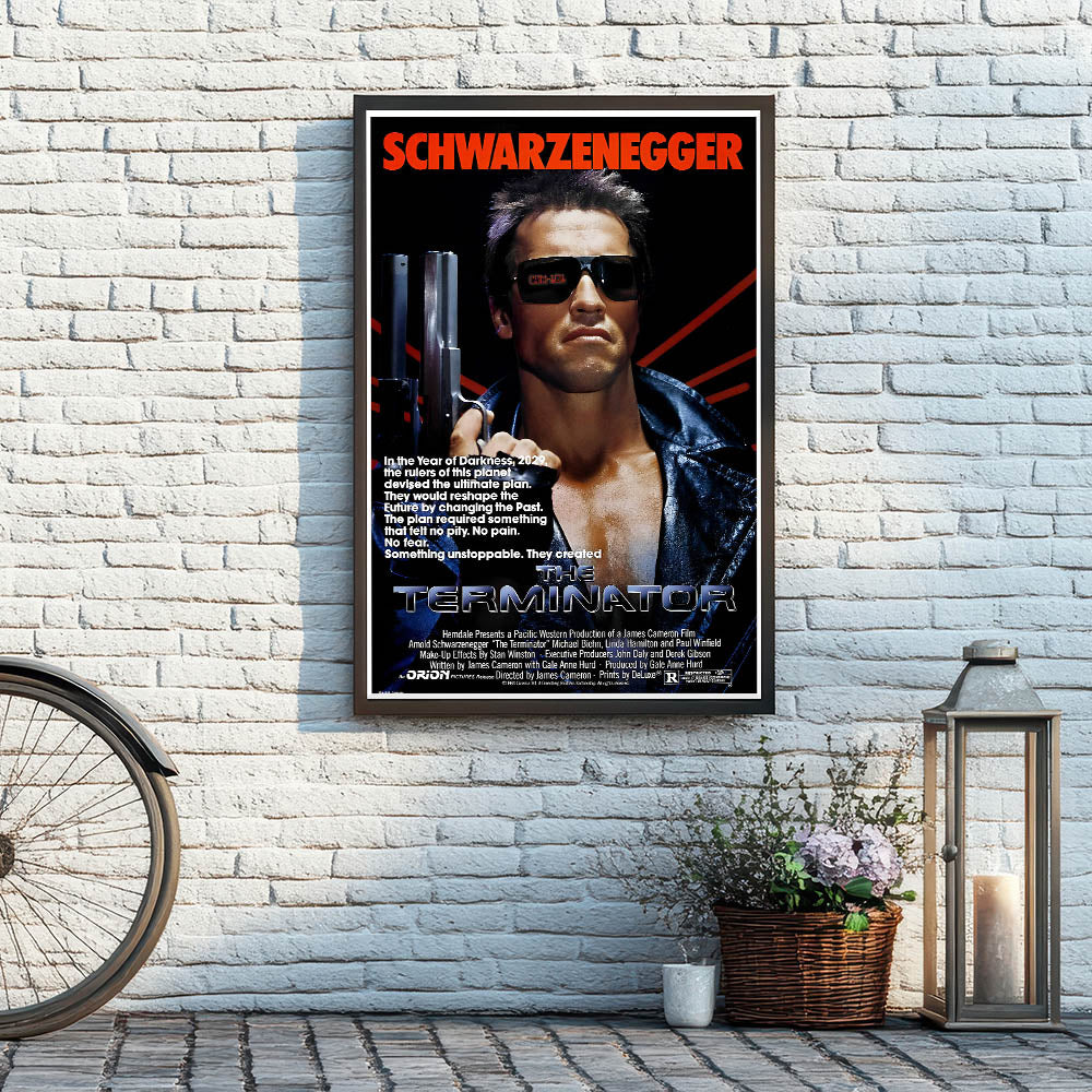 Step into the world of The Terminator with this iconic retro movie poster from the 1980s. Featuring Arnold Schwarzenegger in his legendary role, this vintage print captures the thrilling essence of the film. Perfect for fans of nostalgic art prints and retro aesthetic, this piece brings a bold, futuristic vibe to any room.