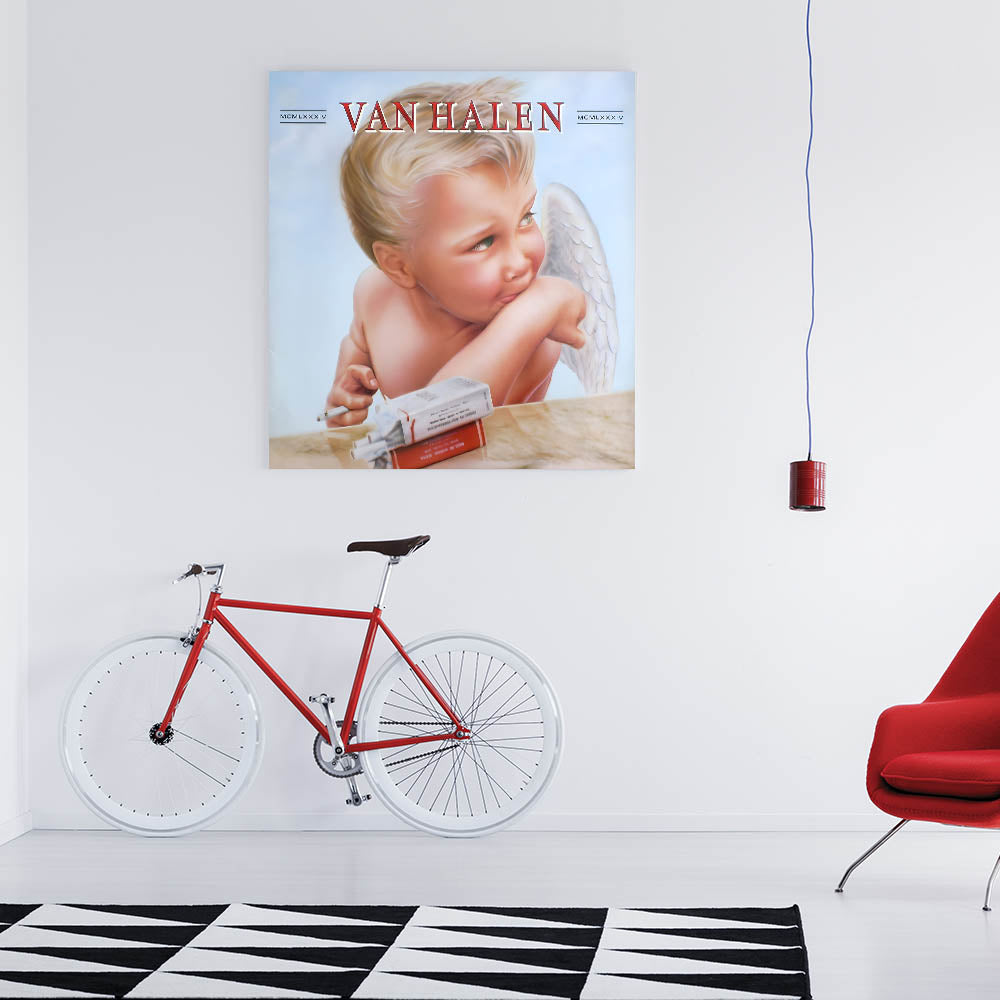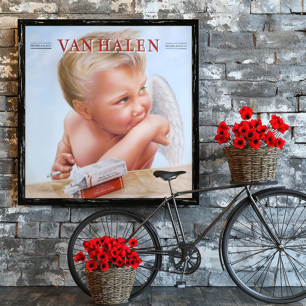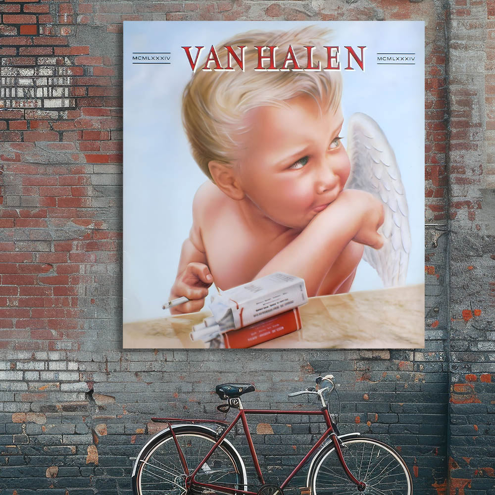 Add a legendary touch to your space with this Van Halen 1984 Album Cover print. This Retro Wall Art piece features the iconic artwork of a mischievous cherub, blending Vintage Decor with a rebellious edge. A perfect Nostalgic Art Print for music lovers, this Retro Canvas Print captures the essence of Classic Retro Style and the glam rock era.