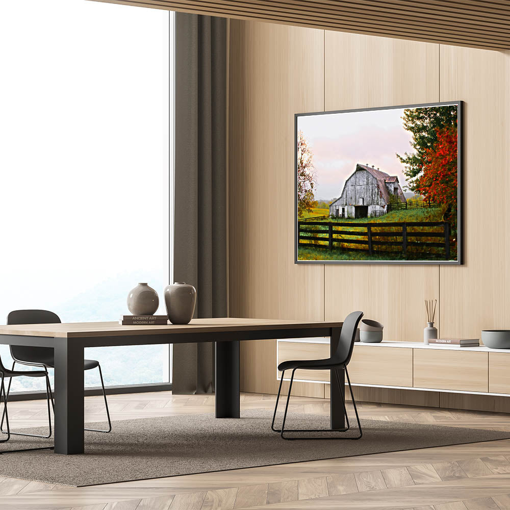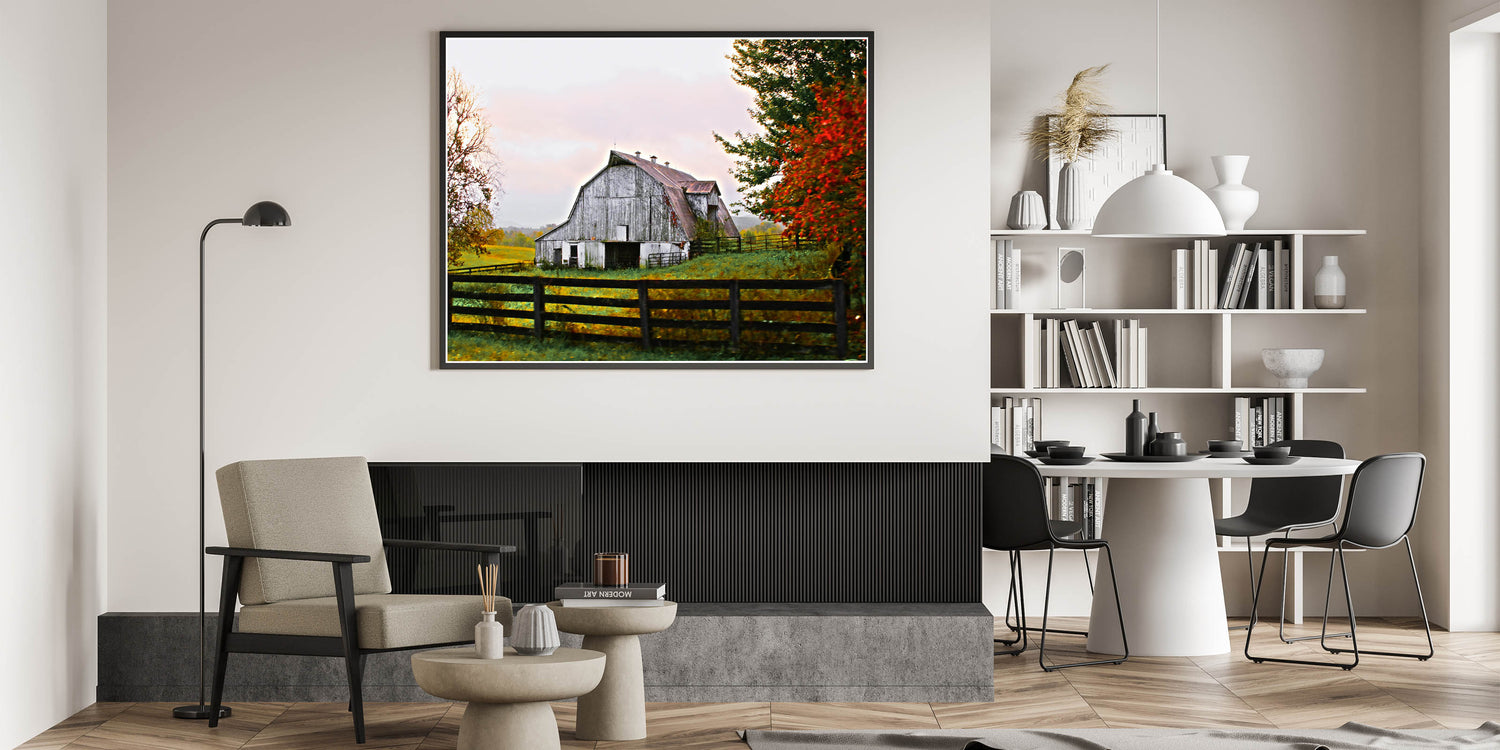 - High-quality print that captures the intricate details of the weathered barn and colorful trees