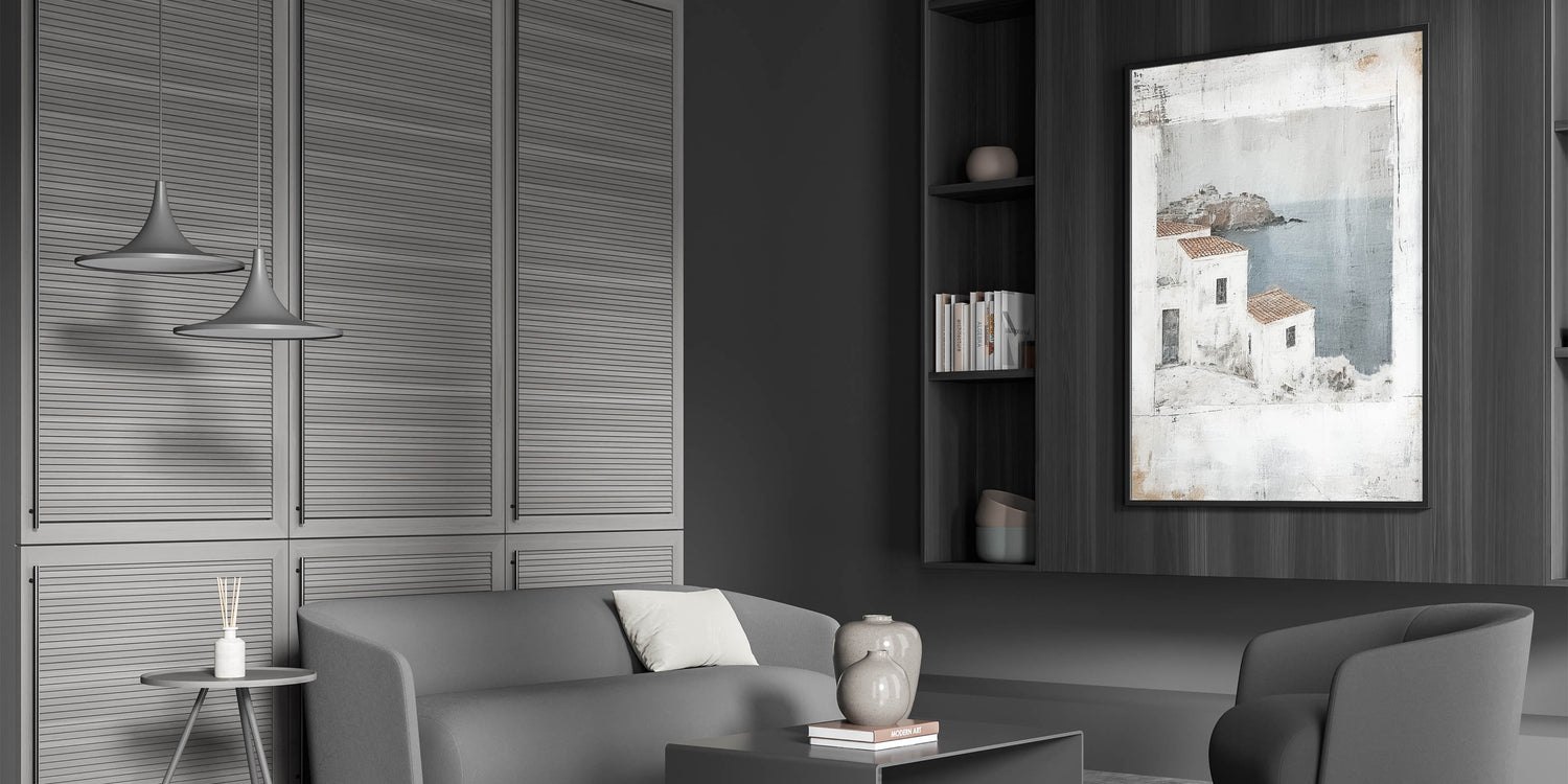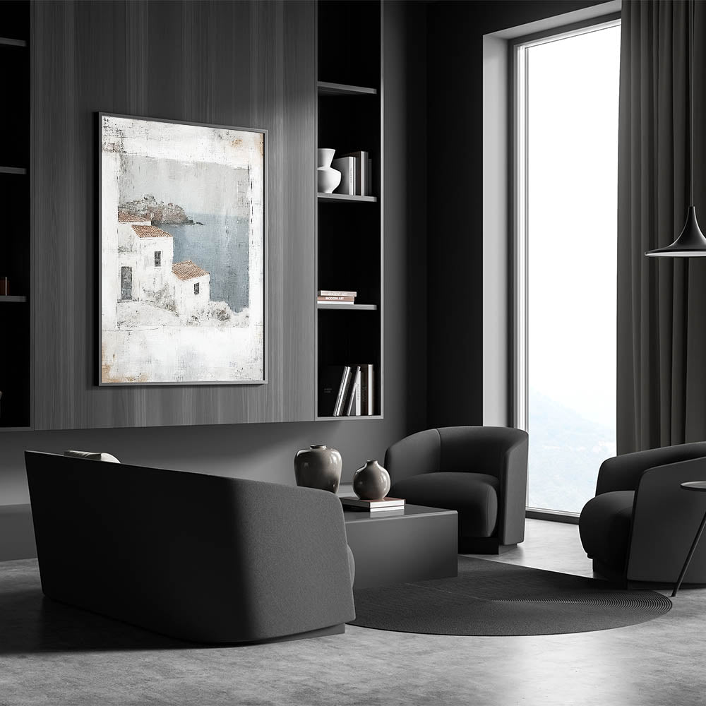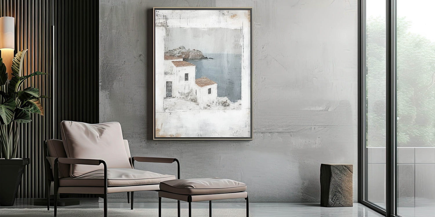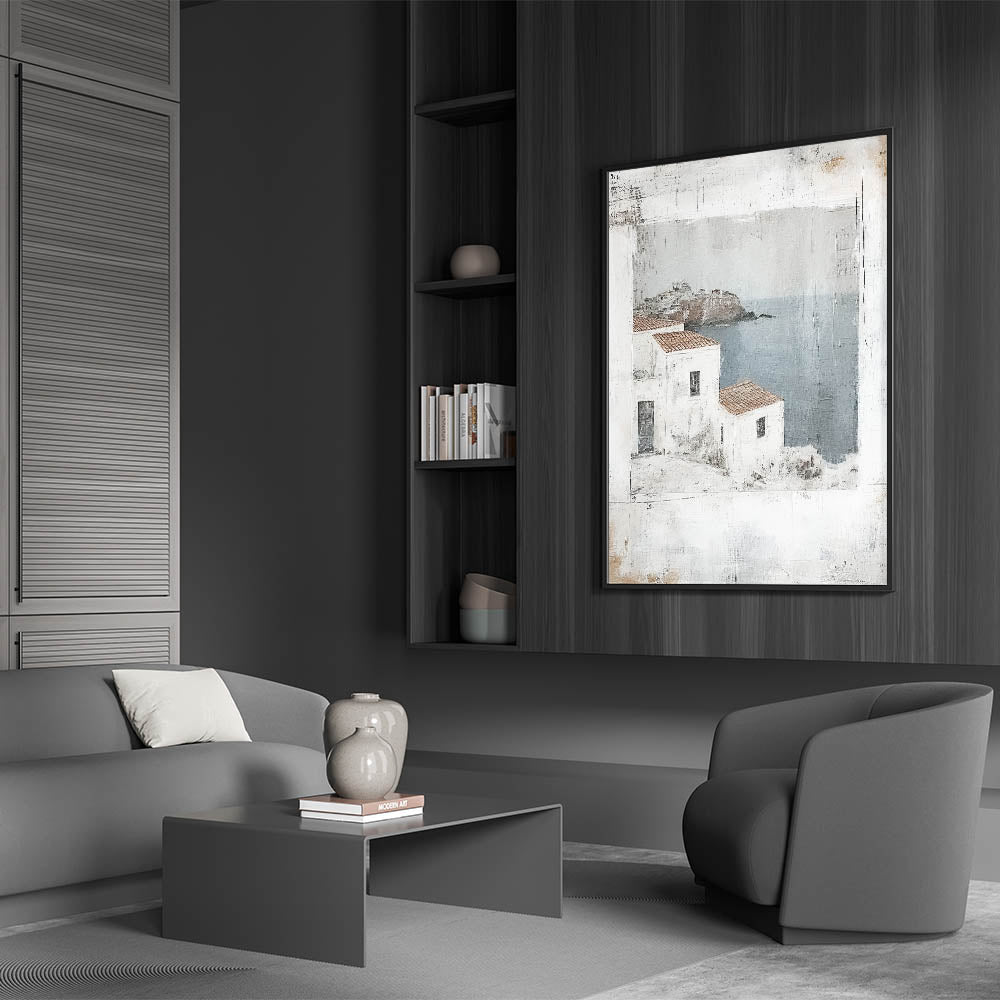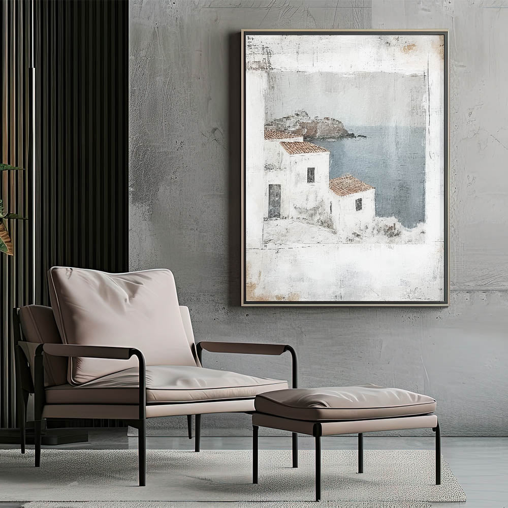 Bring the tranquility of the coast into your home with this minimalist coastal architecture artwork. This piece captures a serene seaside village with whitewashed buildings set against a muted blue sea. The soft, textured details evoke a calm, dreamlike atmosphere, perfect for any space needing a touch of relaxation and elegance. Available in various formats, this artwork is ideal for creating a peaceful ambiance in any room.