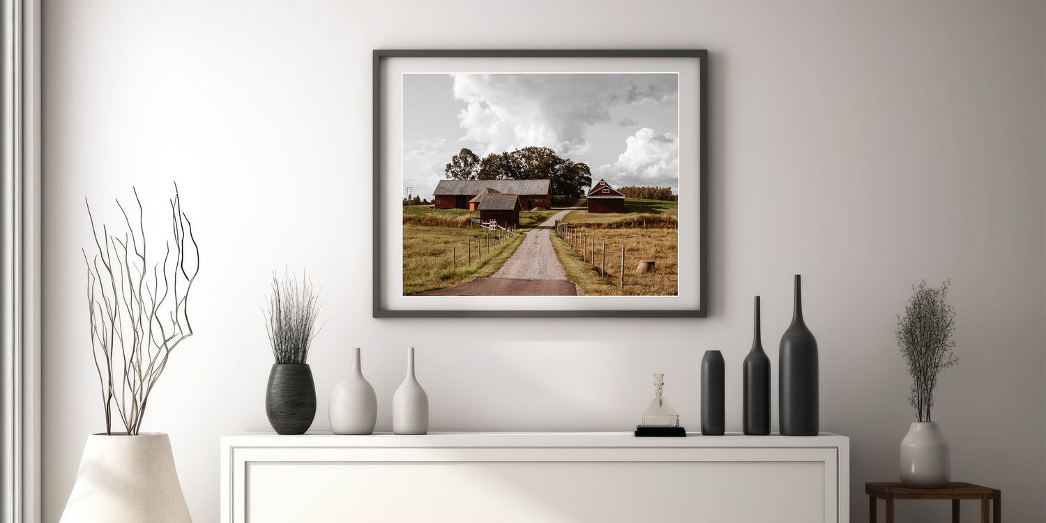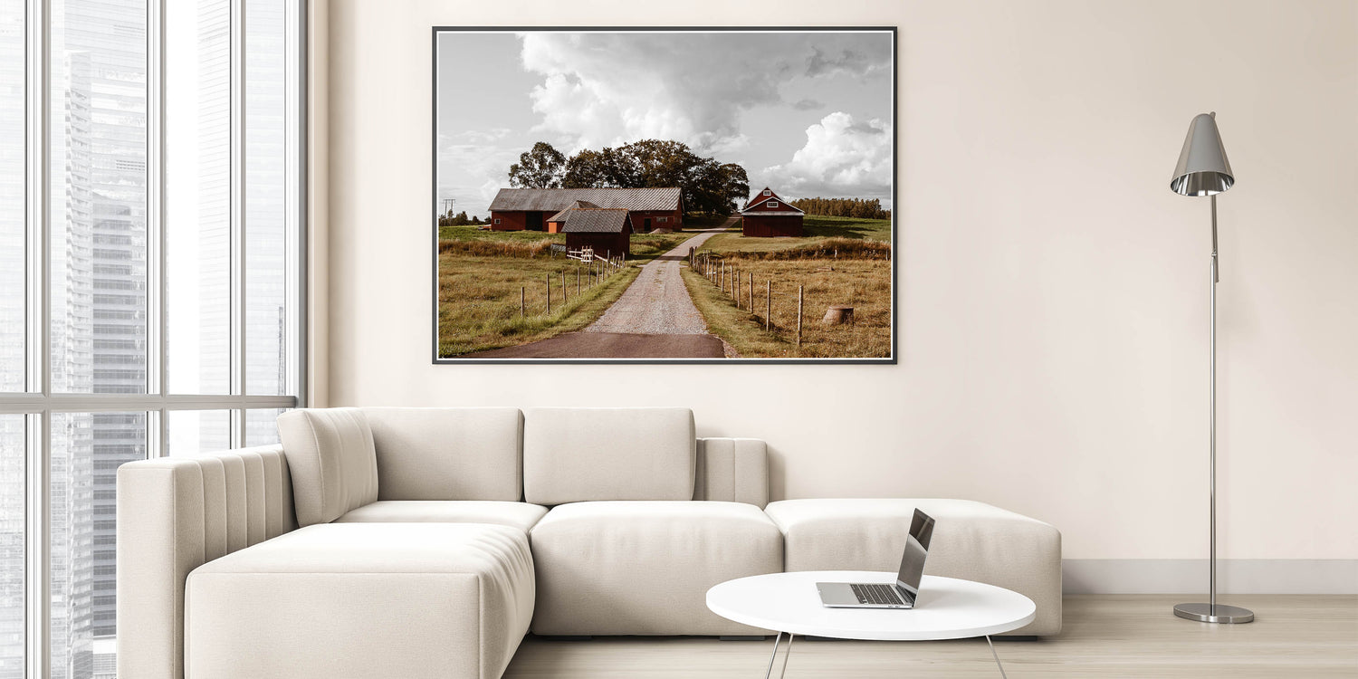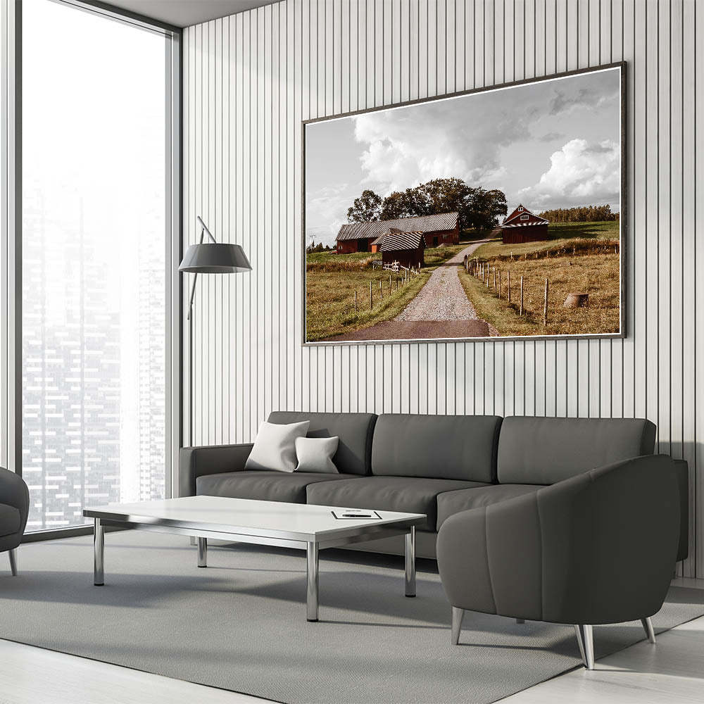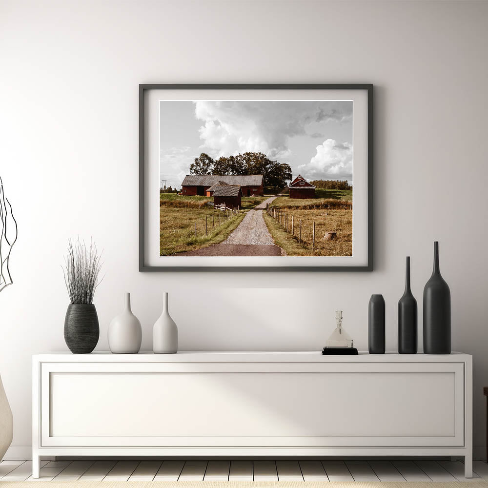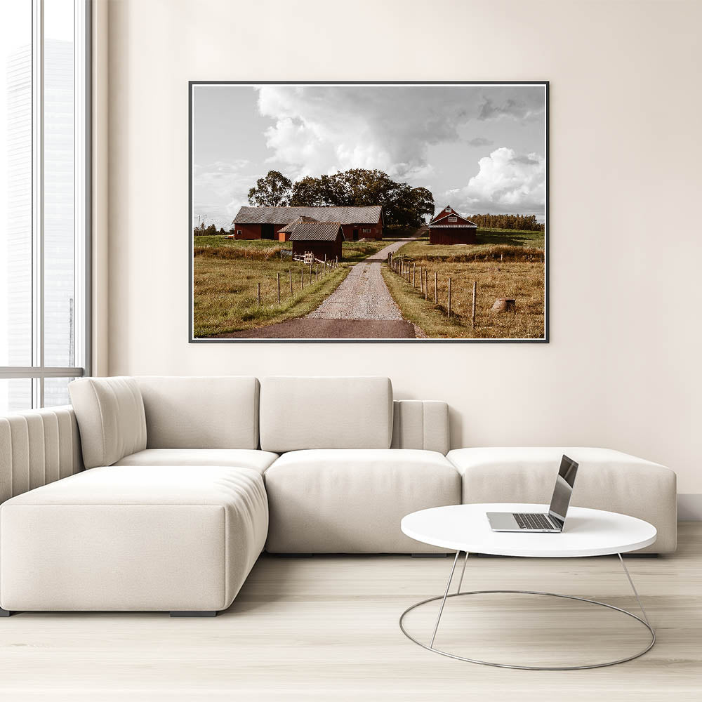 - High-resolution print showcasing the rustic charm of the red barns and open farmland