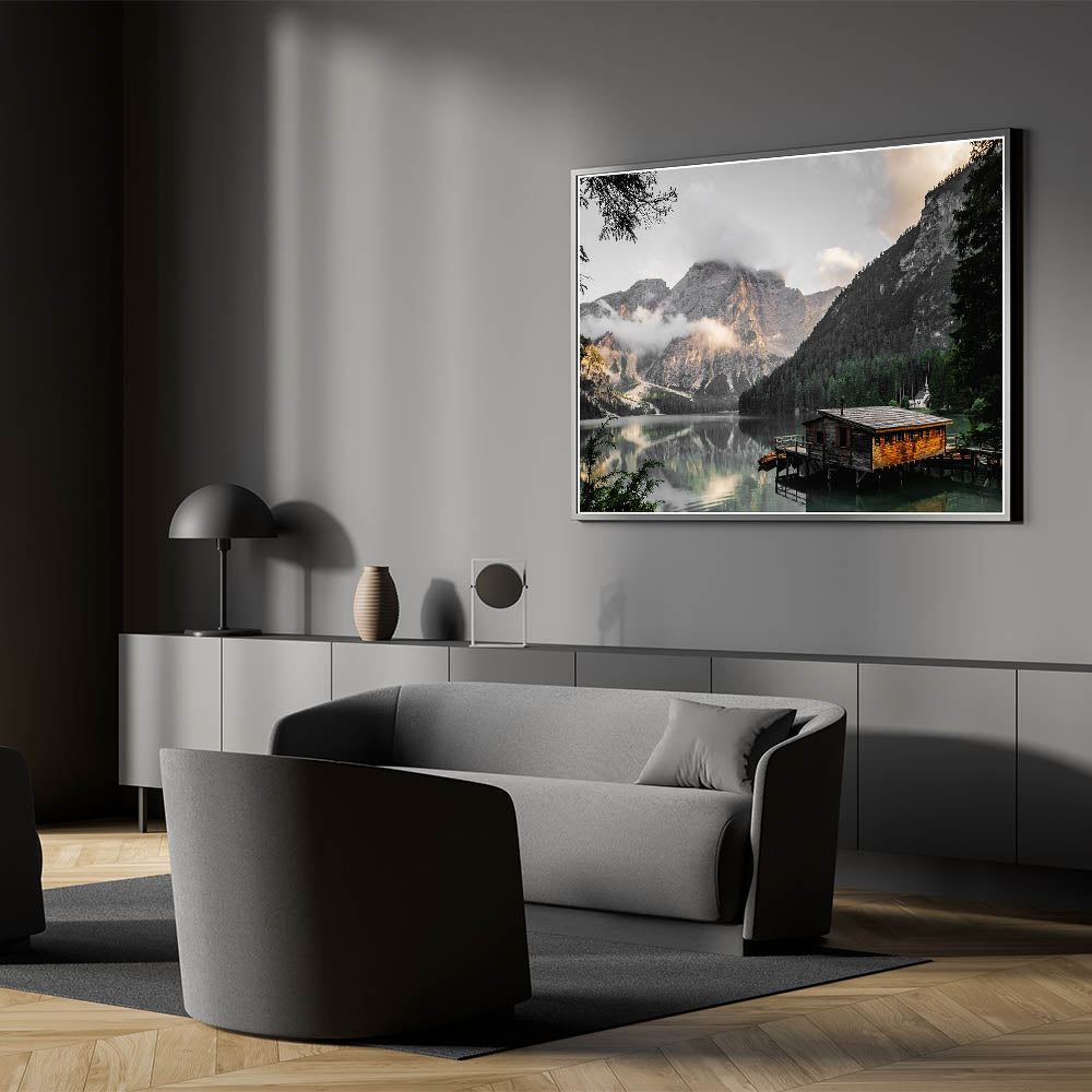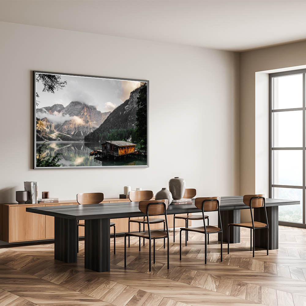 Immerse yourself in the tranquil beauty of nature with this stunning rustic mountain cabin by the lake wall art. Featuring a peaceful scene of a wooden cabin resting on the edge of a calm lake, with towering mountains in the background, this artwork brings a sense of serenity and adventure to any space. The reflection of the mountains and the cabin in the still water adds depth and tranquility, making this print the perfect addition to any rustic or farmhouse-style decor.