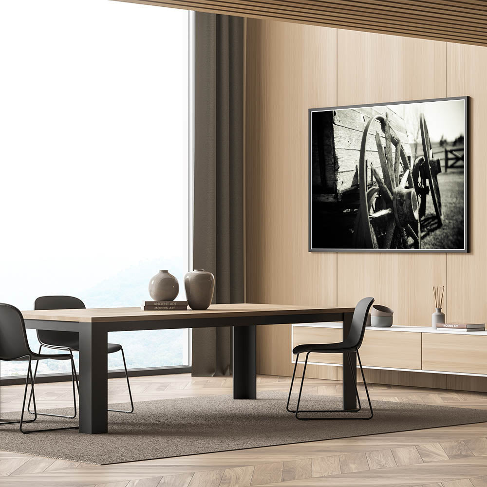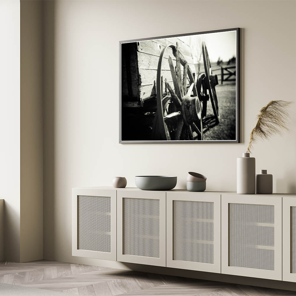 Add a touch of vintage charm to your home with this stunning black and white rustic wall art featuring a close-up of a weathered wagon wheel. The intricate textures of the wood and metal, paired with the nostalgic feel of the image, make this artwork a perfect fit for farmhouse-style or rustic-inspired interiors. The timeless appeal of the wagon wheel reflects the simplicity and durability of rural life, making it a powerful symbol of history and craftsmanship.