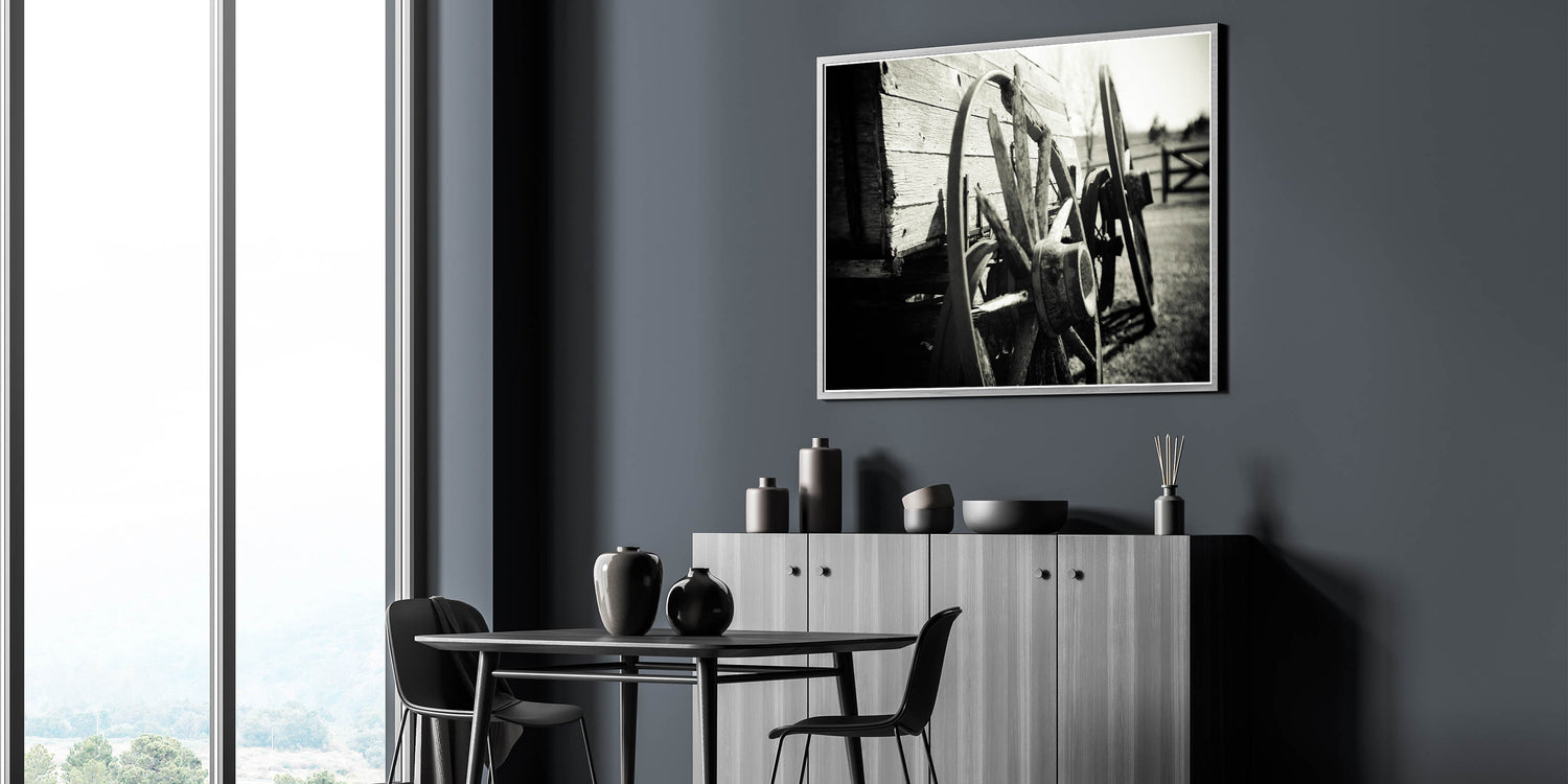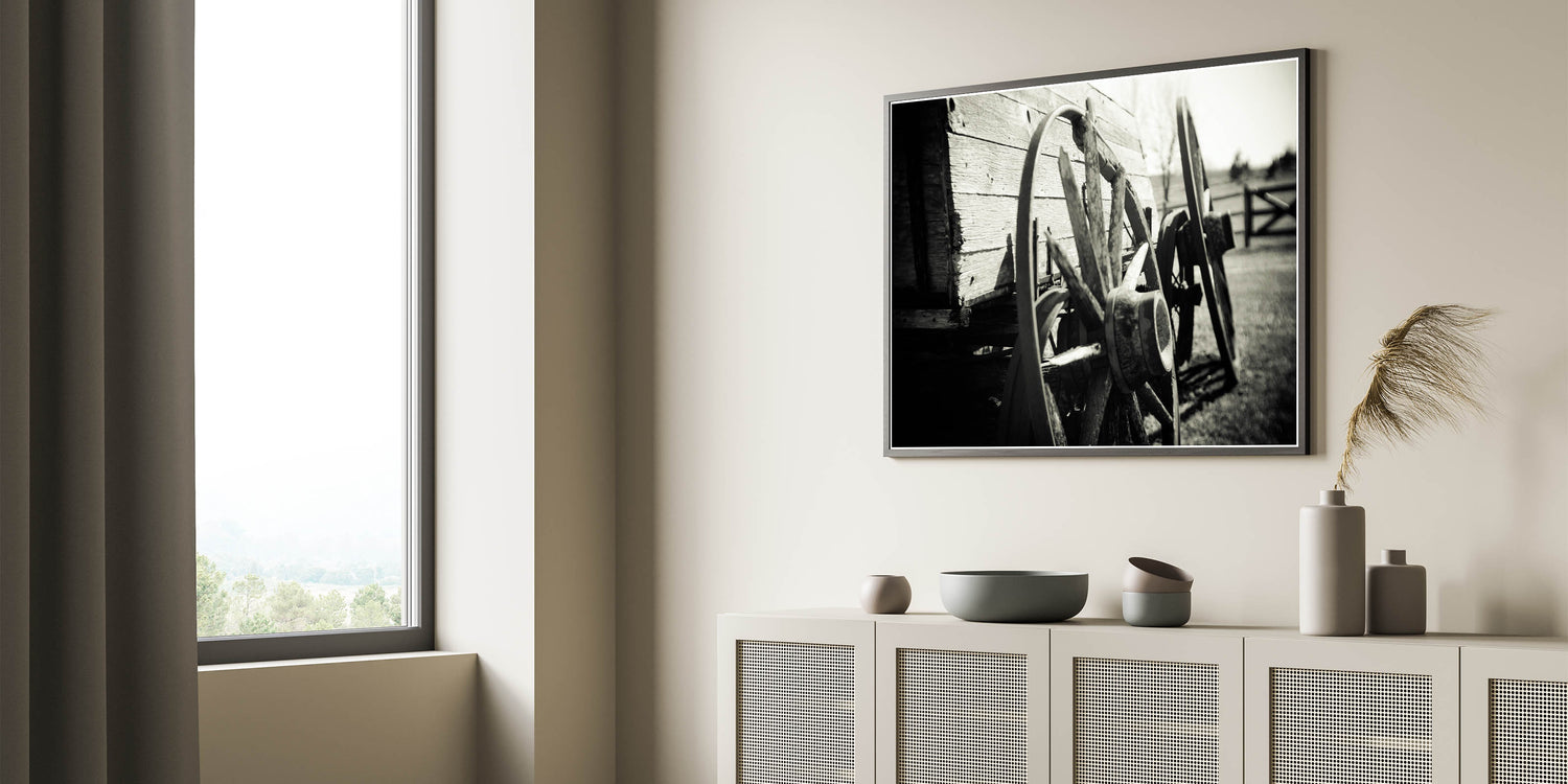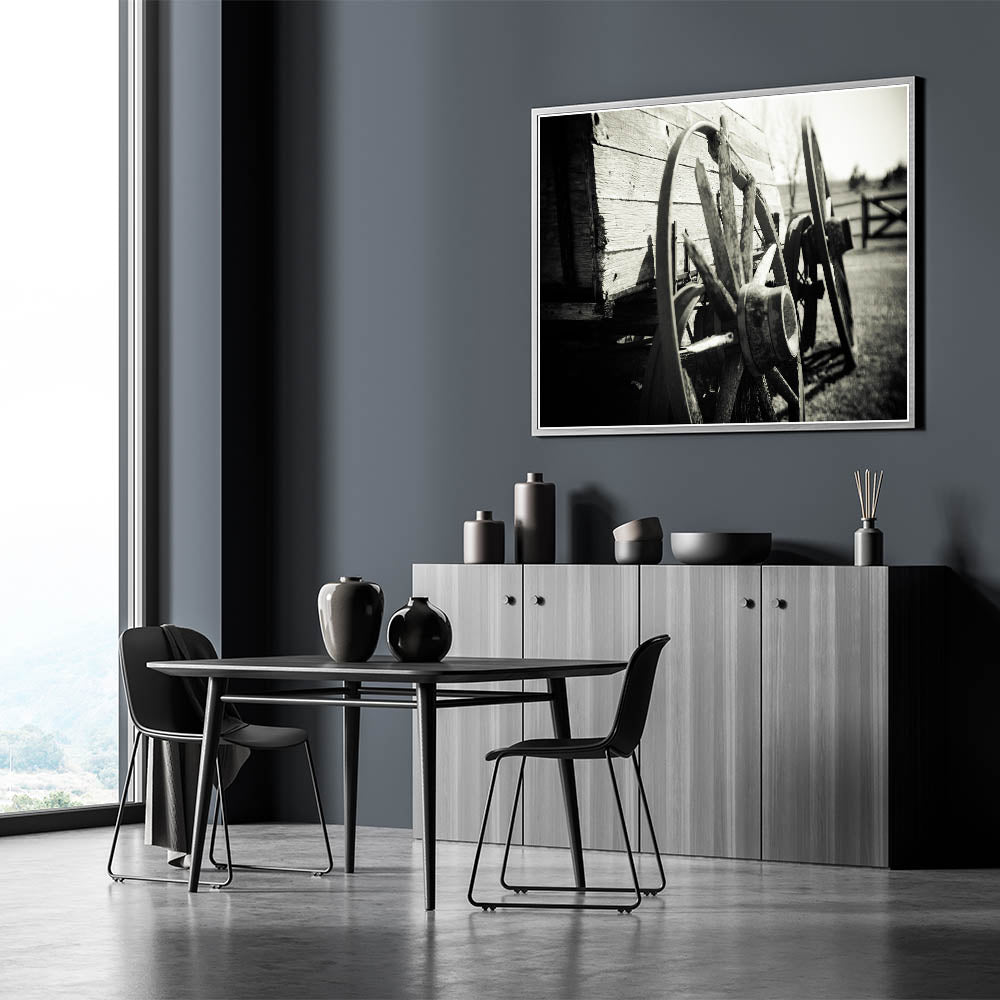 - High-quality black and white rustic wall art featuring a vintage wagon wheel