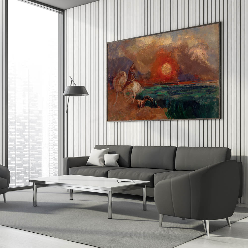 - Vibrant Color Palette: The striking contrast of fiery reds, deep blues, and earthy tones creates an intense visual experience that draws the viewer into the artwork’s mythical theme.