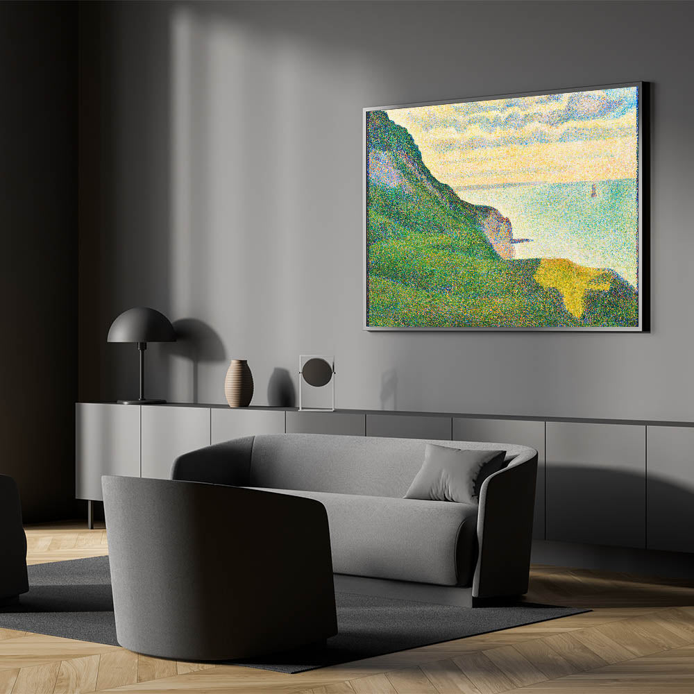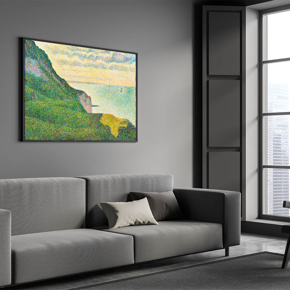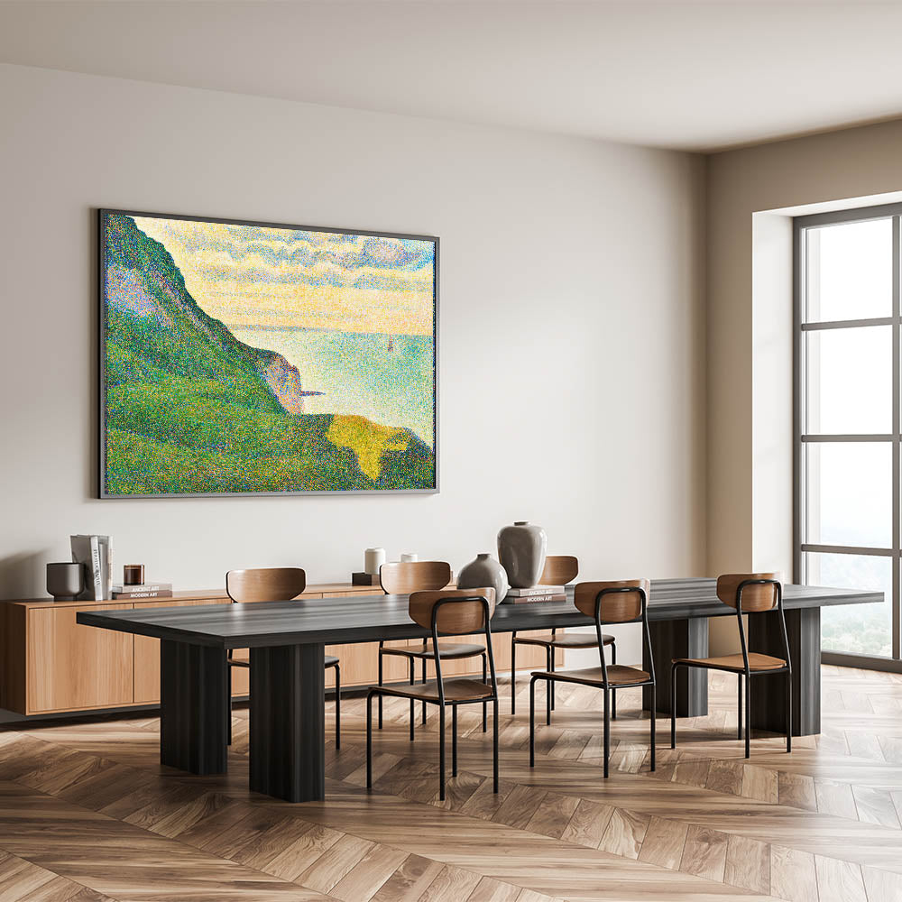 Explore the serene beauty of Normandy’s coastline with Georges Seurat's "Seascape at Port-en-Bessin." This captivating Impressionist seascape captures a rugged cliff overlooking a tranquil sea under a softly glowing sky. Seurat’s pointillism technique brings vibrant life to the landscape, using thousands of dots to create depth and movement. This artwork is perfect for anyone who loves the coastal beauty of Normandy and appreciates Seurat’s unique style.