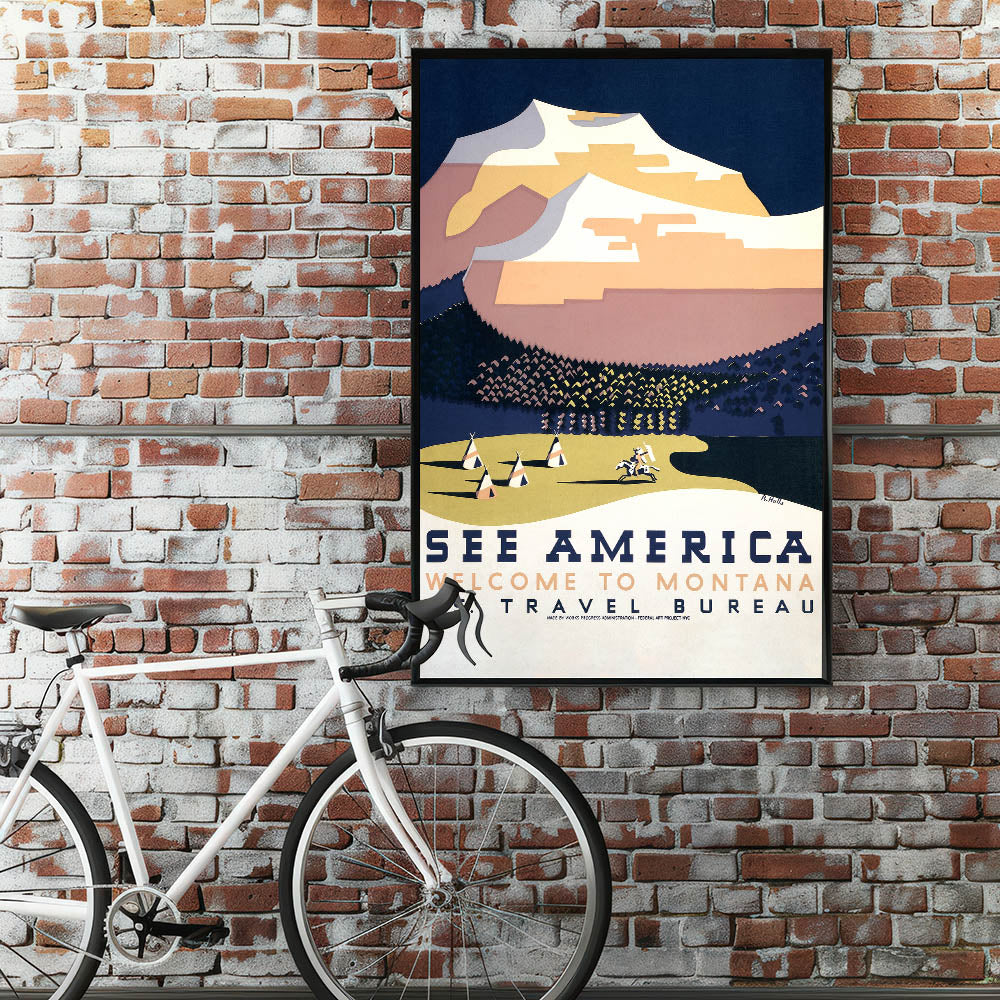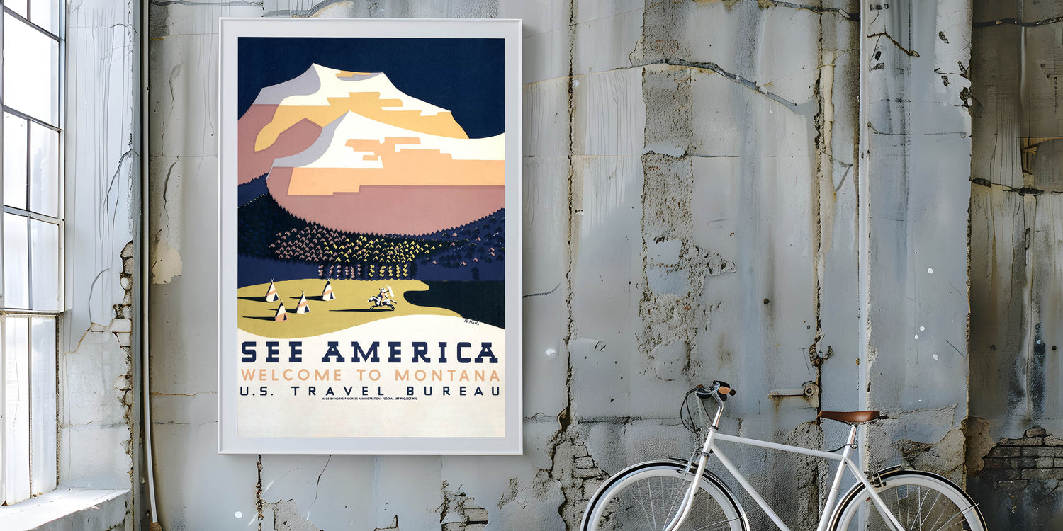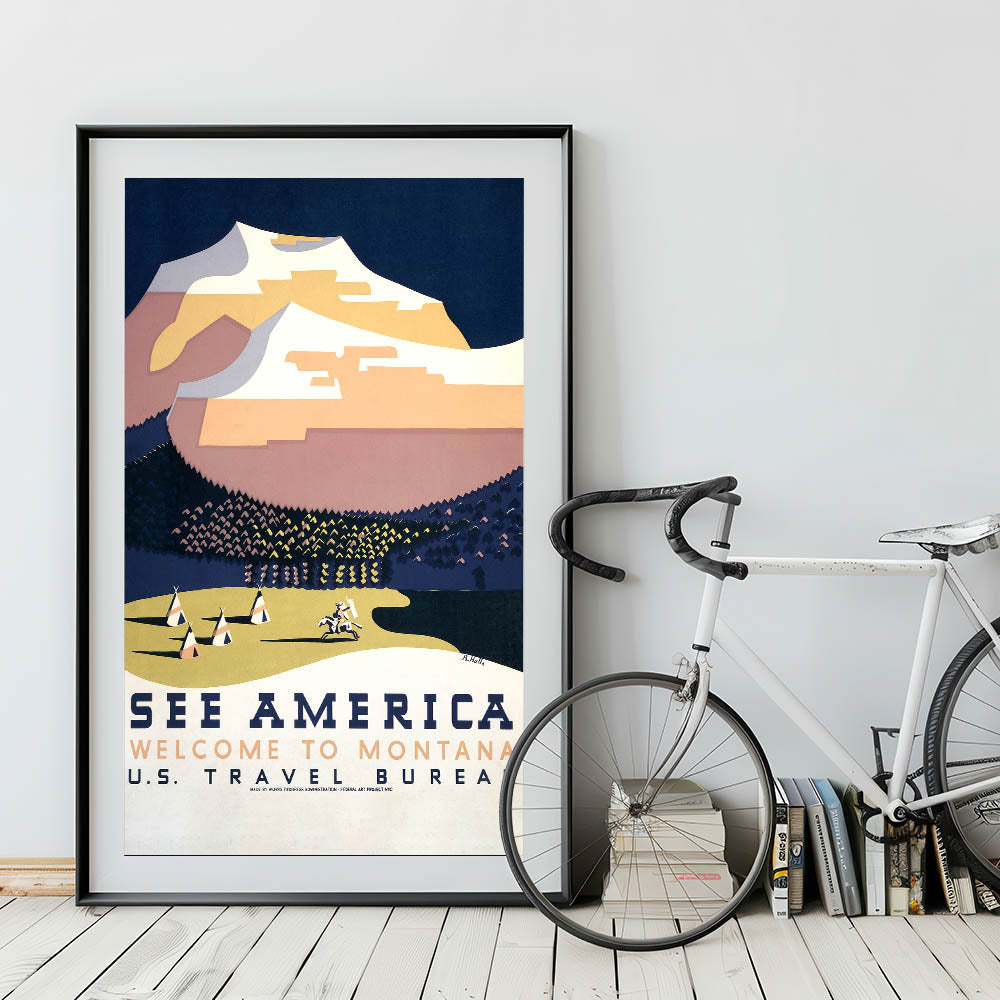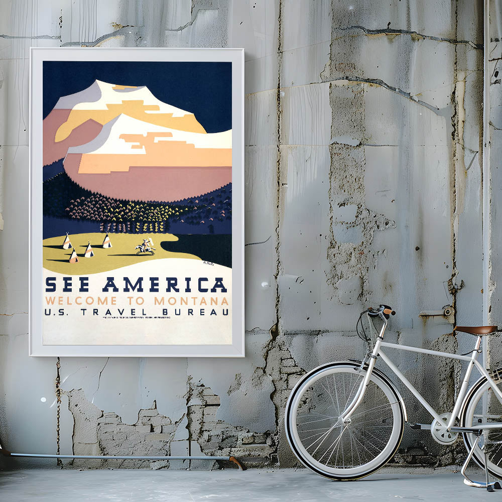 Explore the wild beauty of Montana with this vintage "See America" travel poster, featuring an iconic landscape of the state’s towering mountains and tranquil plains. The illustration beautifully captures the natural beauty of Montana, with Native American tipis and a cowboy riding across the open plains, showcasing the spirit of the American West. This vintage travel poster is perfect for anyone looking to bring the vast, untamed landscapes of Montana into their home. A nostalgic reminder of America’s natural wonders, it’s a must-have for nature lovers, vintage art enthusiasts, and anyone fascinated by the American frontier.