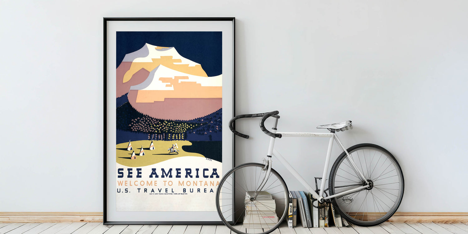 Add a touch of Montana’s wilderness to your space with this stunning vintage travel poster, a reminder of the great American adventure.