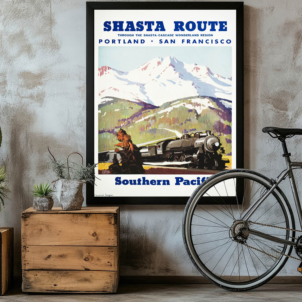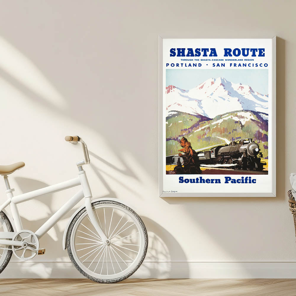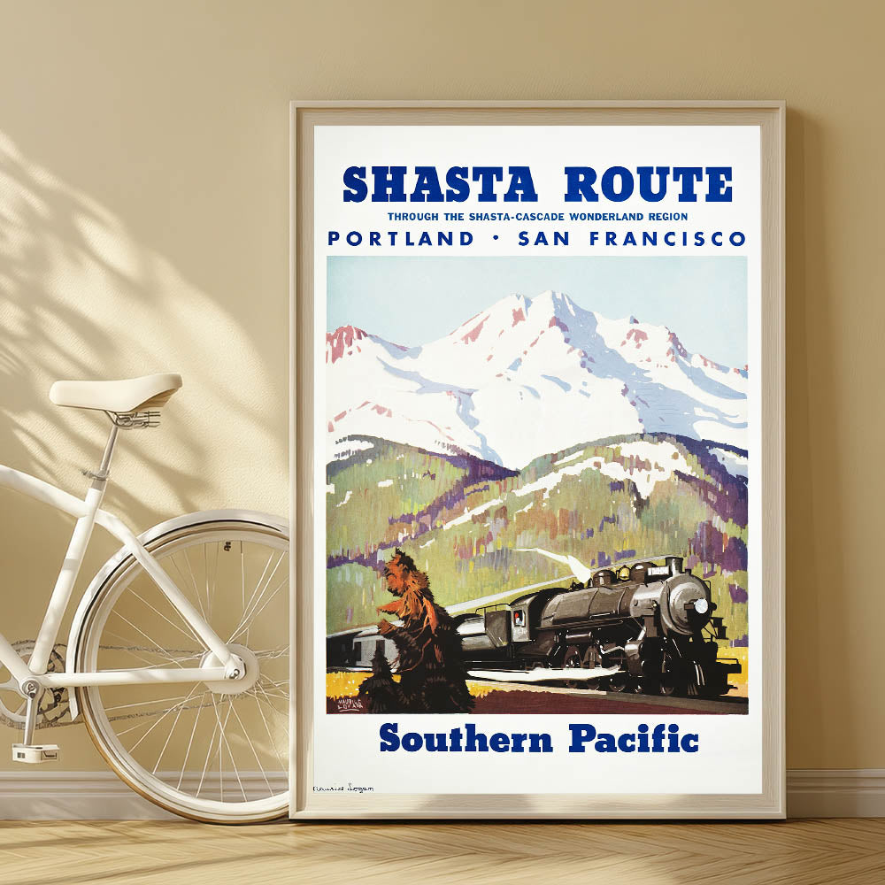 Shasta Route Vintage Travel Poster – Scenic Train Adventure Art