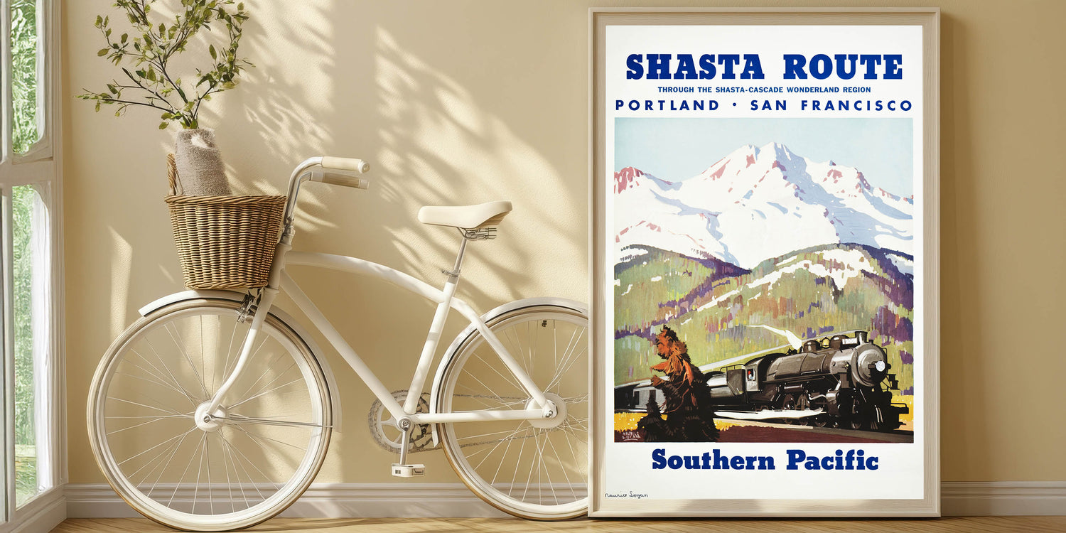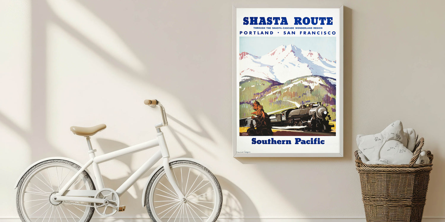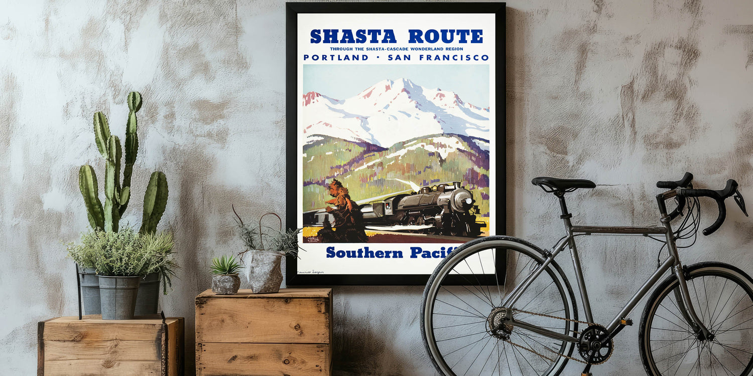 Shasta Route Vintage Travel Poster – Scenic Train Adventure Art