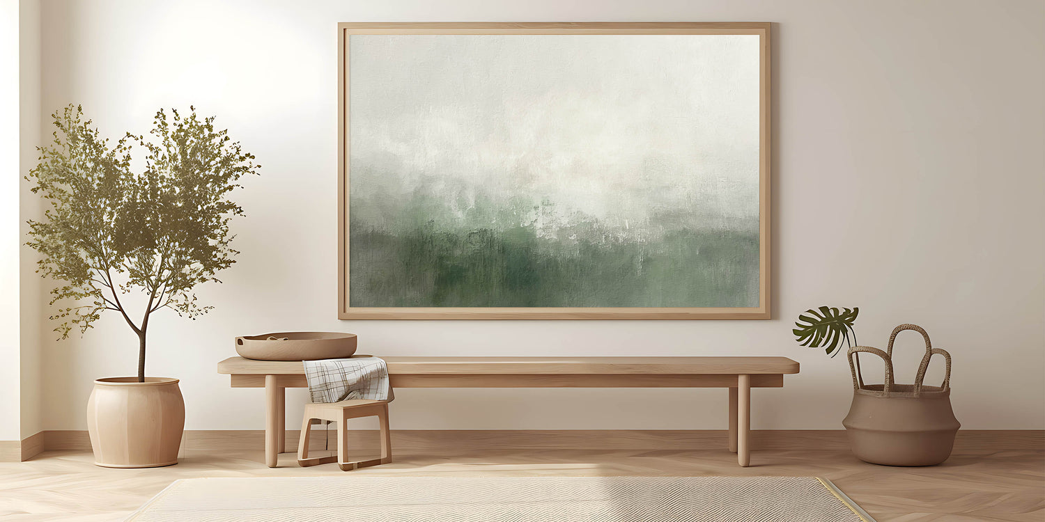 This beautiful abstract nature art is a great addition to living rooms, bedrooms, or meditation spaces, where a calm and refreshing ambiance is desired. The muted green tones and minimalist approach make it a versatile choice for various decor styles, enhancing the peaceful vibe of any setting.