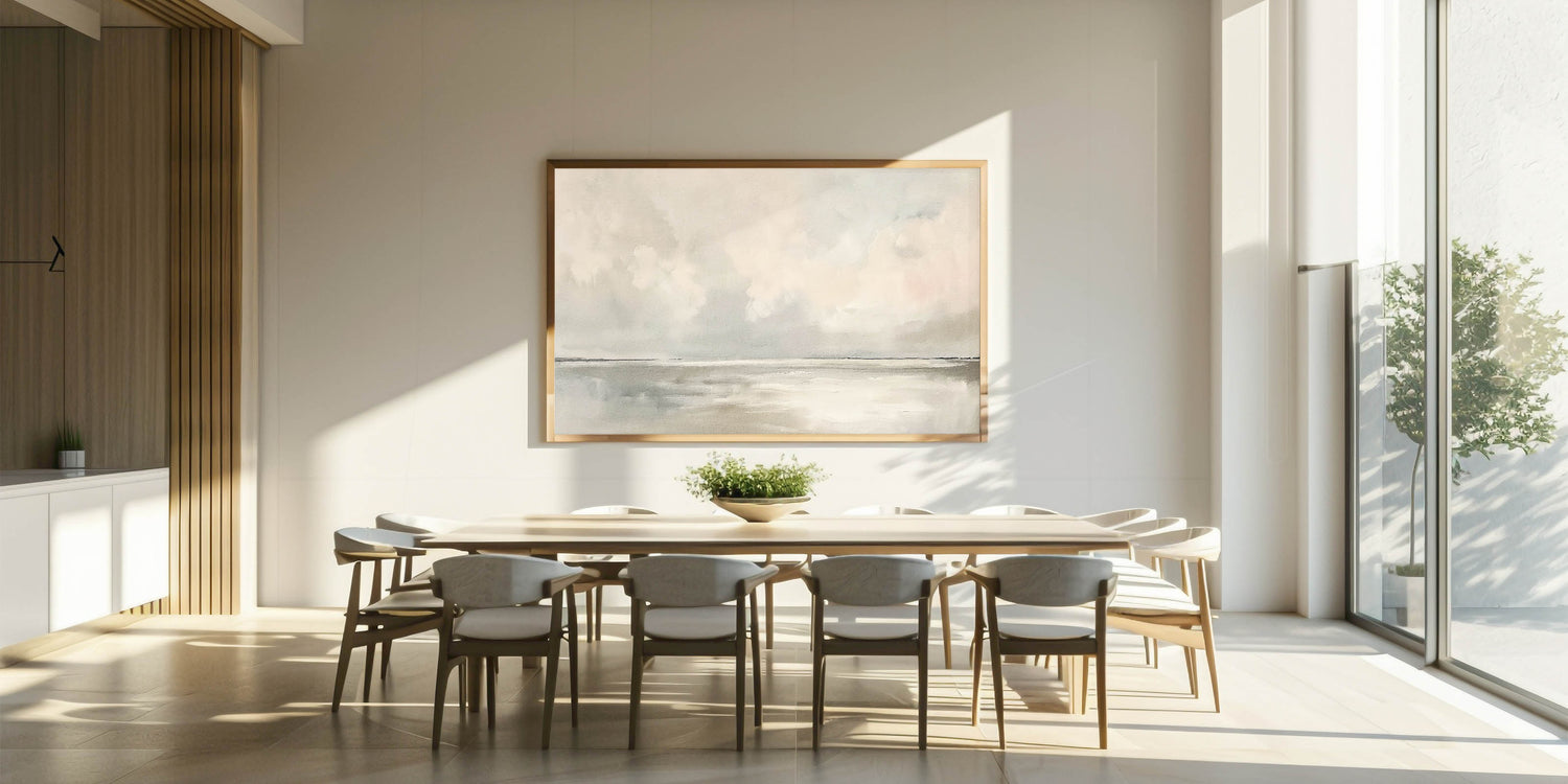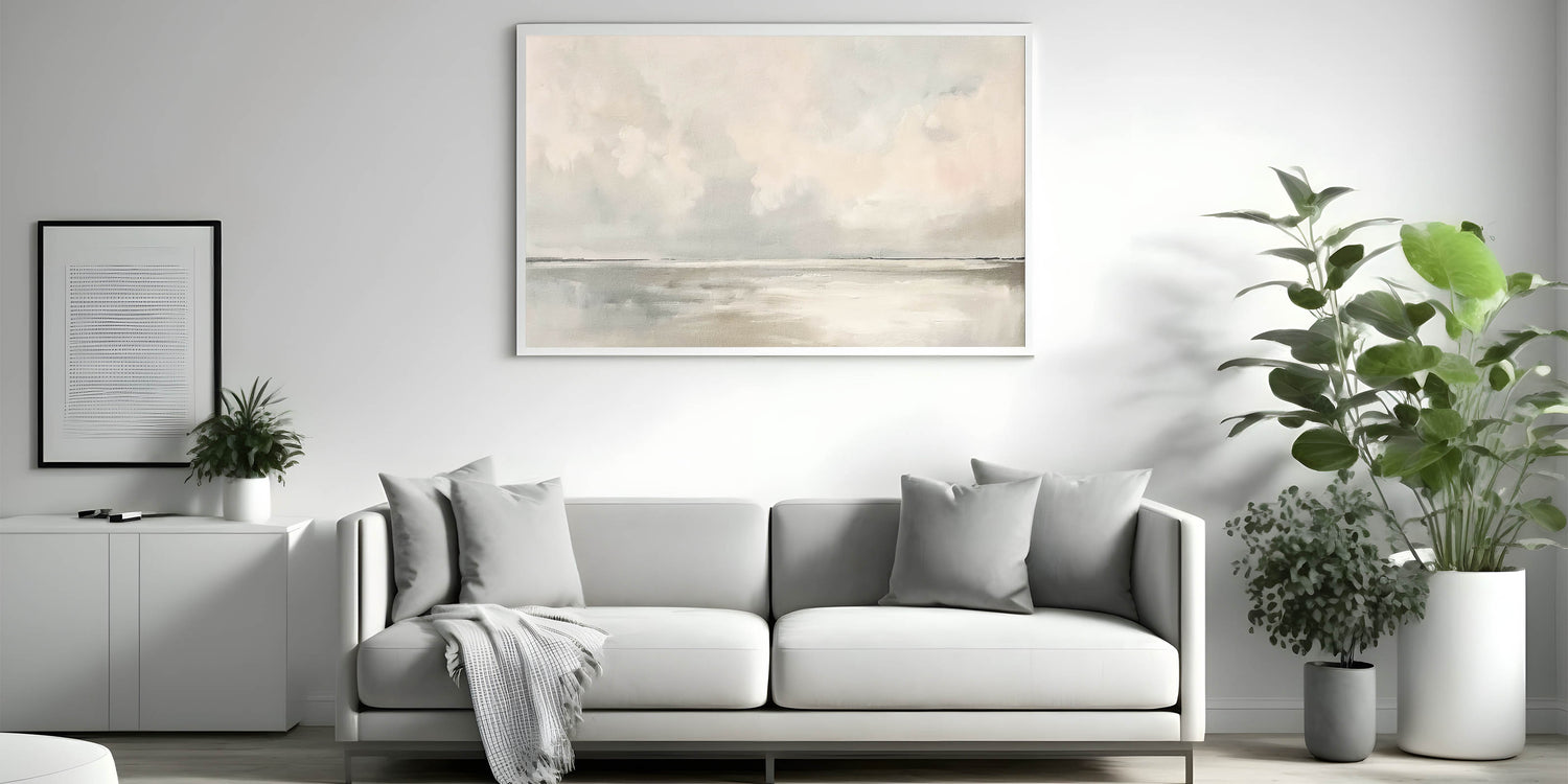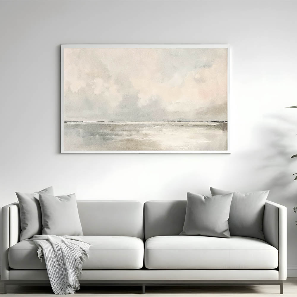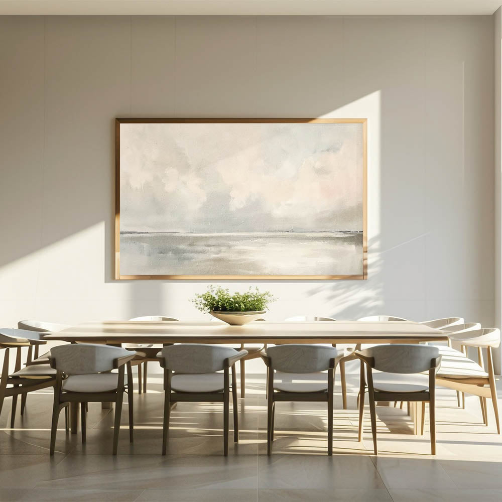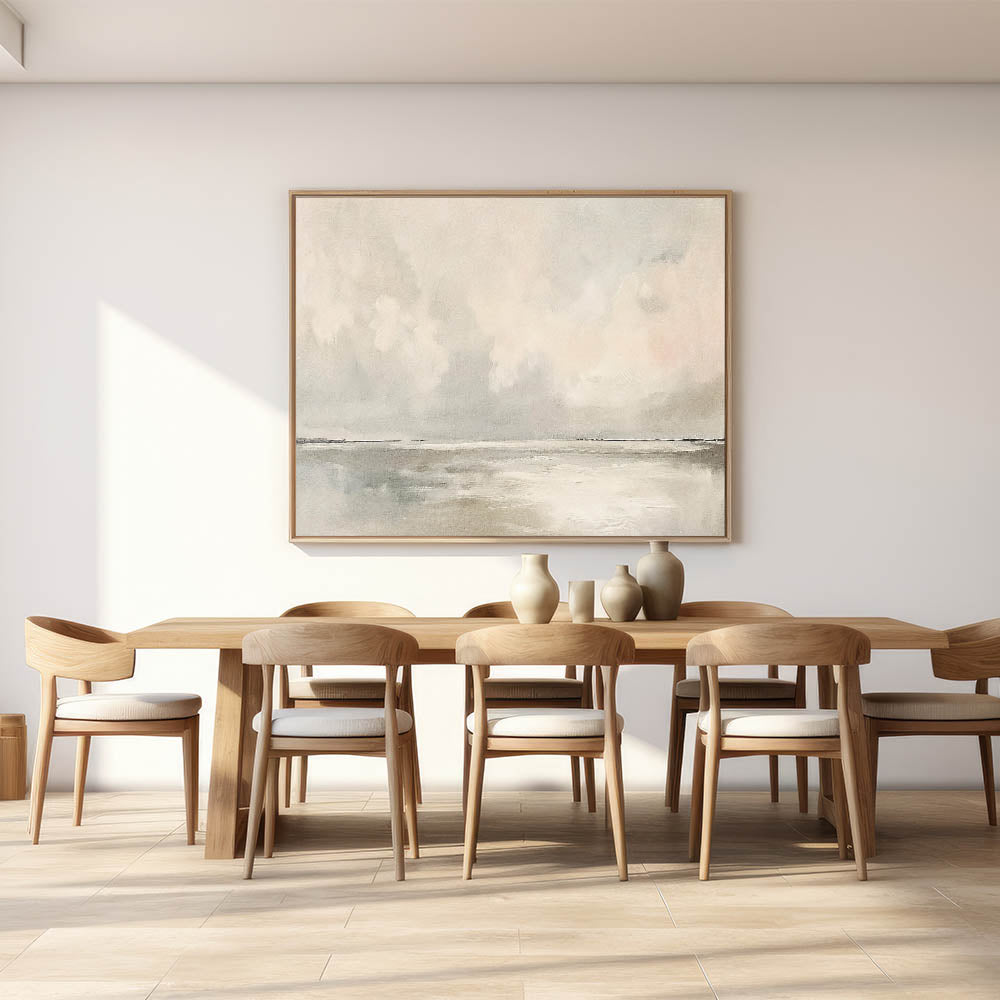 Bring a serene, minimalist touch to your home with this soft gray abstract landscape art. With gentle tones of gray, beige, and a hint of pastel pink, this artwork captures a tranquil atmosphere reminiscent of a misty morning by the water. Perfect for modern and contemporary decor, this piece adds a subtle elegance and a peaceful vibe to any space.