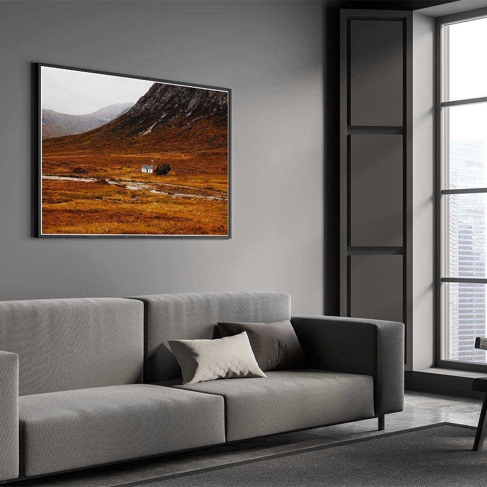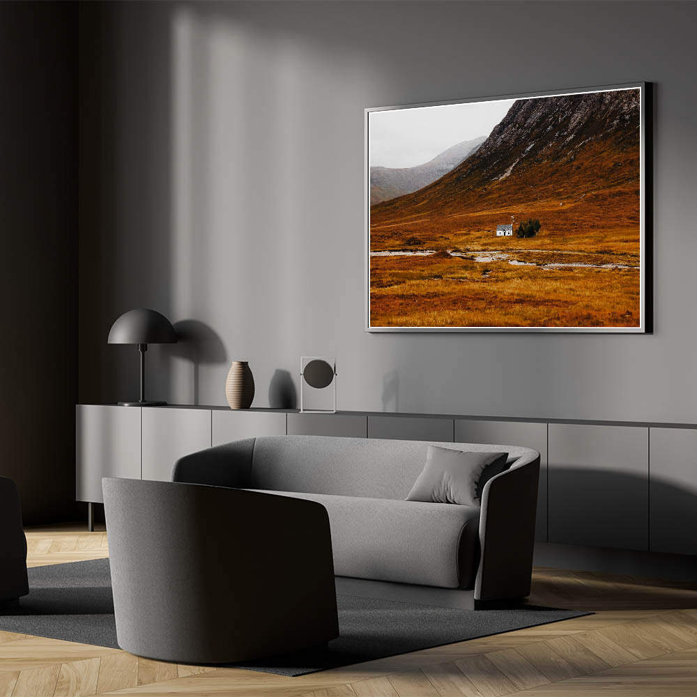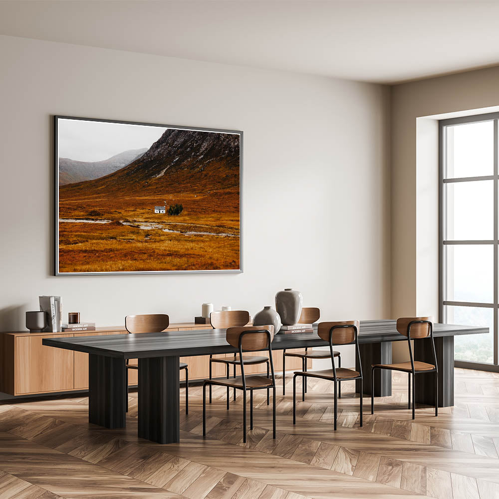 Capture the beauty of solitude and nature with this stunning wall art featuring a solitary white house in a vast golden valley. The contrast between the small, quaint house and the towering mountains behind it creates a powerful sense of peaceful isolation, making this piece ideal for adding a touch of rustic elegance to your home decor. The warm, golden tones of the landscape evoke feelings of autumn and nature’s beauty, making it perfect for farmhouse-inspired interiors. Whether displayed in a living room, bedroom, or hallway, this vintage-inspired print will add depth and serenity to any space.