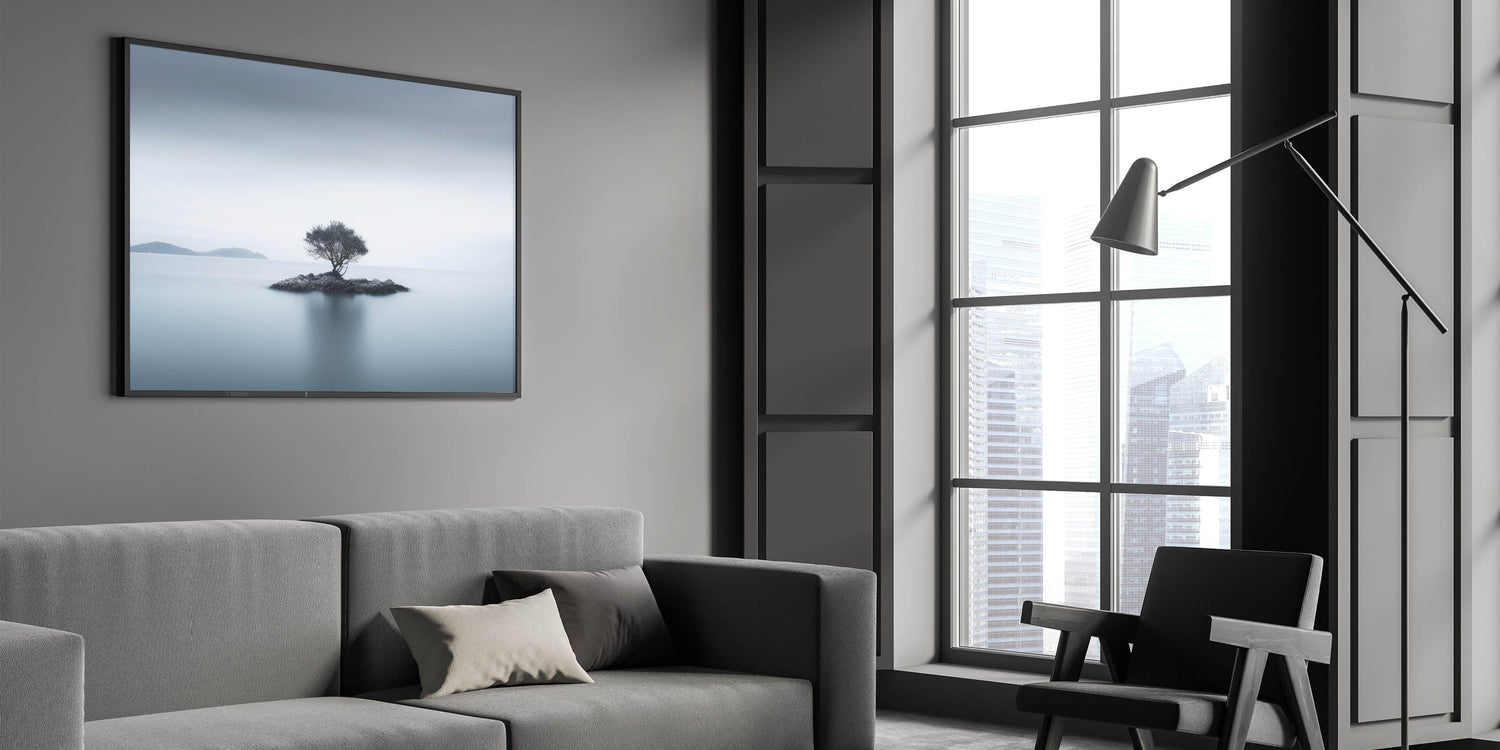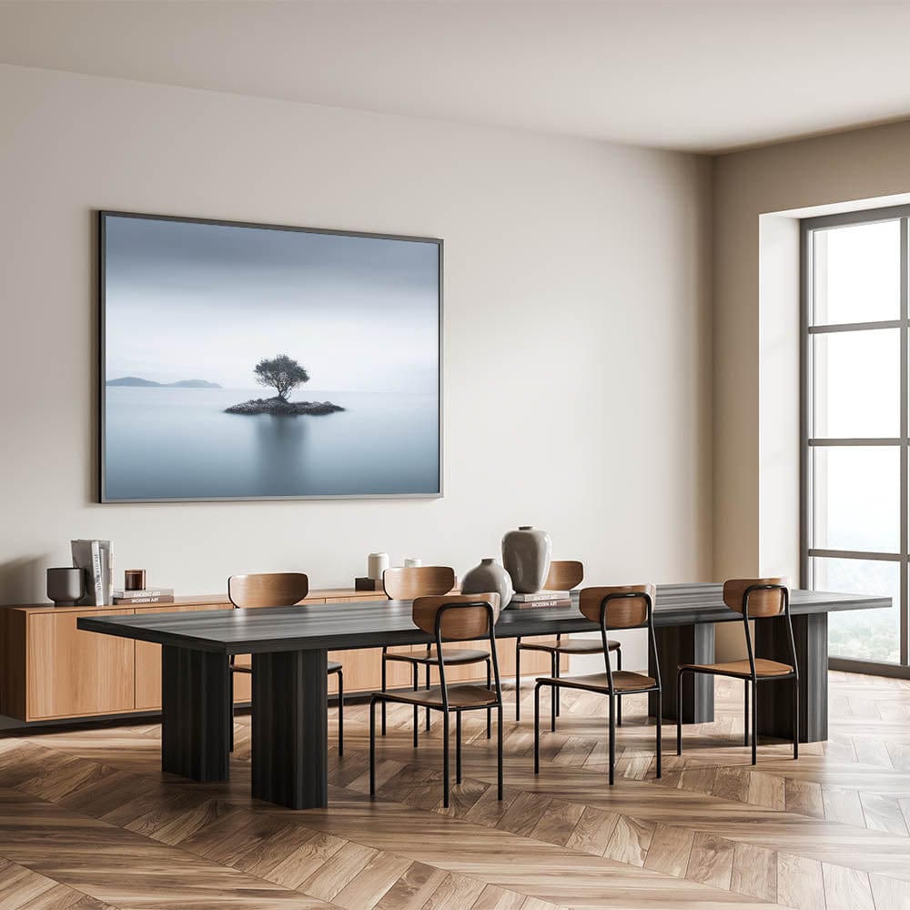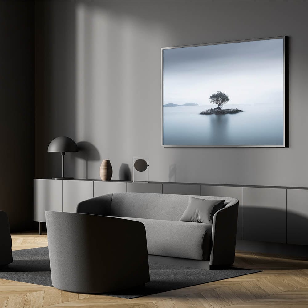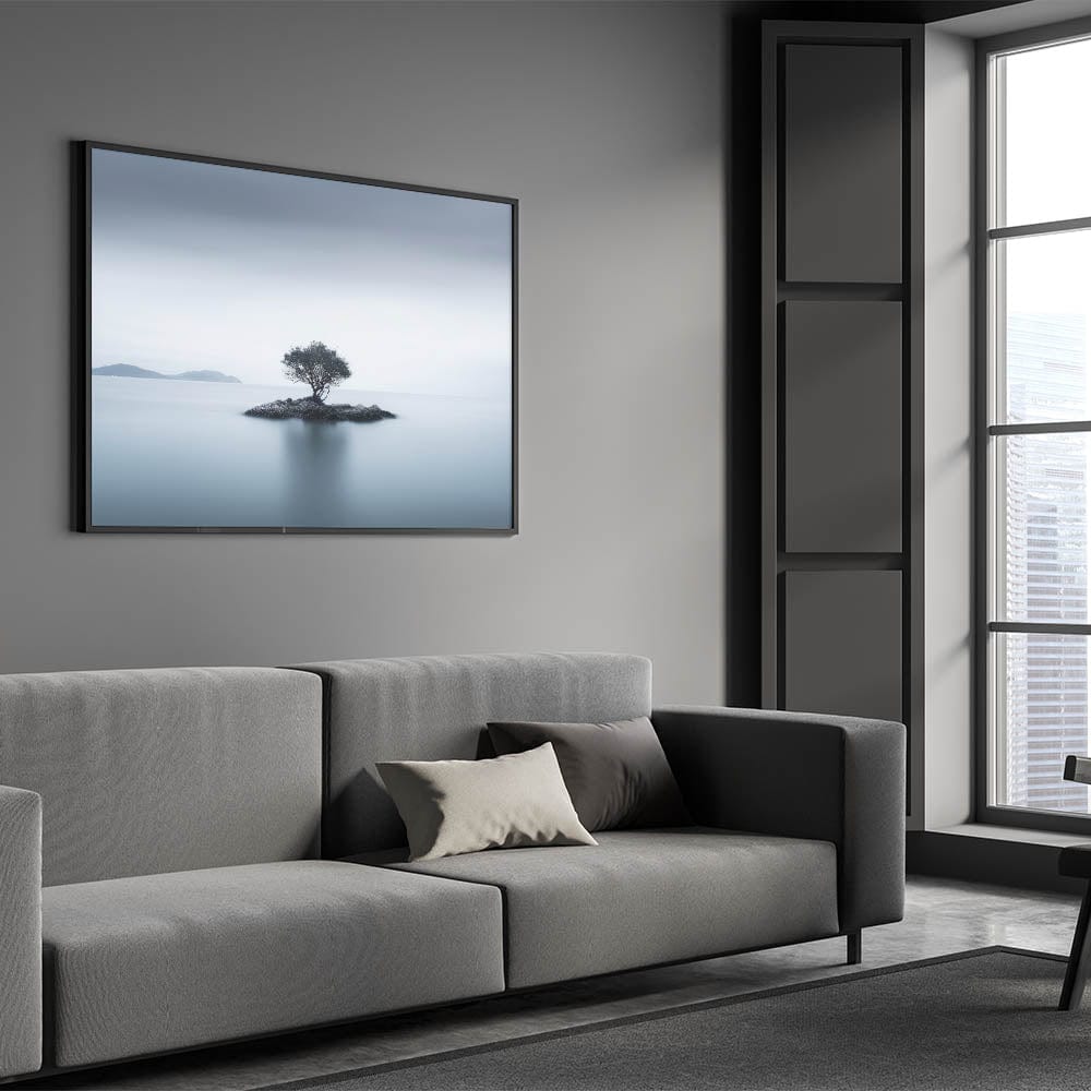 Discover the beauty of solitude with this breathtaking fine art photography acrylic print. Featuring a lone tree on a small rocky island, surrounded by a smooth, misty expanse of water, this image evokes a sense of calm, resilience, and isolation. The soft gray-blue hues and minimalist composition make it a stunning statement piece for contemporary interiors.