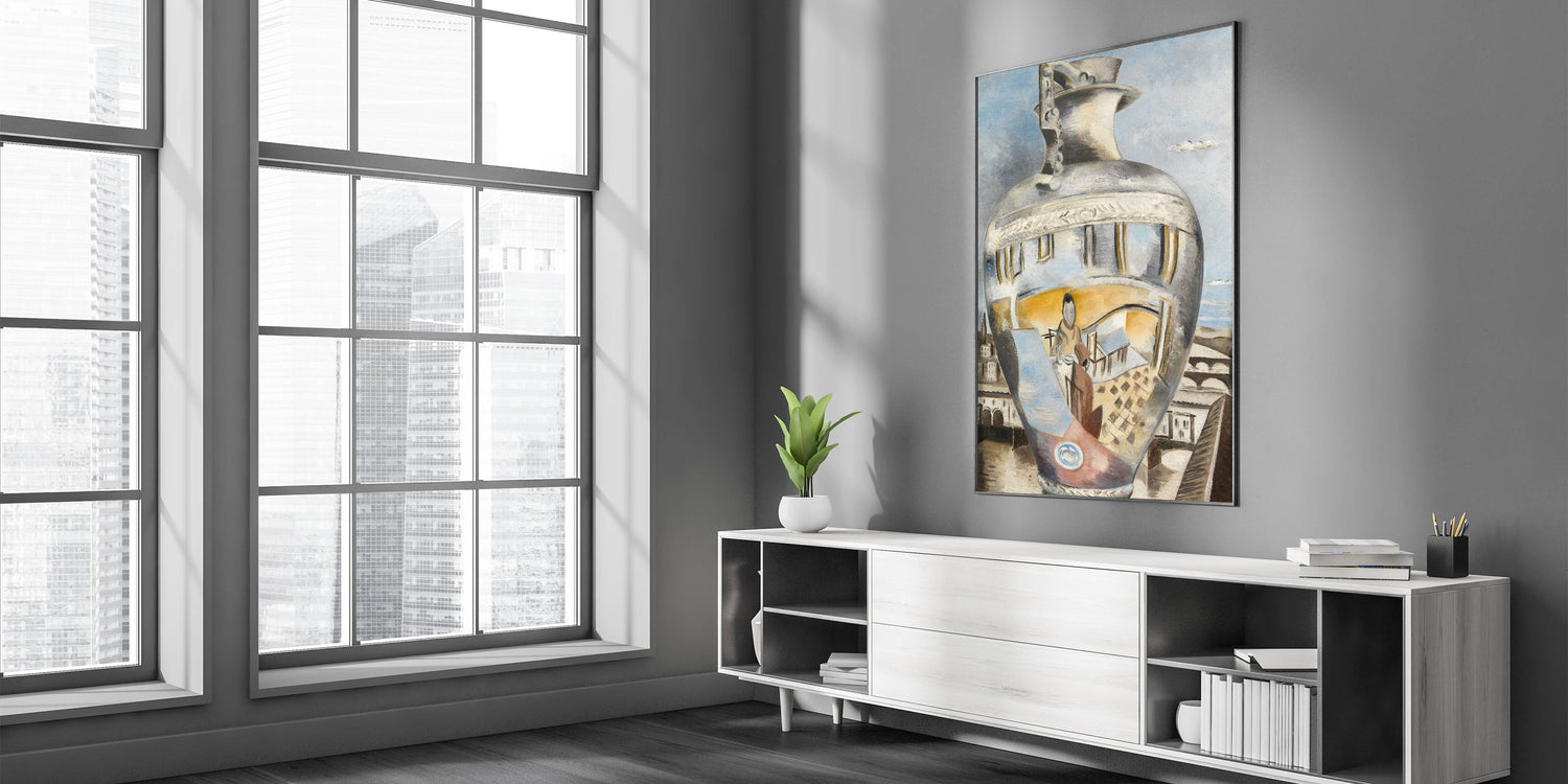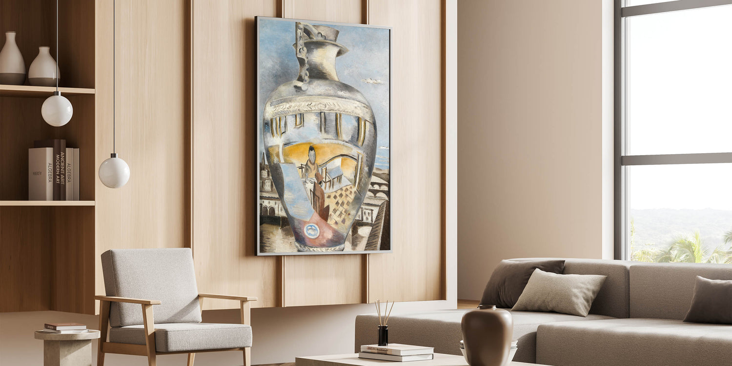 Experience the surreal charm of Paul Nash's Souvenir of Florence, a captivating artwork that merges still life with abstract reflections. This modern art print presents a silver vase that reflects scenes from Florence, creating a dreamlike fusion of architectural and organic elements. The muted color palette of silver, blue, and earthy tones adds an air of sophistication, making it a perfect choice for contemporary and minimalist interiors. Ideal for art enthusiasts, this piece encapsulates both modern aesthetics and Nash's unique approach to surrealism.