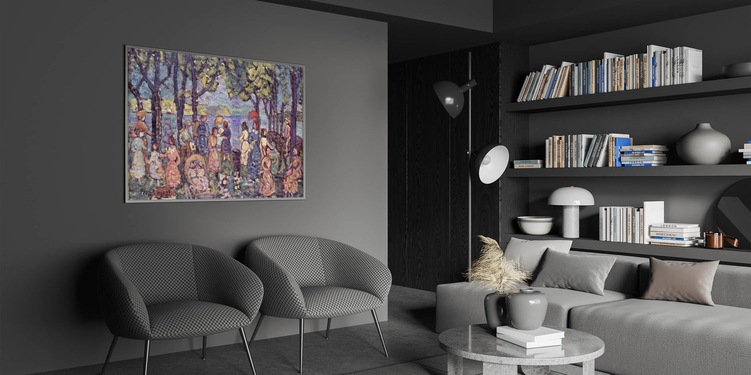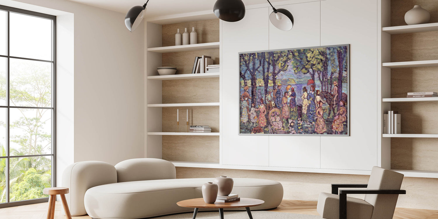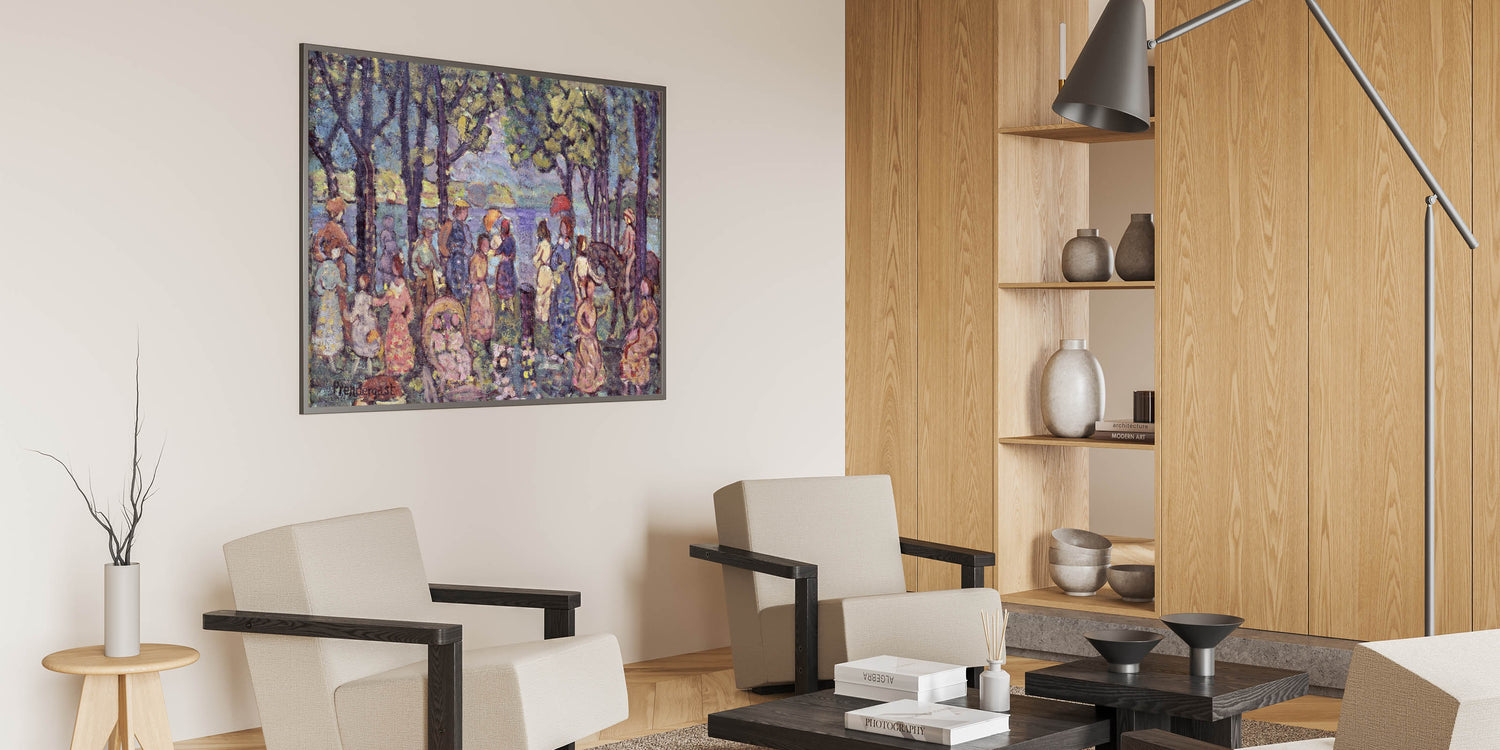 Infuse your space with the lively charm of "Summer in New England," a captivating piece of modern wall art by Maurice Prendergast. This vibrant artwork captures a joyful scene of people enjoying a sunny day by the water, surrounded by lush greenery and colorful attire. Perfect for trendy home decor, it evokes warmth, energy, and nostalgia, making it an ideal addition to your collection.