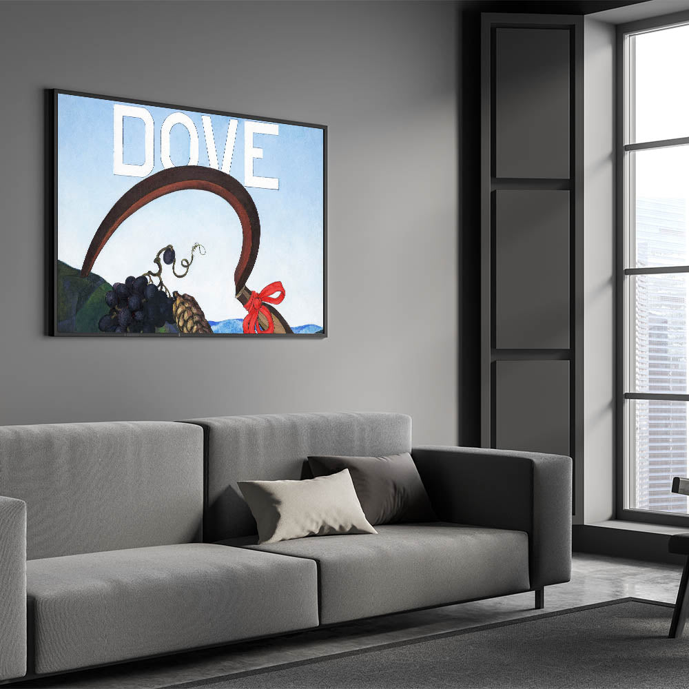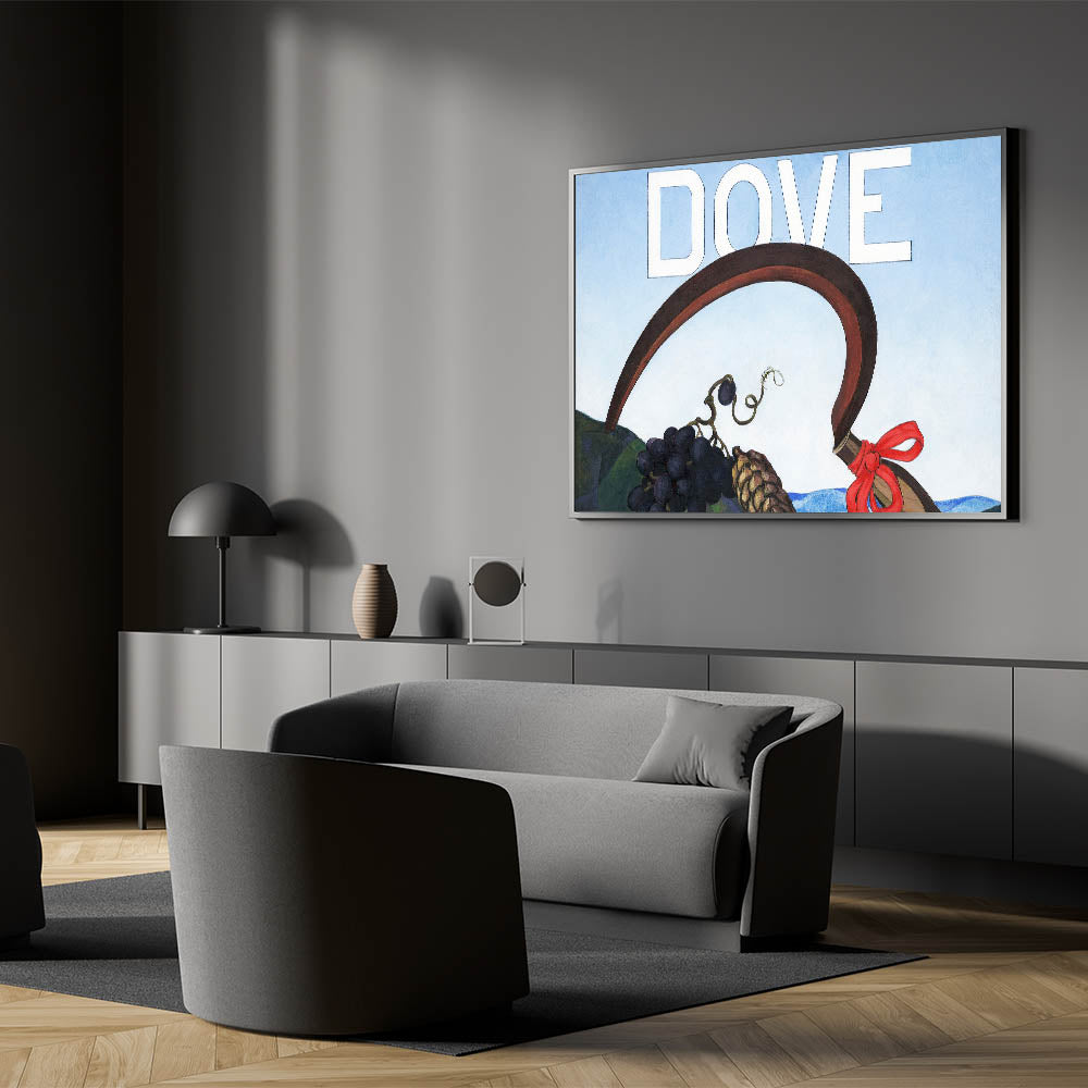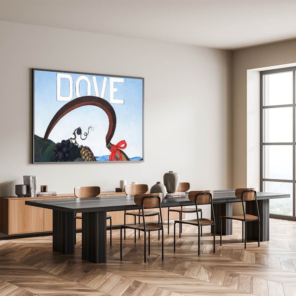 Make a statement with this symbolic wall art, featuring a bold design with grapes, a sickle, and a vivid red ribbon against a blue sky. This artwork, titled "Dove," is ideal for those who appreciate modern decor with deeper symbolic meanings, adding a touch of sophistication and intrigue to any space.
