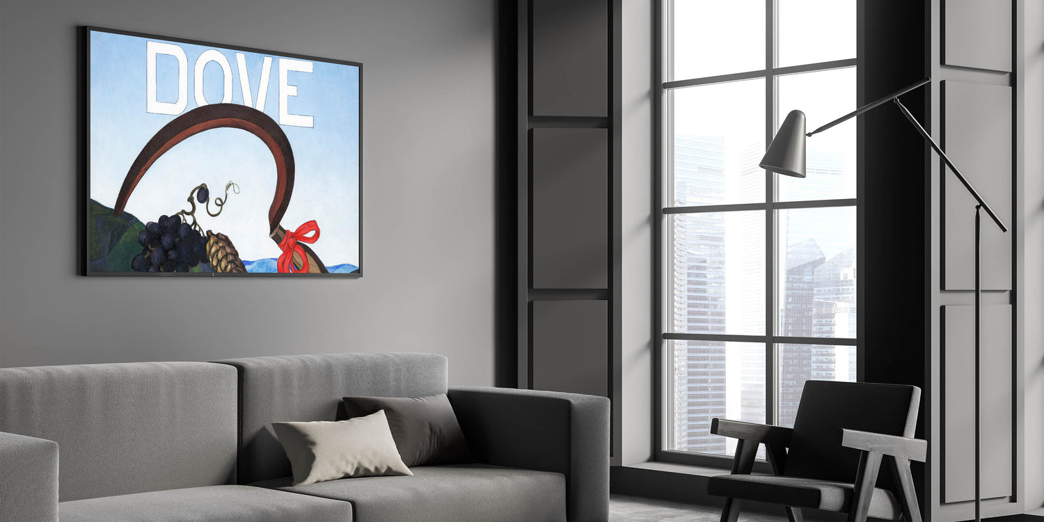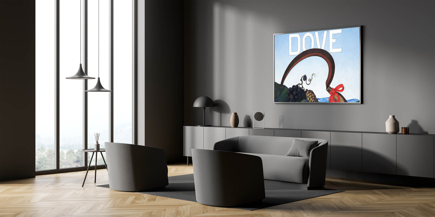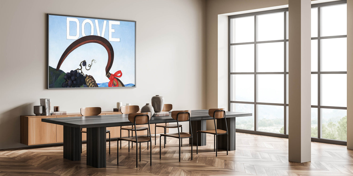 Make a statement with this symbolic wall art, featuring a bold design with grapes, a sickle, and a vivid red ribbon against a blue sky. This artwork, titled "Dove," is ideal for those who appreciate modern decor with deeper symbolic meanings, adding a touch of sophistication and intrigue to any space.