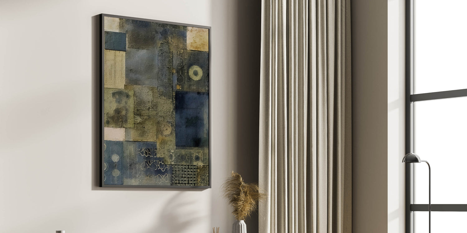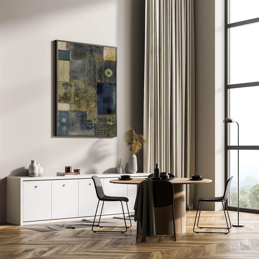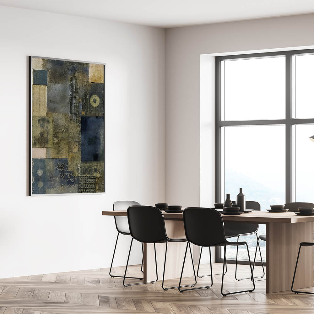 Elevate your space with this textured abstract wall art that captures an industrial rustic aesthetic through its layered patterns and muted tones. The earthy blend of dark blues, grays, and olive greens creates a calming, sophisticated look that’s perfect for farmhouse and rustic decor styles.