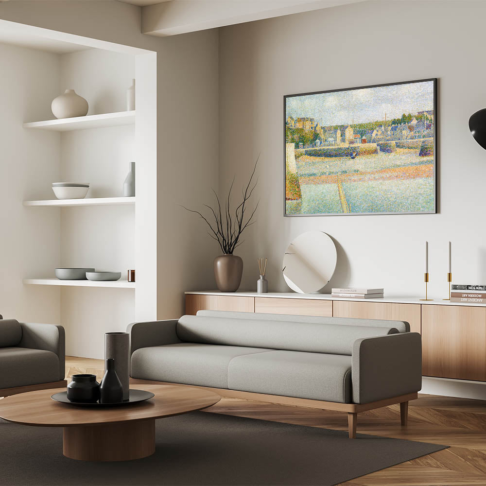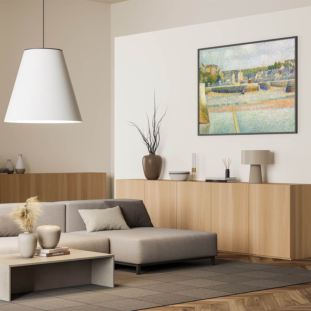 Bring the charm of a coastal village into your home with Georges Seurat’s "The Outer Harbor." This Impressionist masterpiece captures a peaceful seaside town through Seurat’s signature pointillism technique, where countless dots of color create a vibrant, textured scene. The artwork depicts a sunlit harbor surrounded by charming houses and gentle waves, evoking a sense of calm and timeless beauty. Perfect for those who love coastal art and Impressionism, this piece makes a stunning addition to any decor.
