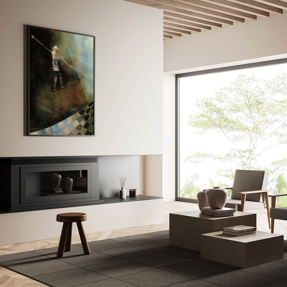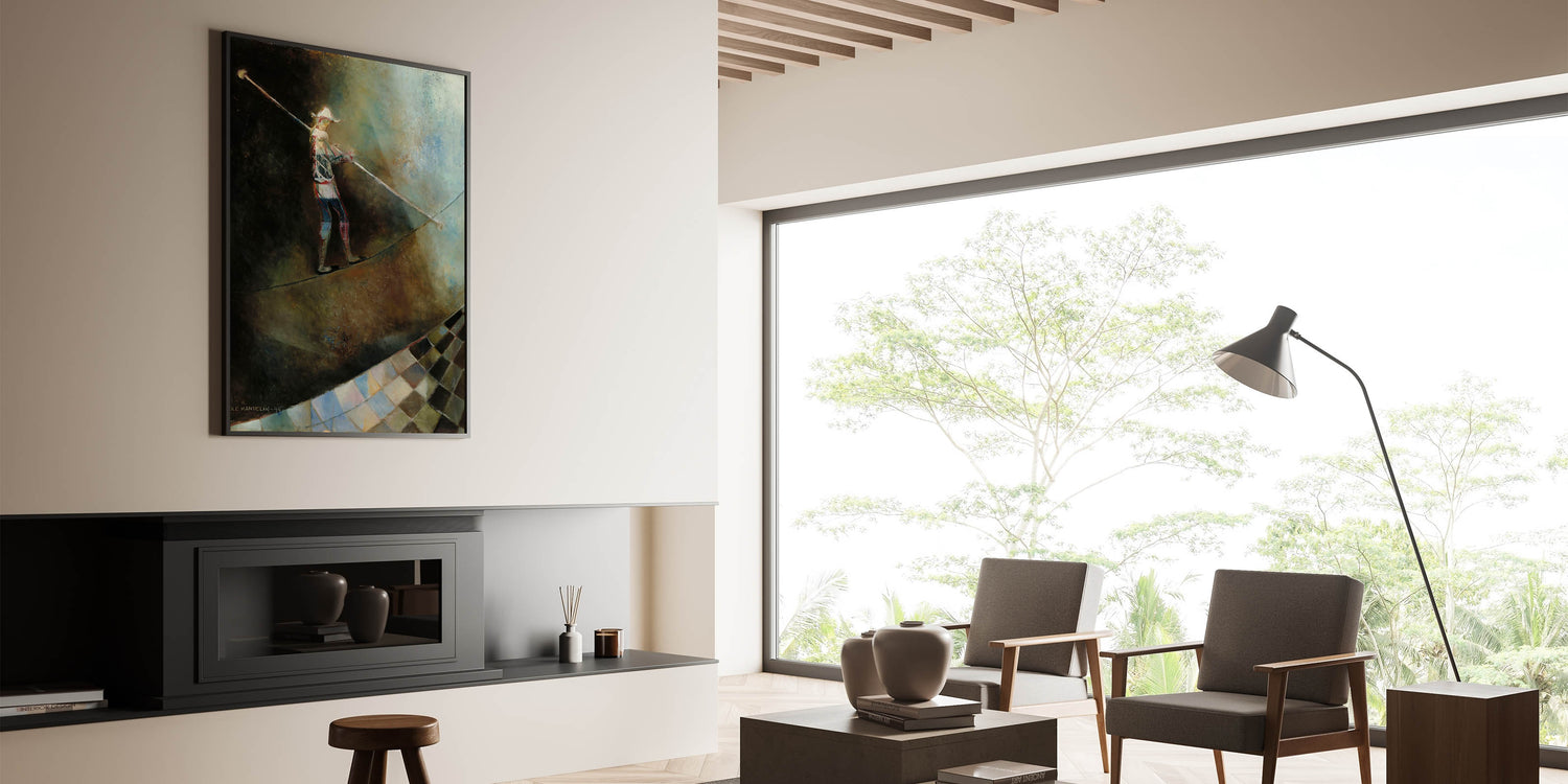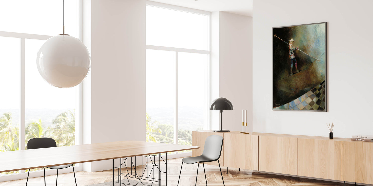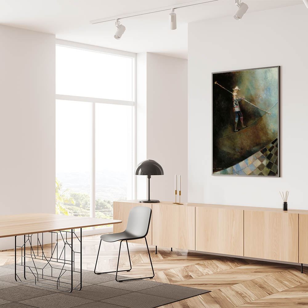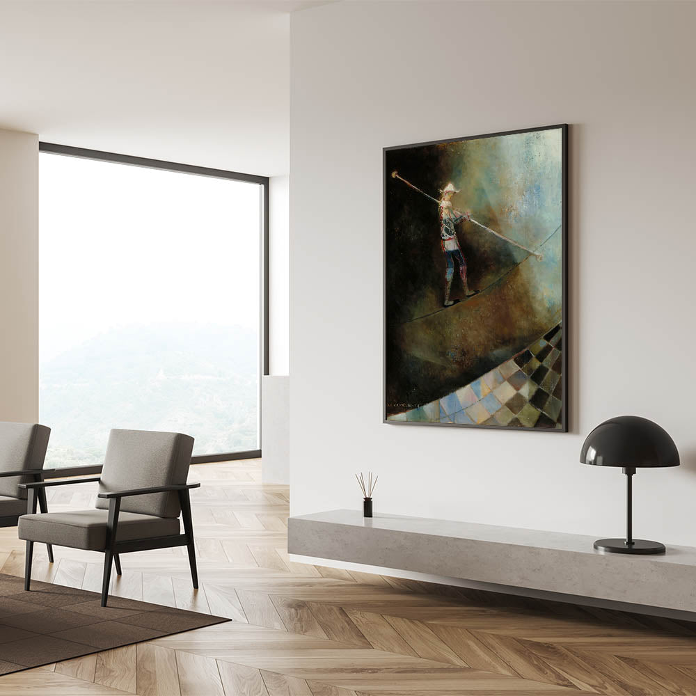 Add intrigue and movement to your space with "The Rope Dancer Modern Wall Art" by Ole Kandelin. This captivating artwork depicts a tightrope walker balancing delicately above a patterned floor, surrounded by moody, ethereal tones of gold, brown, and blue. With its dynamic composition and dreamlike quality, this piece is perfect for lovers of modern and surrealist art, adding a touch of mystery and elegance to any interior.