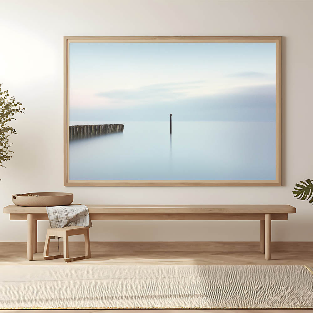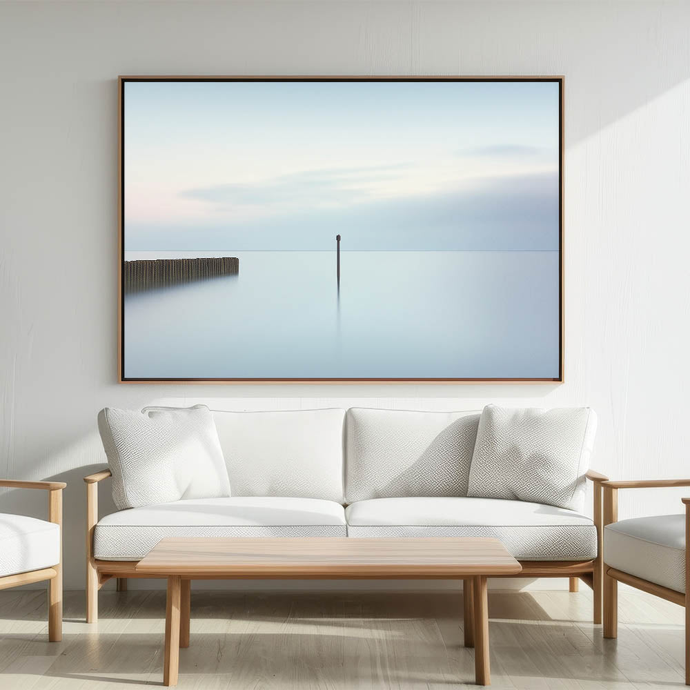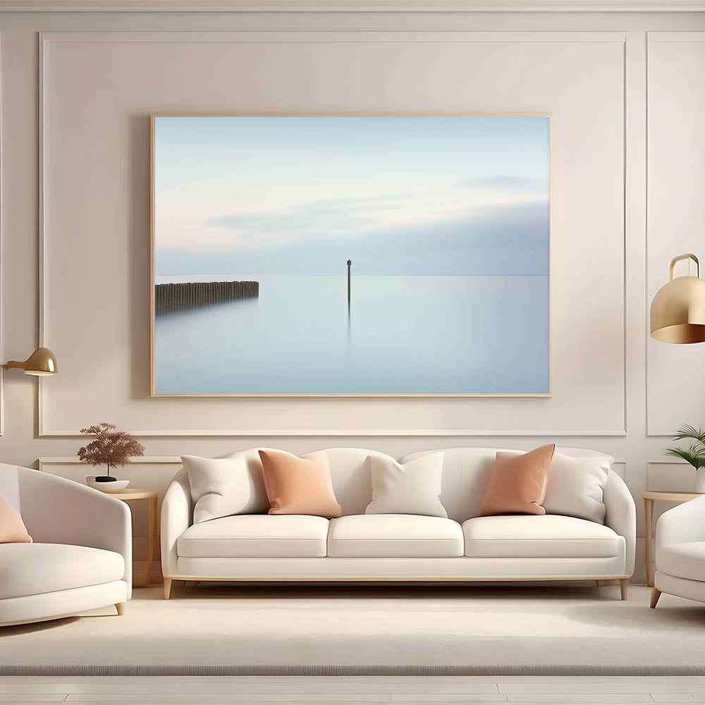 Transform your space with Tranquil Horizon, a minimalist abstract seascape artwork that captures the peaceful beauty of an infinite horizon. The composition features a still, reflective ocean with soft pastel hues blending seamlessly into the sky, interrupted only by a lone marker and subtle shoreline. This artwork is perfect for modern, coastal, or minimalist interiors, evoking a sense of calm and balance.
