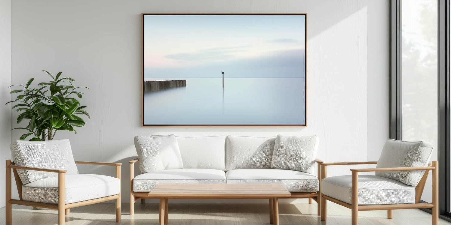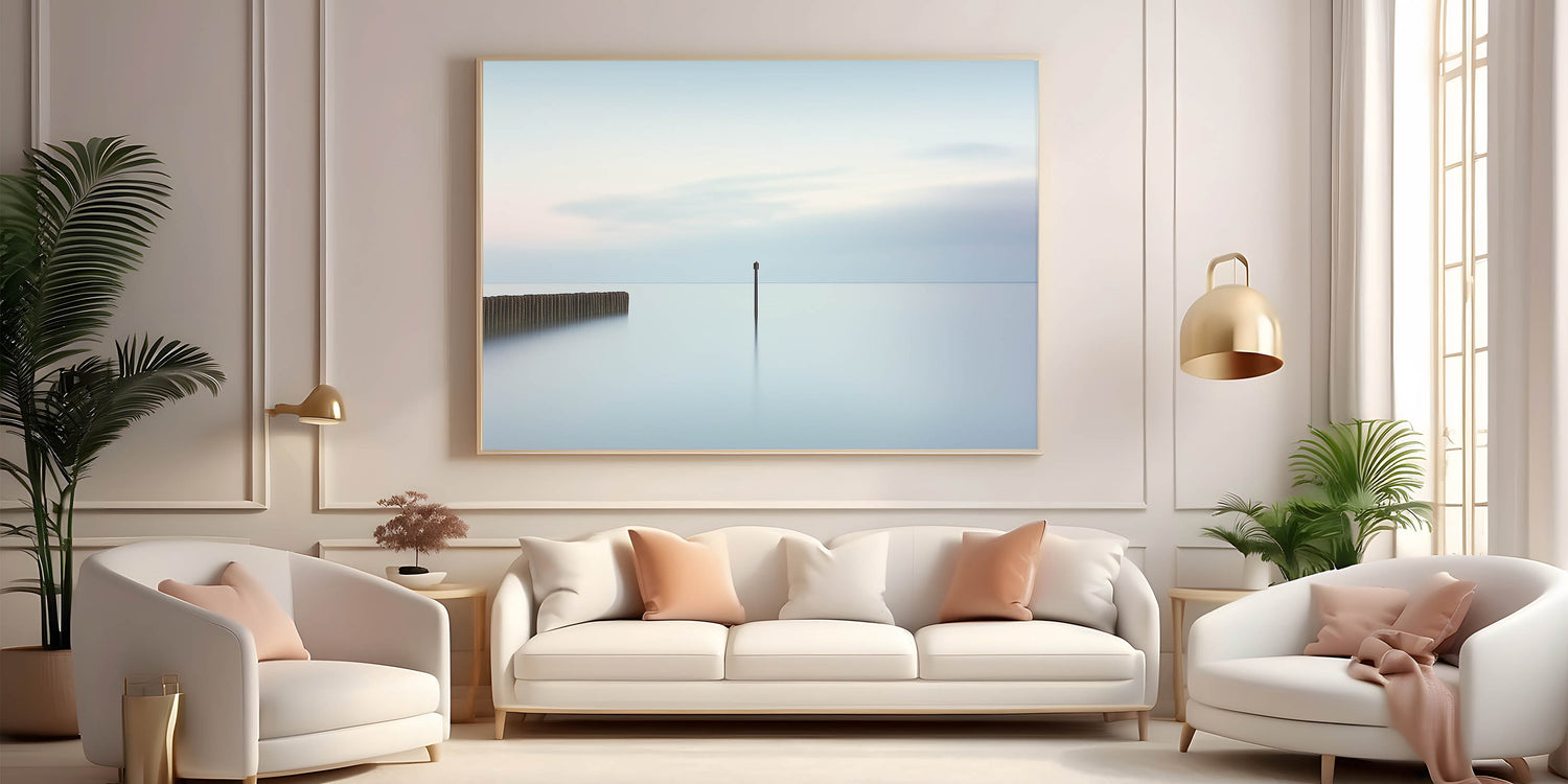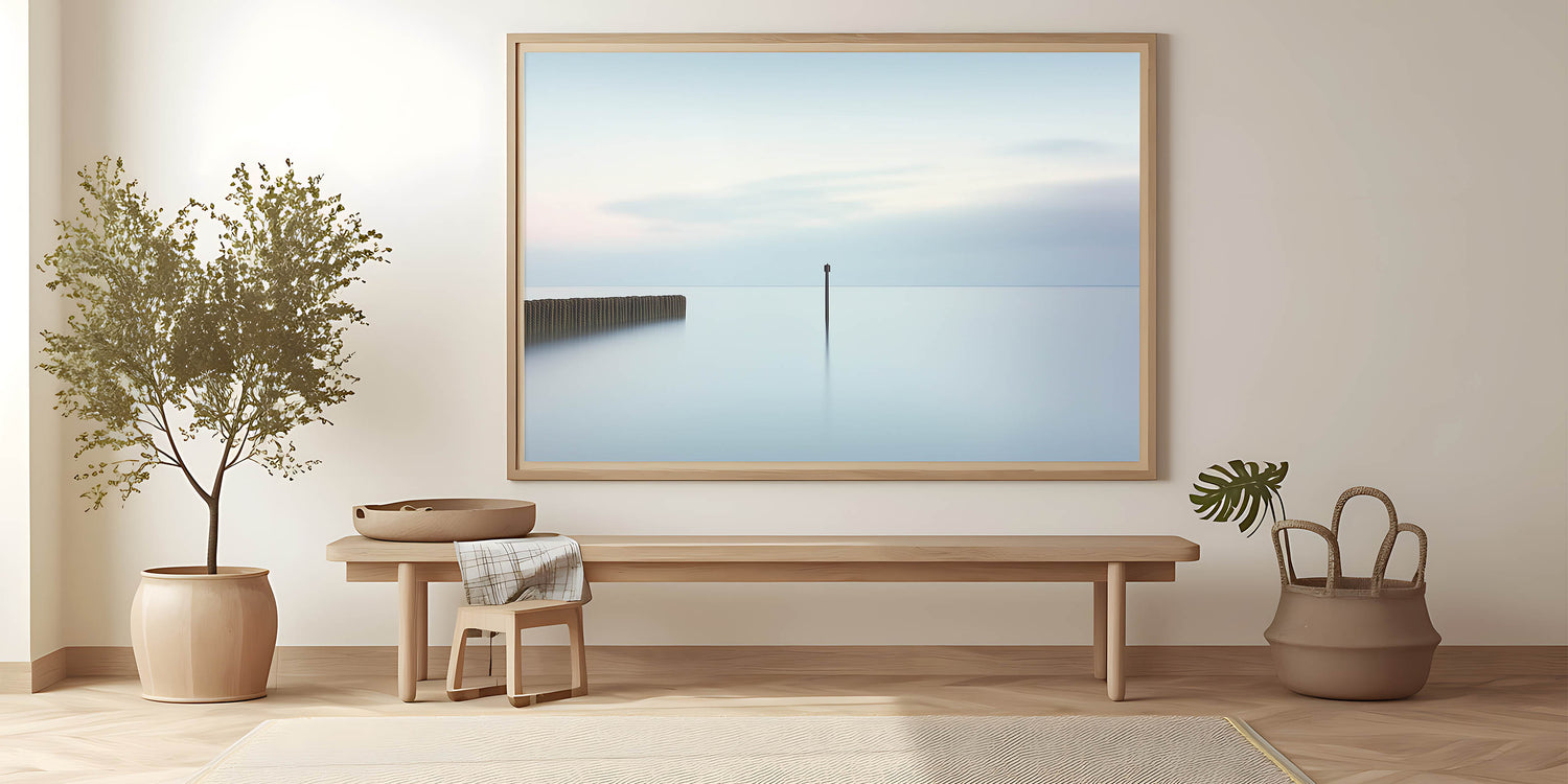 Transform your space with Tranquil Horizon, a minimalist abstract seascape artwork that captures the peaceful beauty of an infinite horizon. The composition features a still, reflective ocean with soft pastel hues blending seamlessly into the sky, interrupted only by a lone marker and subtle shoreline. This artwork is perfect for modern, coastal, or minimalist interiors, evoking a sense of calm and balance.