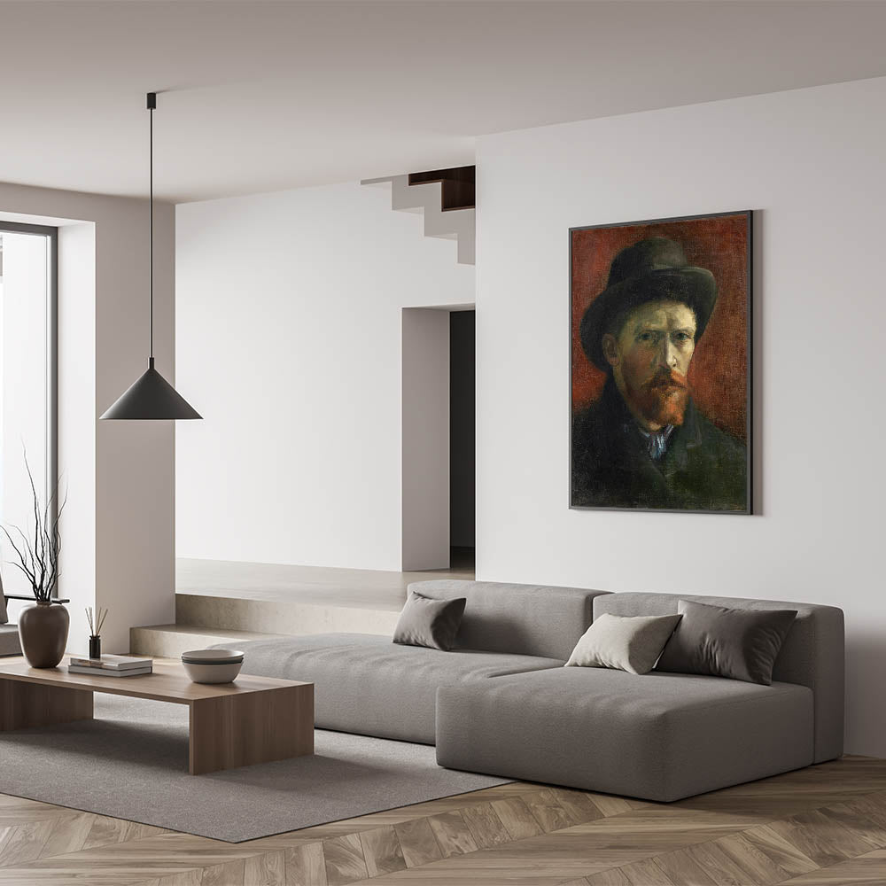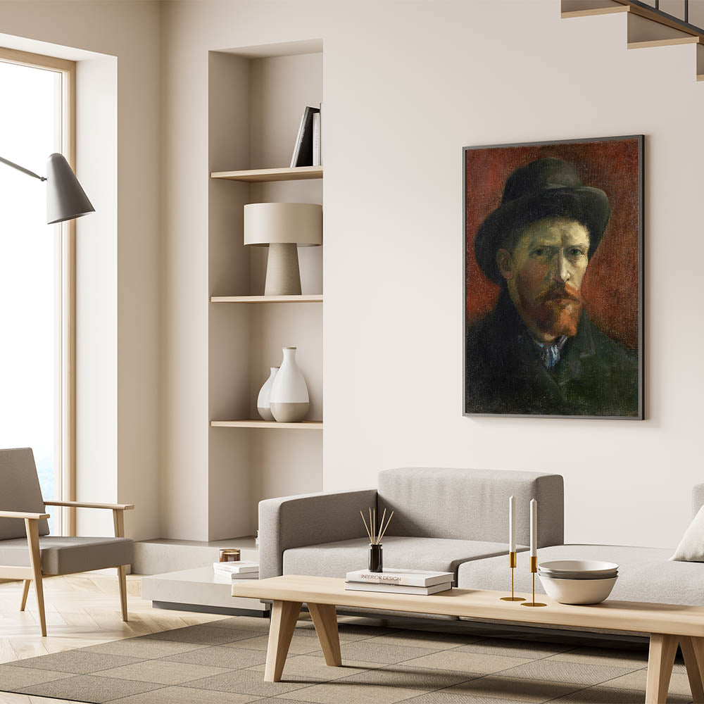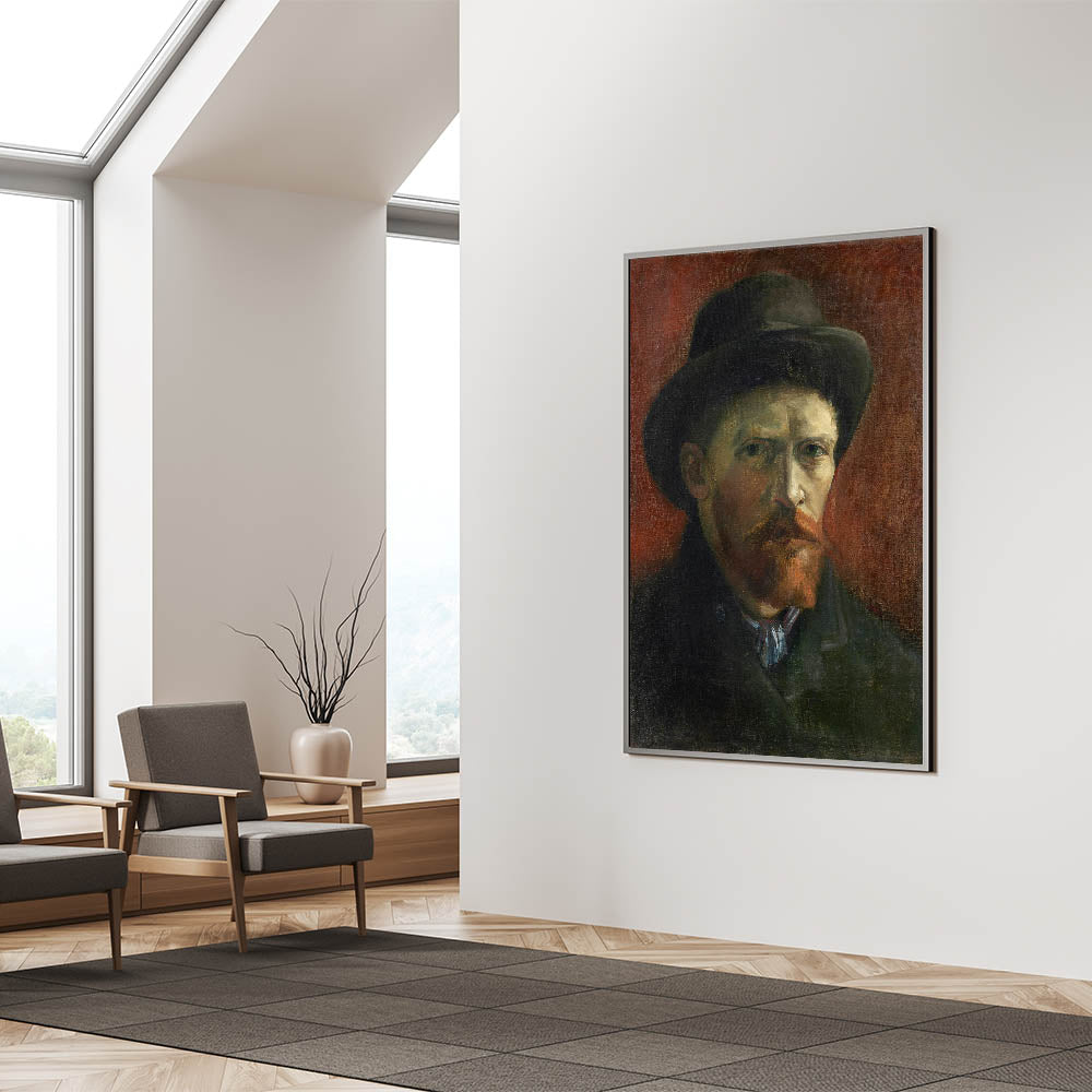 Step into the world of Vincent van Gogh with this striking 1886 self-portrait featuring a dark felt hat. This early Impressionist work exudes a somber yet captivating aura, highlighting Van Gogh’s introspective nature. The deep tones of the hat and coat are contrasted with warm reds and subtle light accents, creating a masterpiece of dramatic lighting and shadow.