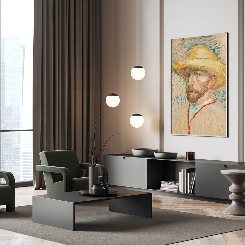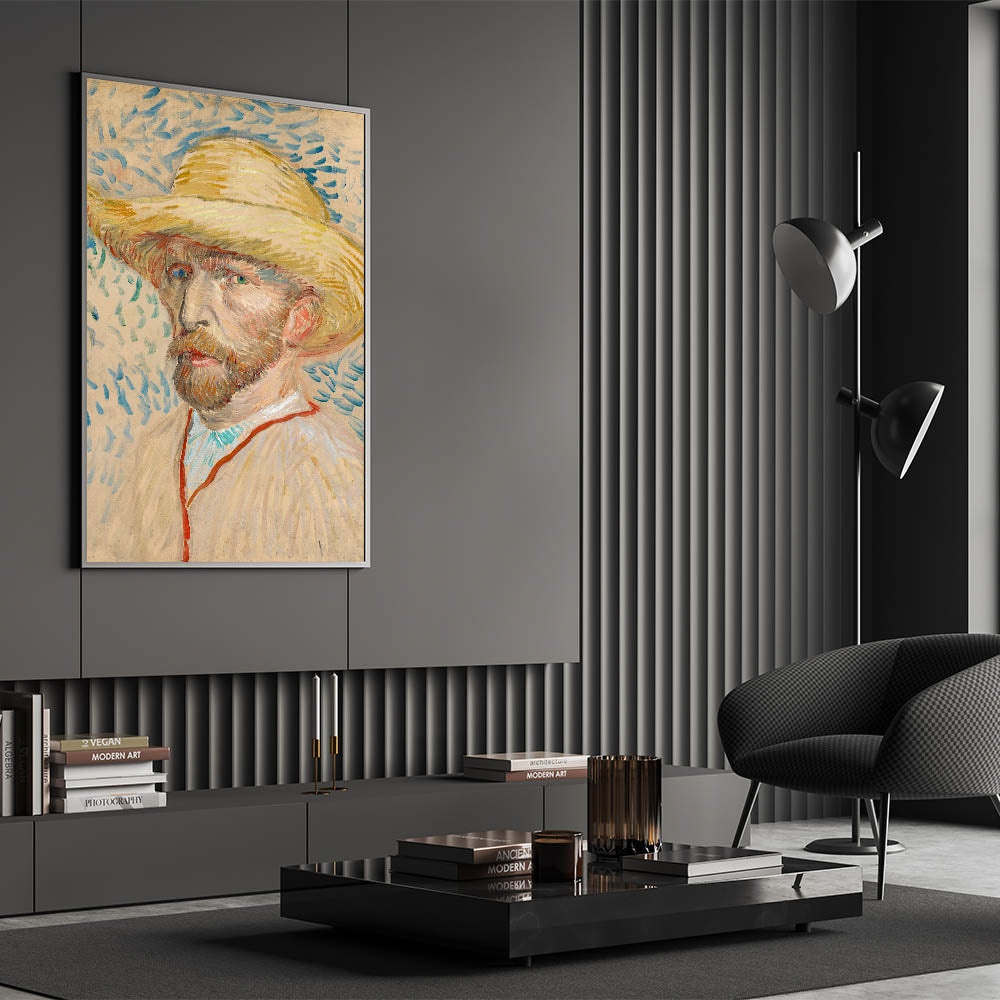 Discover the charm of Impressionism with Vincent van Gogh’s 1887 self-portrait featuring a straw hat. This masterpiece embodies Van Gogh’s distinctive style, showcasing textured brushstrokes and a harmonious blend of soft yellows and blues. The warm tones of the straw hat contrast beautifully with the vibrant, rhythmic background, creating a dynamic and captivating composition.