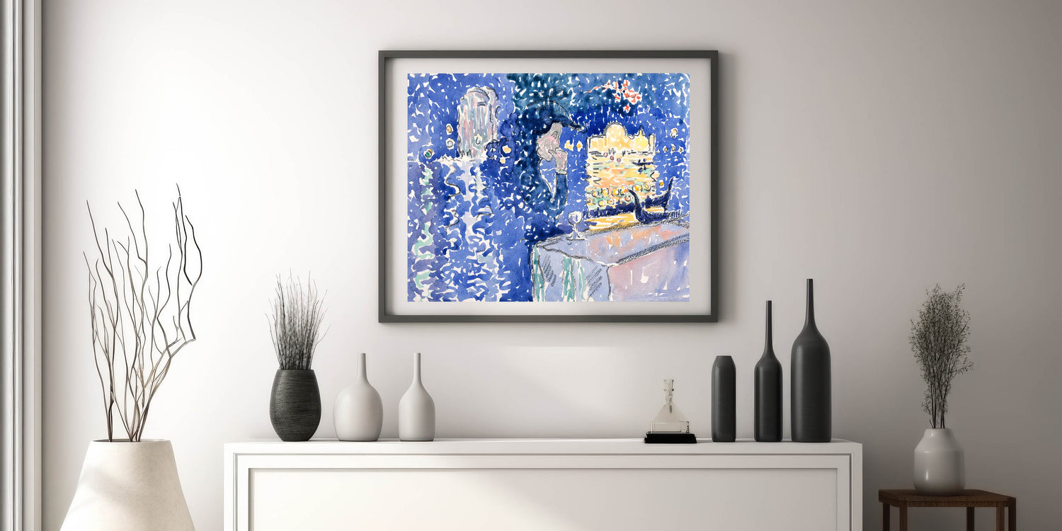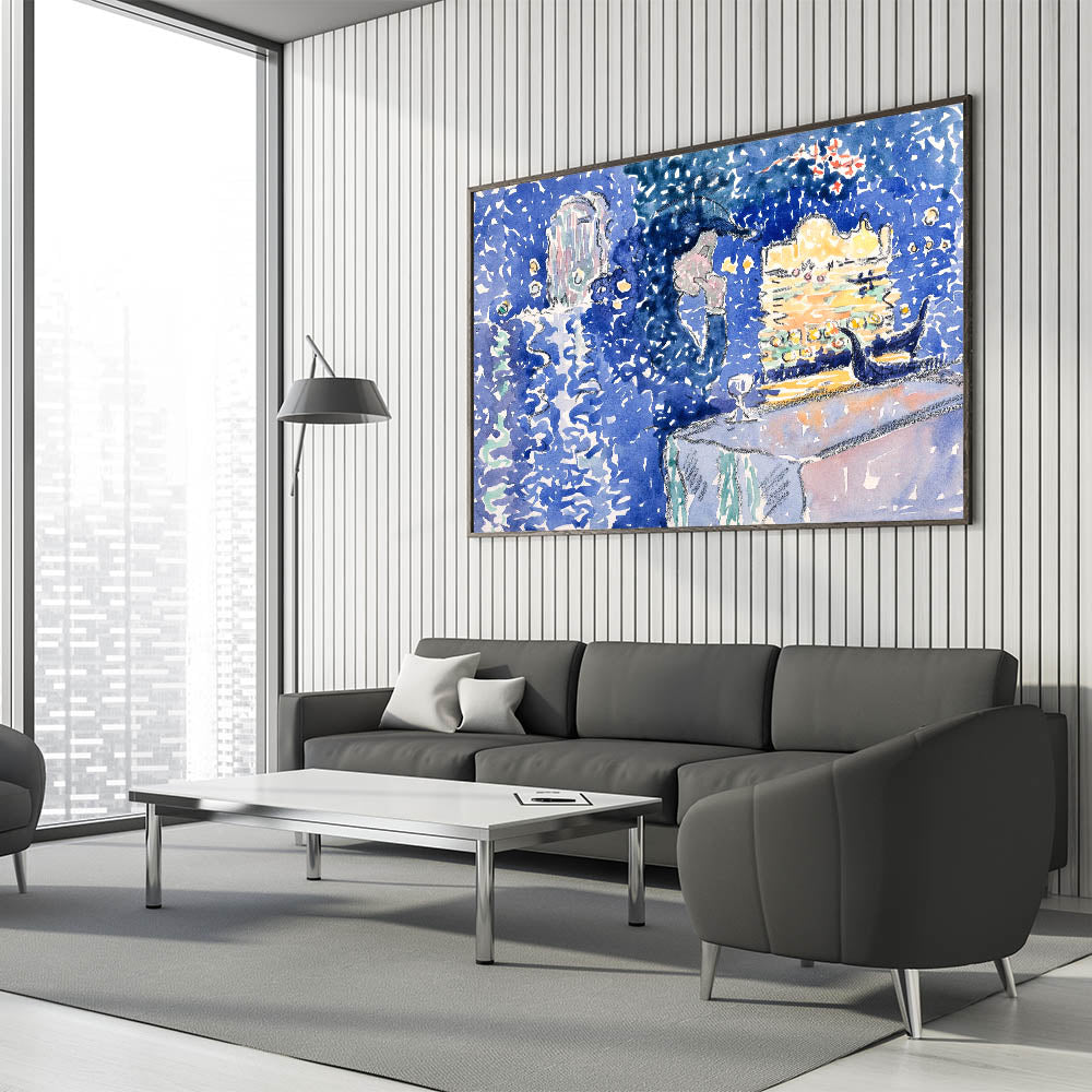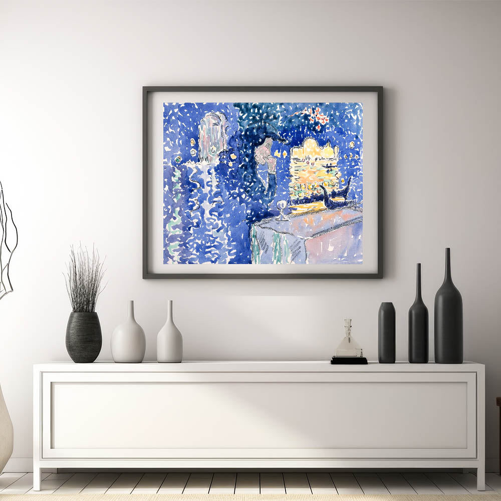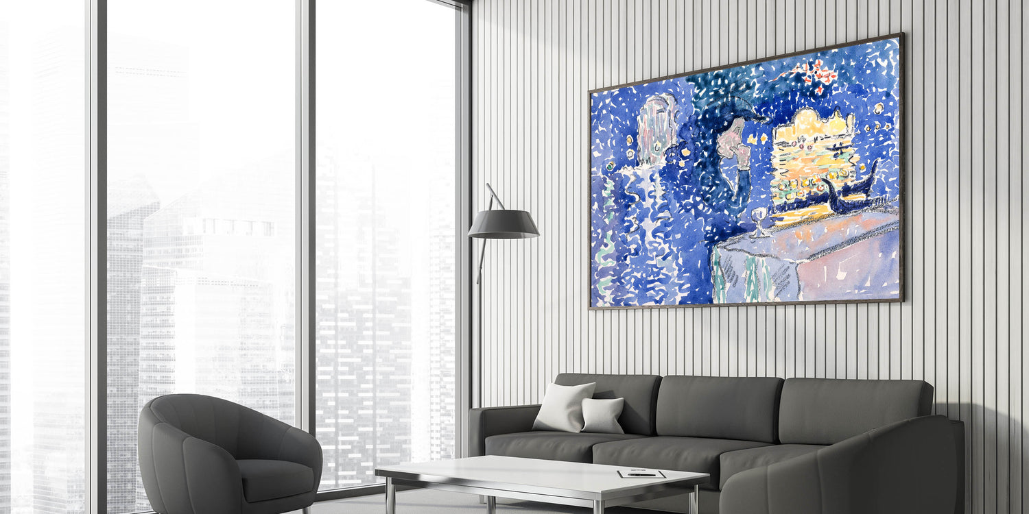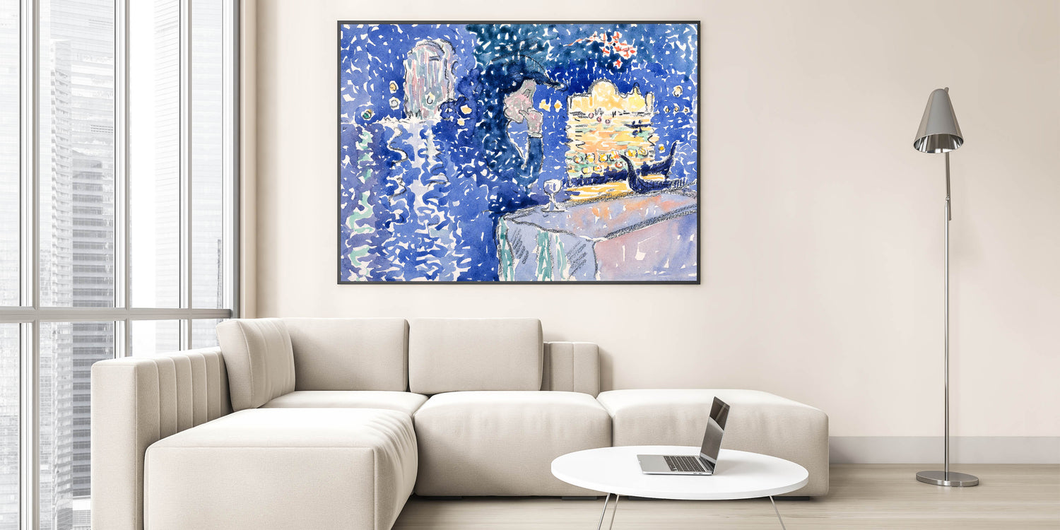 Illuminate your walls with the enchanting glow of this Venice Night Festival Impressionist wall art. Depicting the Festival of the Redeemer, this artwork captures the shimmering reflections of light on water, vibrant gondolas, and a magical evening sky. The rich palette of deep blues, soft lavender, and golden yellows brings a dreamlike quality to this piece, making it a true masterpiece of Impressionist style decor.
