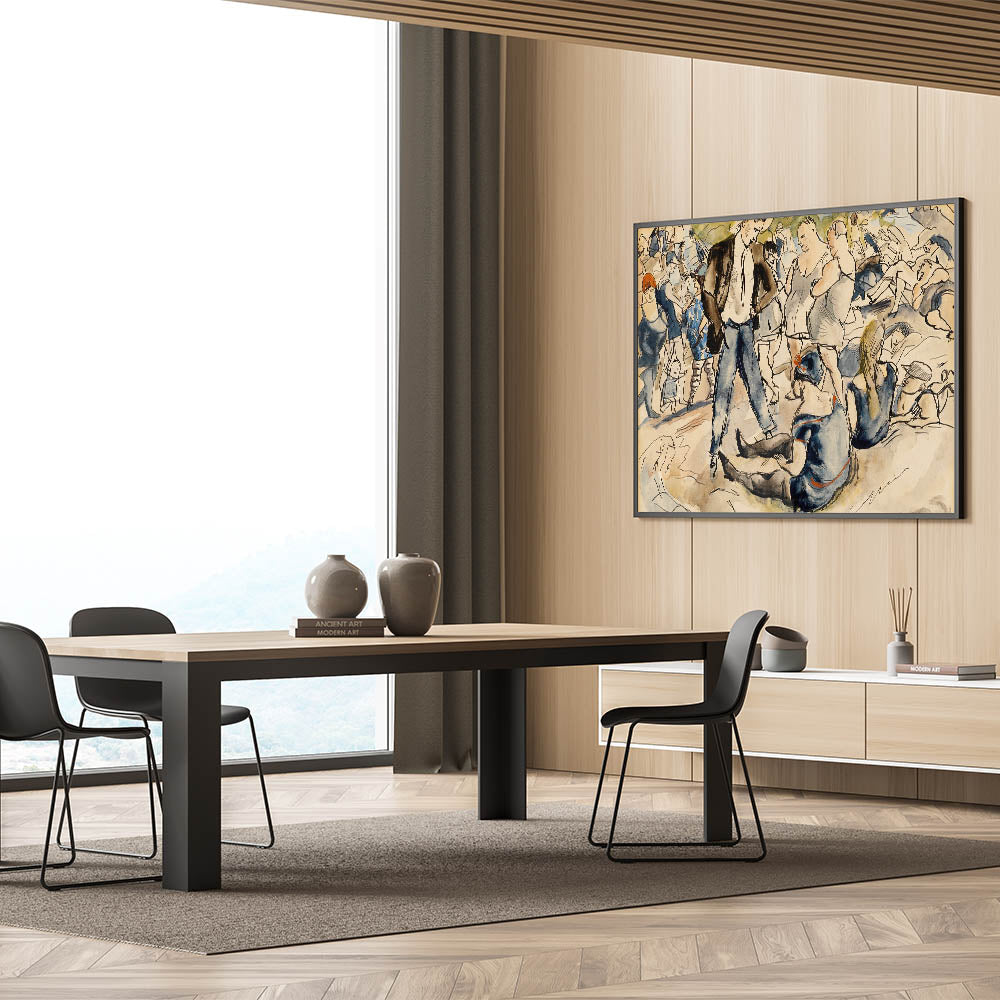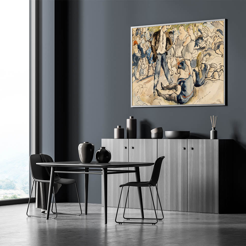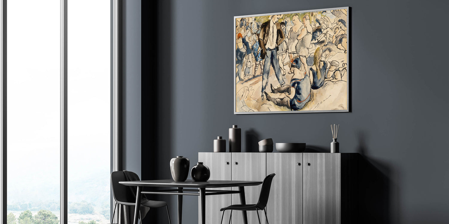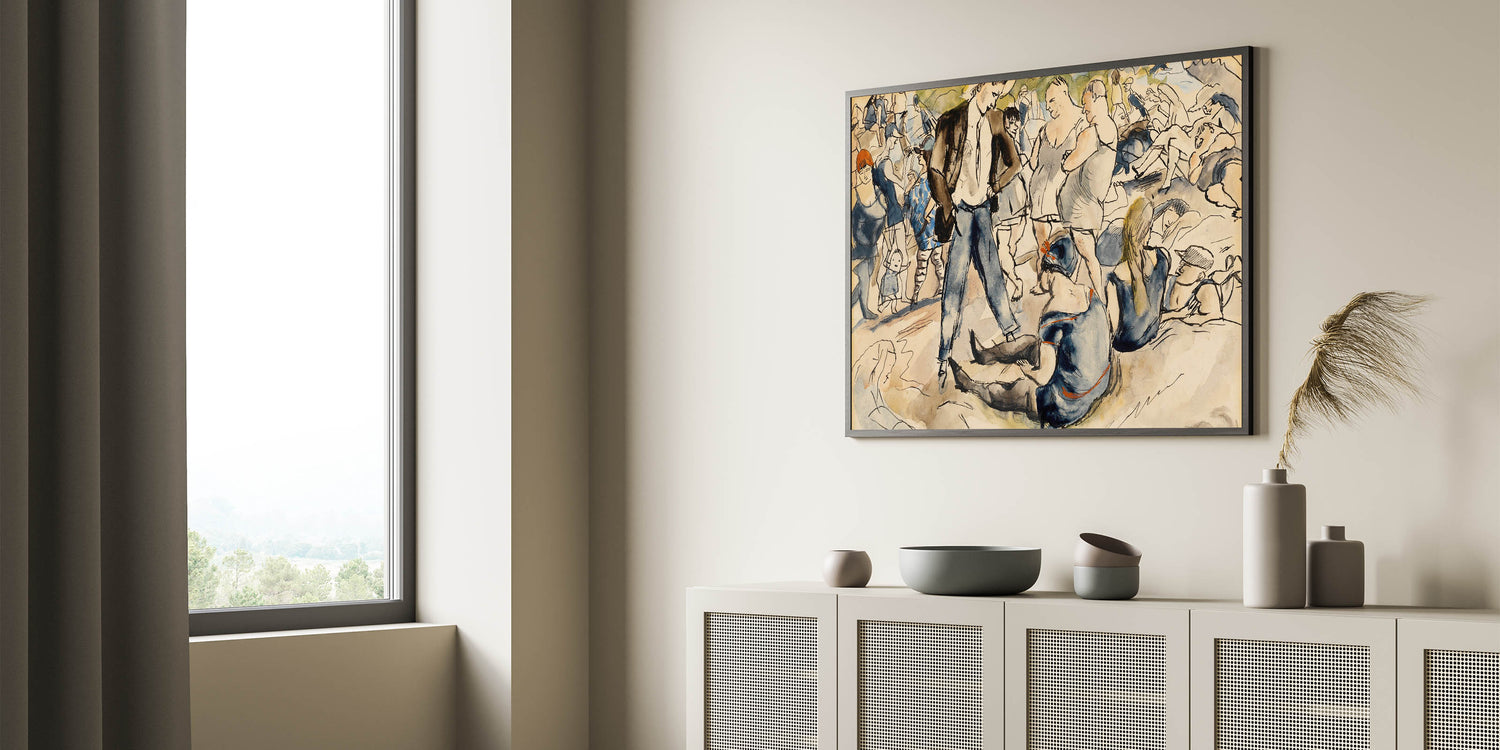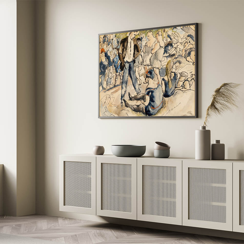 Bring the lively atmosphere of a beach gathering into your home with this modern art piece inspired by Coney Island. This artwork captures a bustling beach scene with expressive linework and watercolor splashes in blue, beige, and warm tones. Ideal for those seeking unique and vibrant wall decor that reflects the energy of social scenes, this piece is perfect for modern and eclectic spaces.