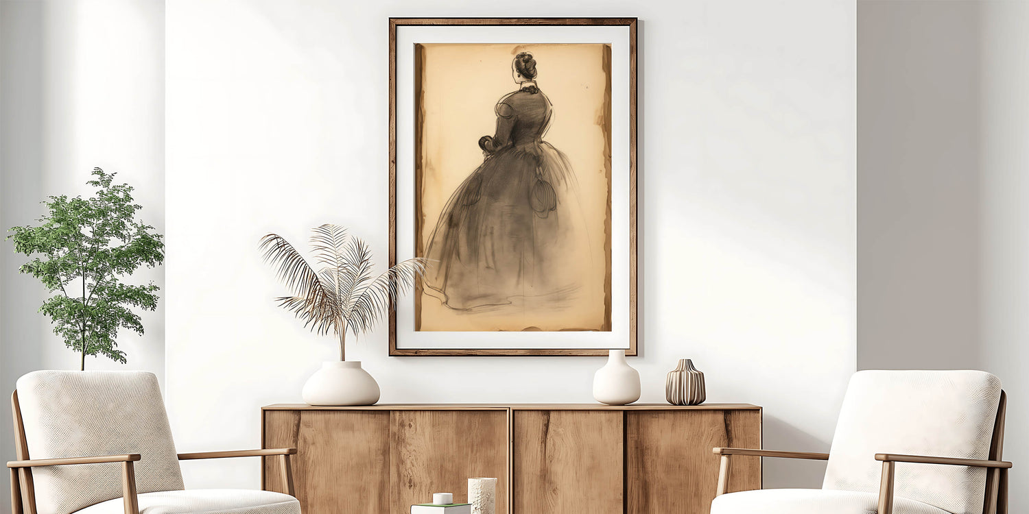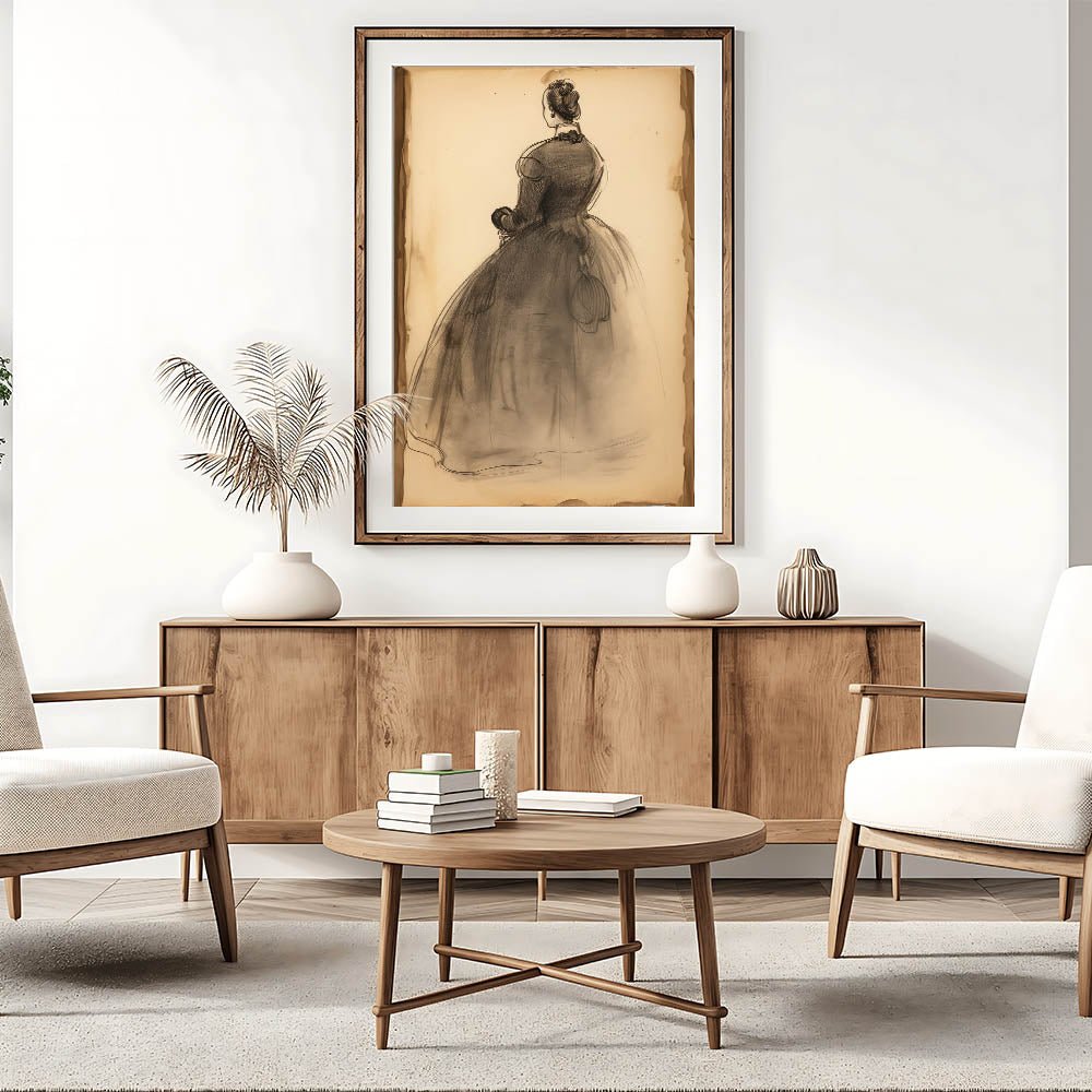 This vintage portrait art beautifully captures the elegance of the Victorian era with a hand-drawn charcoal sketch. Featuring a graceful woman in a flowing gown, this antique portrait print evokes nostalgia and timeless charm. The delicate strokes and subtle shading make it a stunning addition to any space inspired by historic portrait decor.